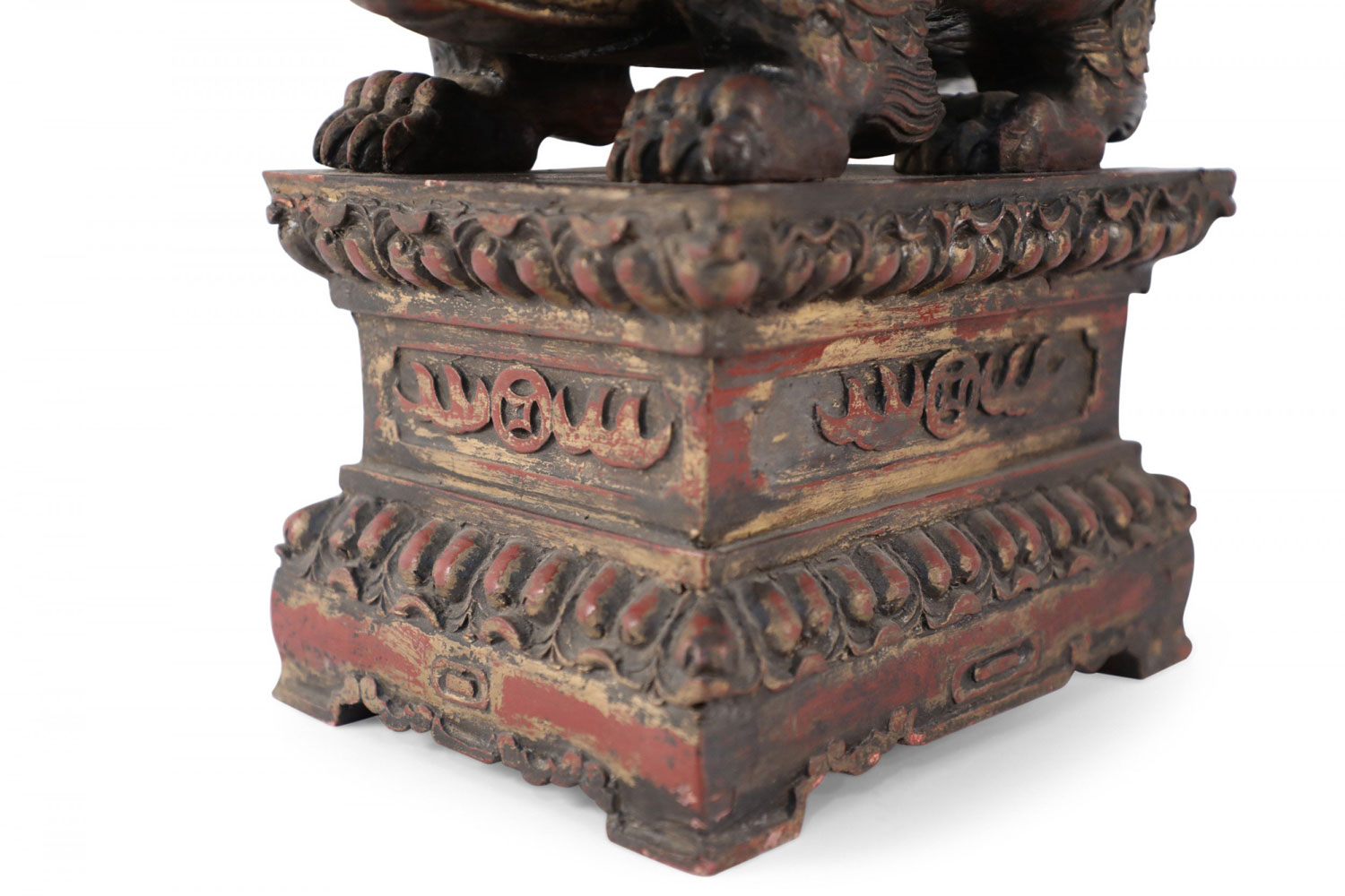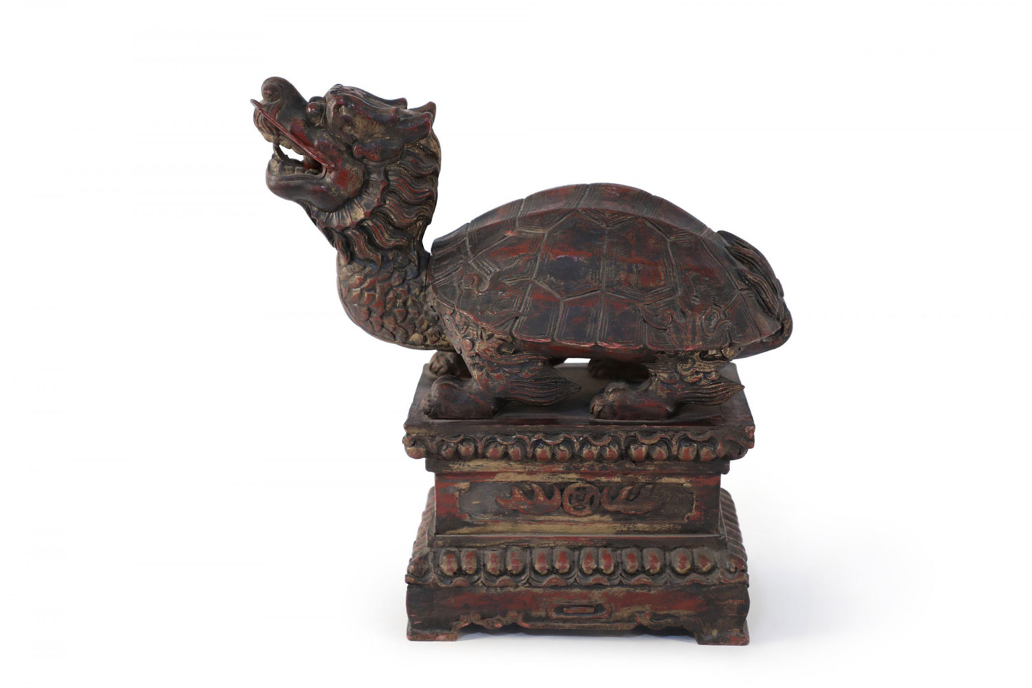 Antique Chinese carved wooden sculpture of a Longgui or (dragon turtle) holding a coin in its mouth on an ornately carved wooden base..