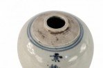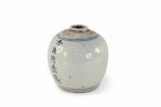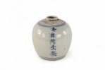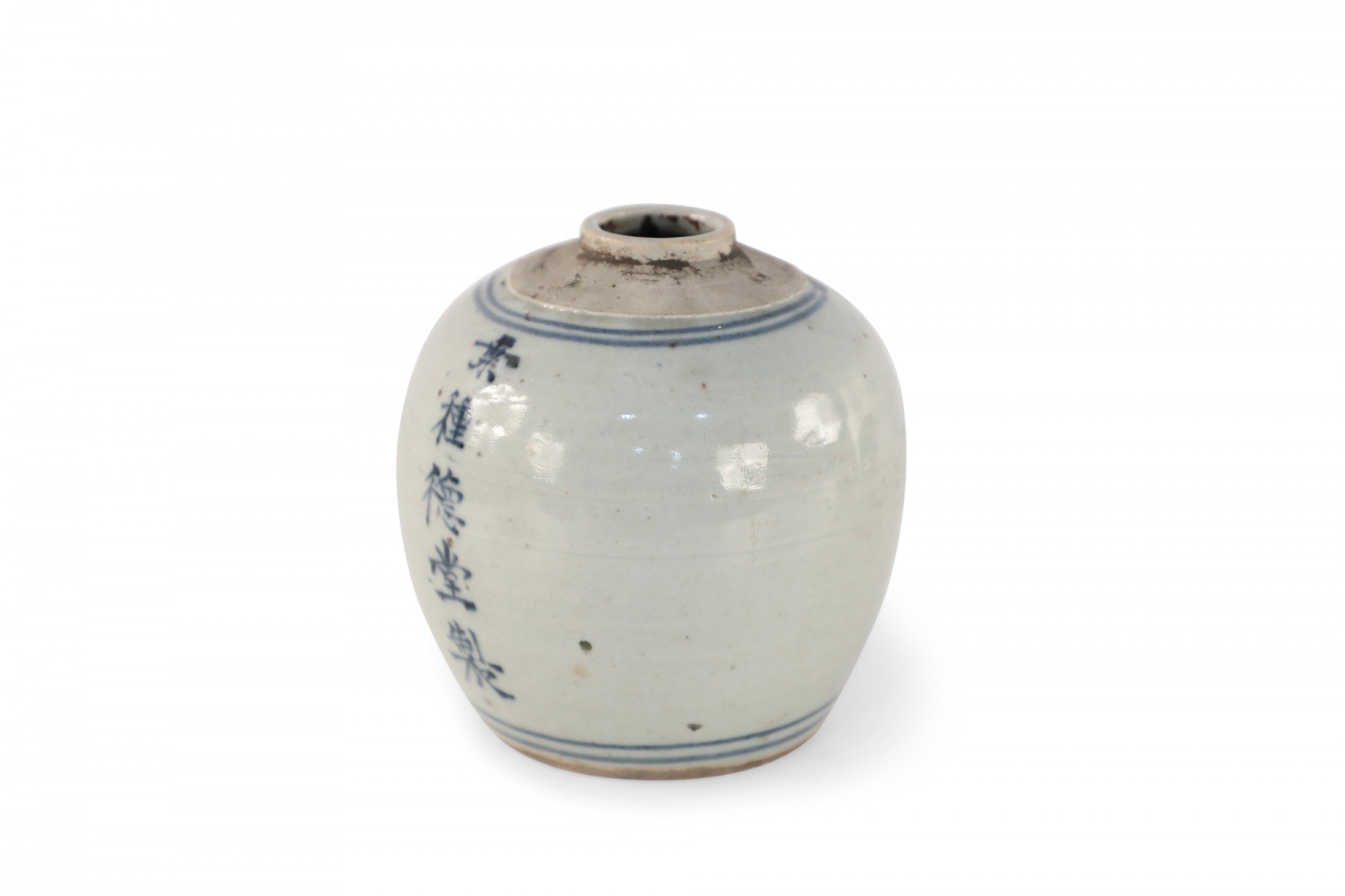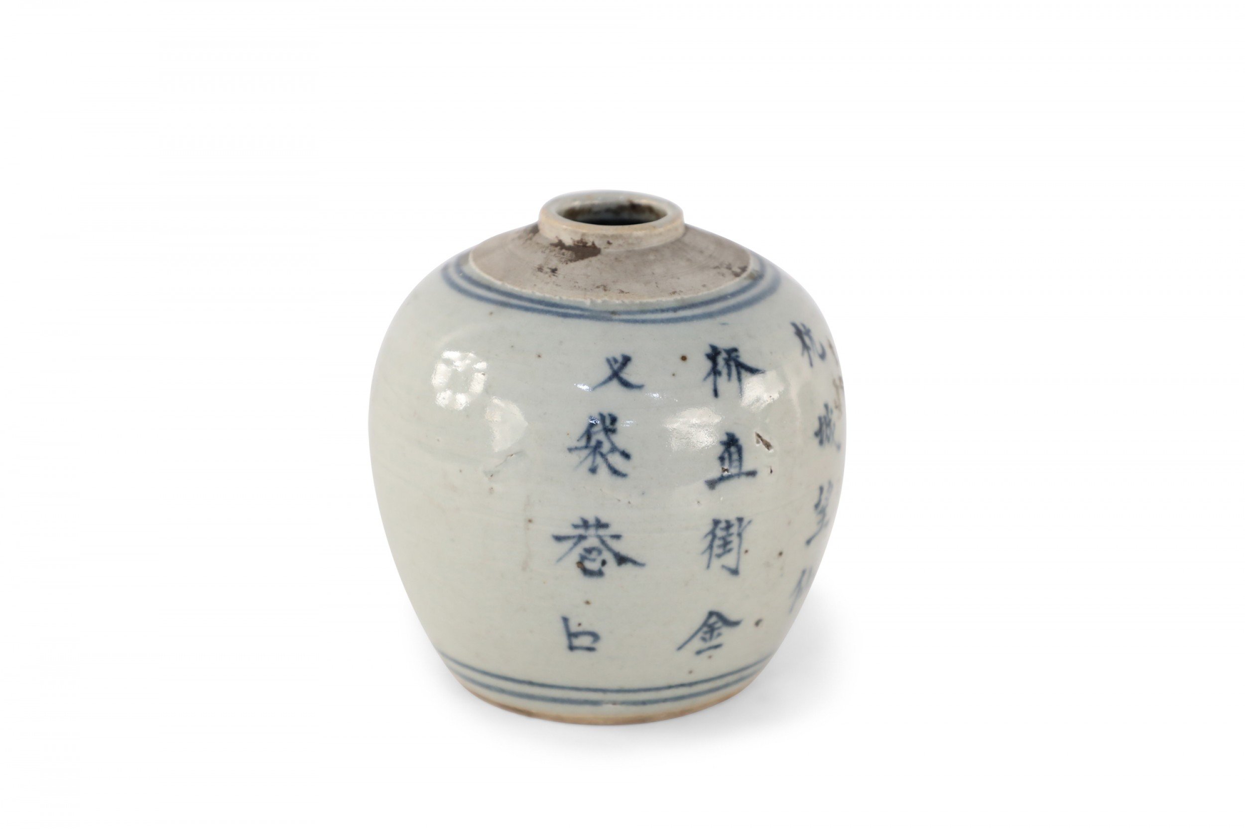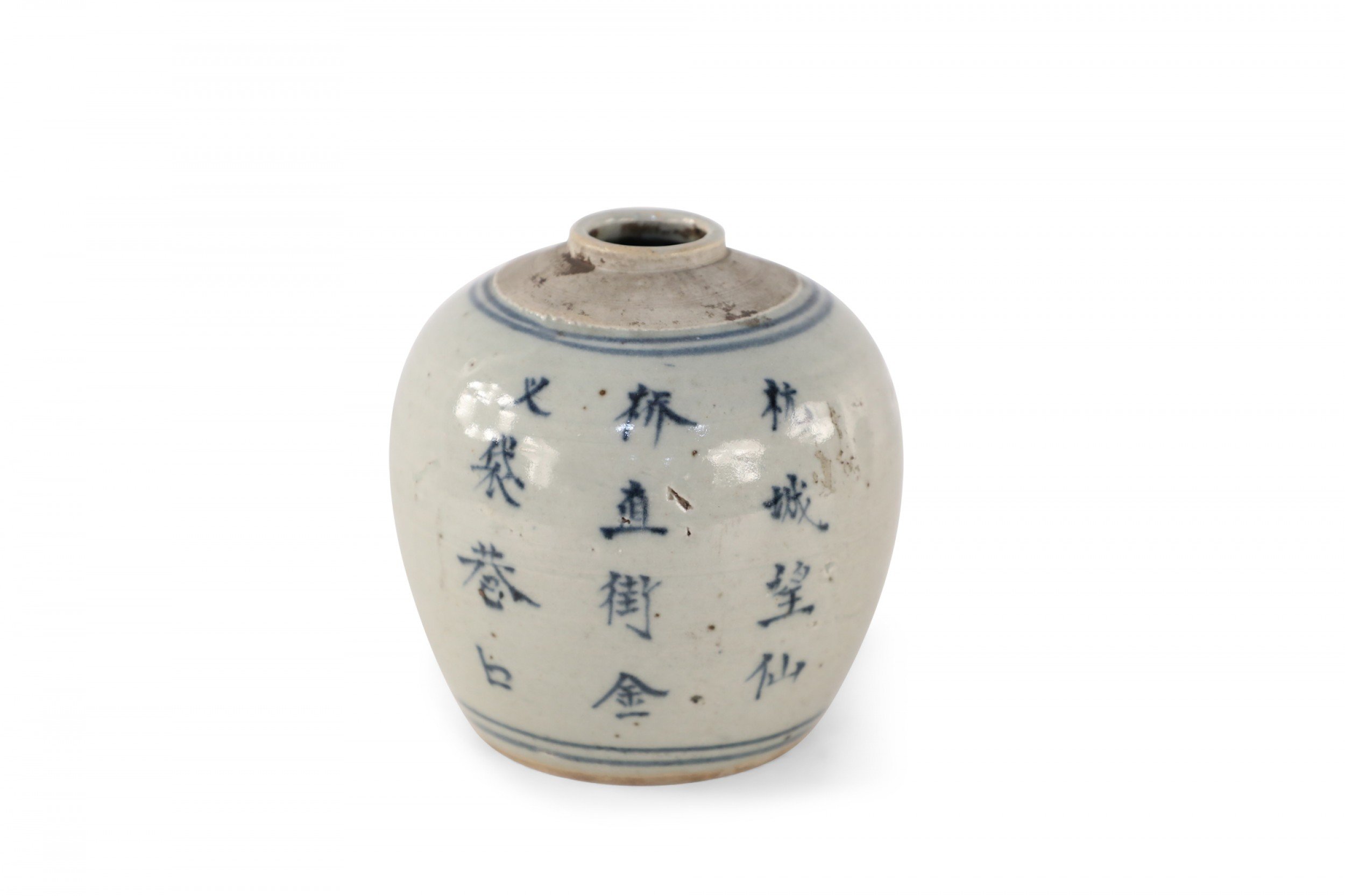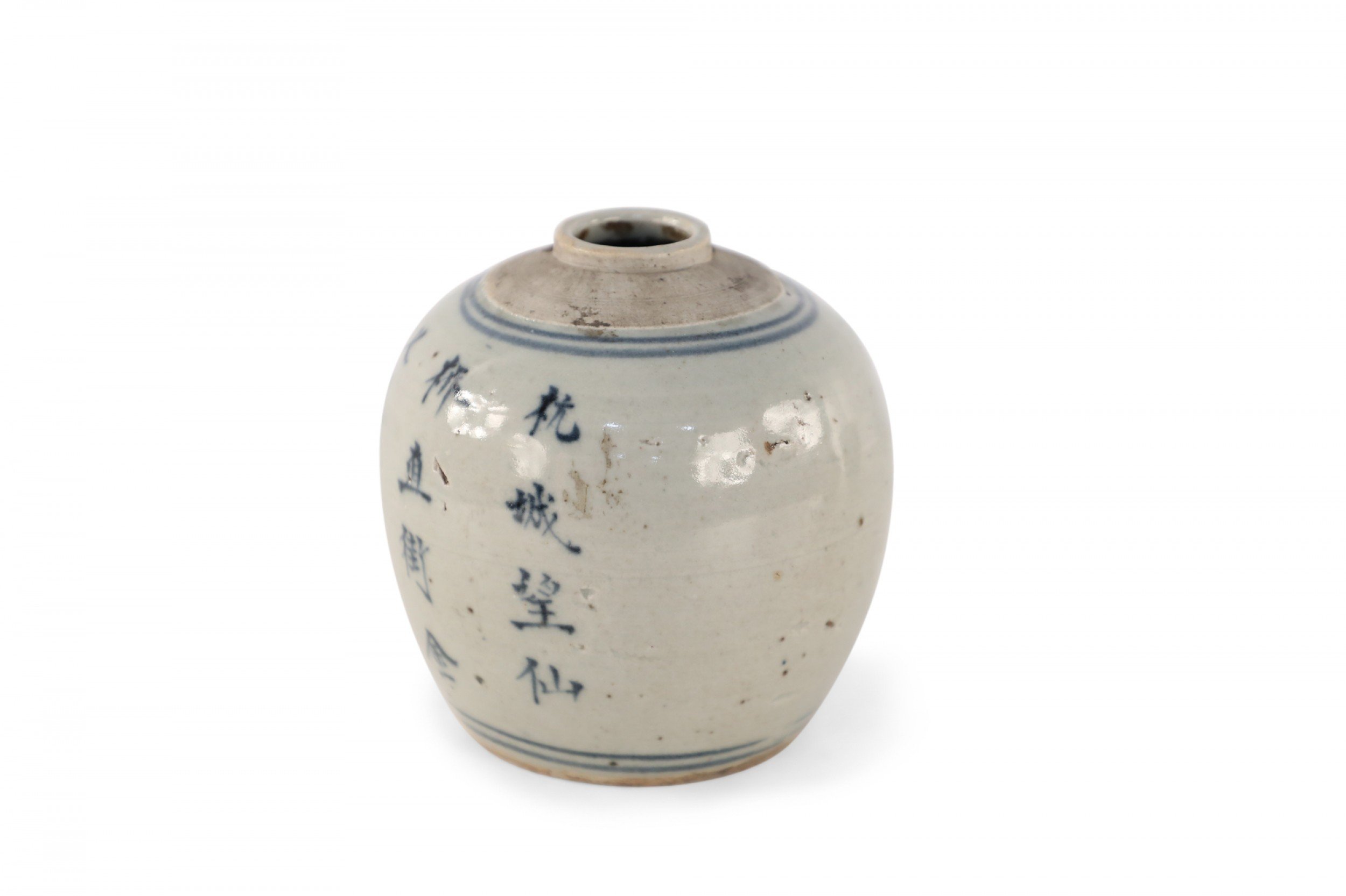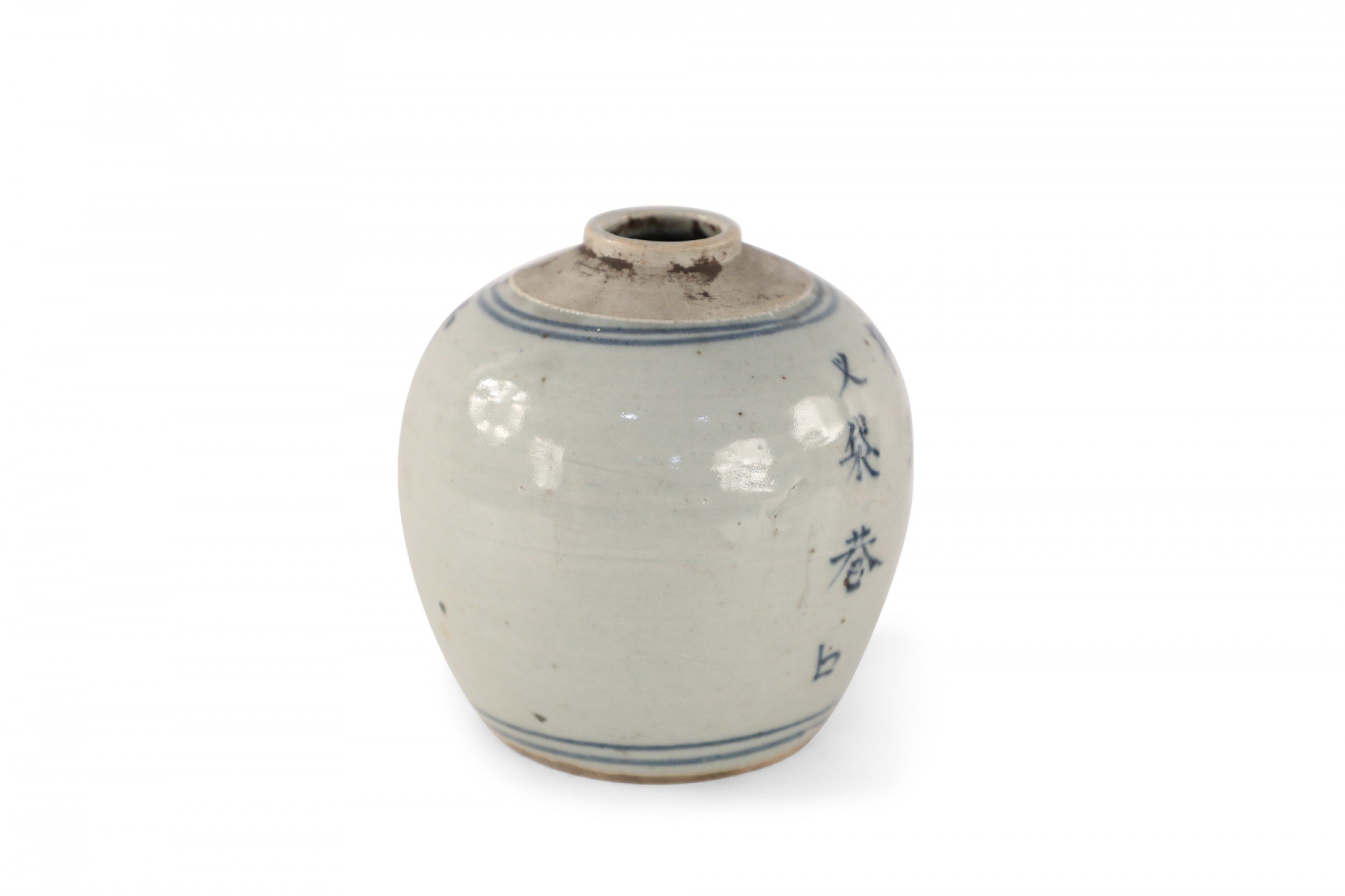 Antique Chinese (Early 20th Century) small, earthenware jar with blue characters running down the center framed by thin stripes circling the top and base.