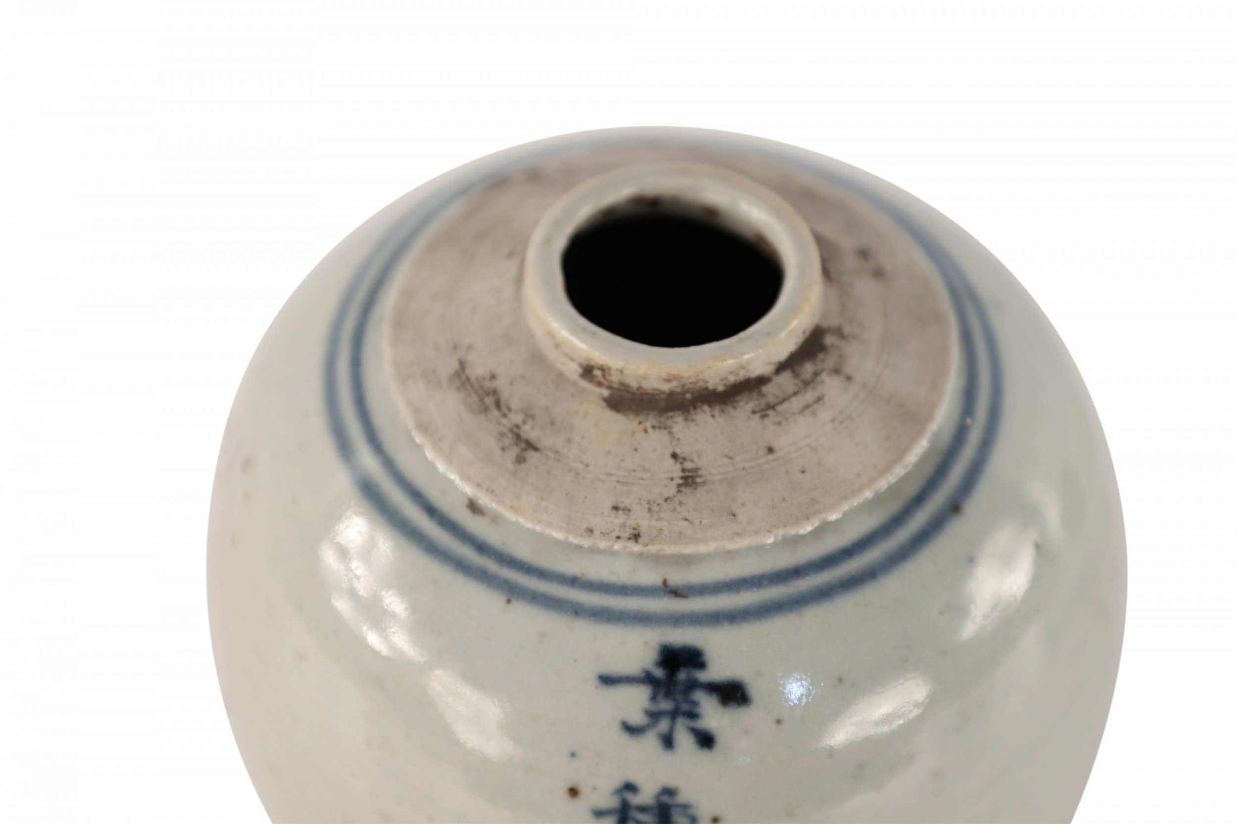 Antique Chinese (Early 20th Century) small, earthenware jar with blue characters running down the center framed by thin stripes circling the top and base..