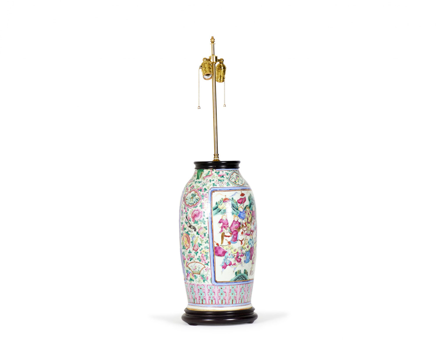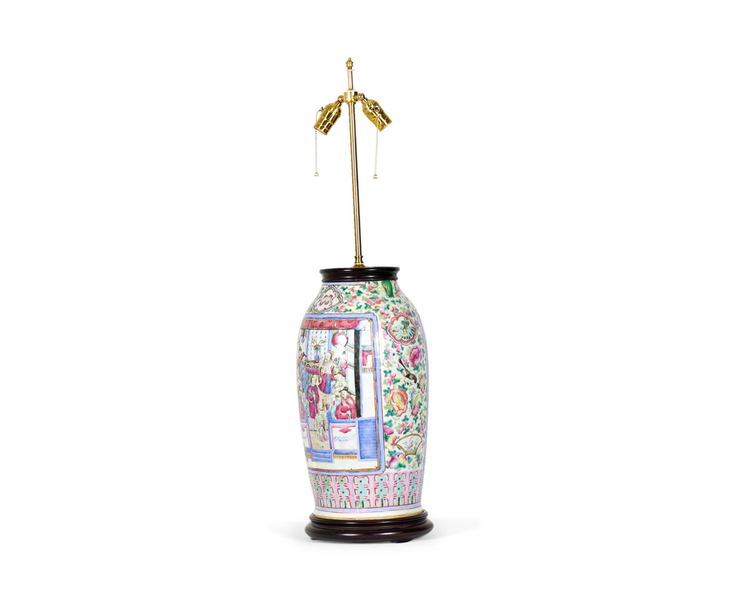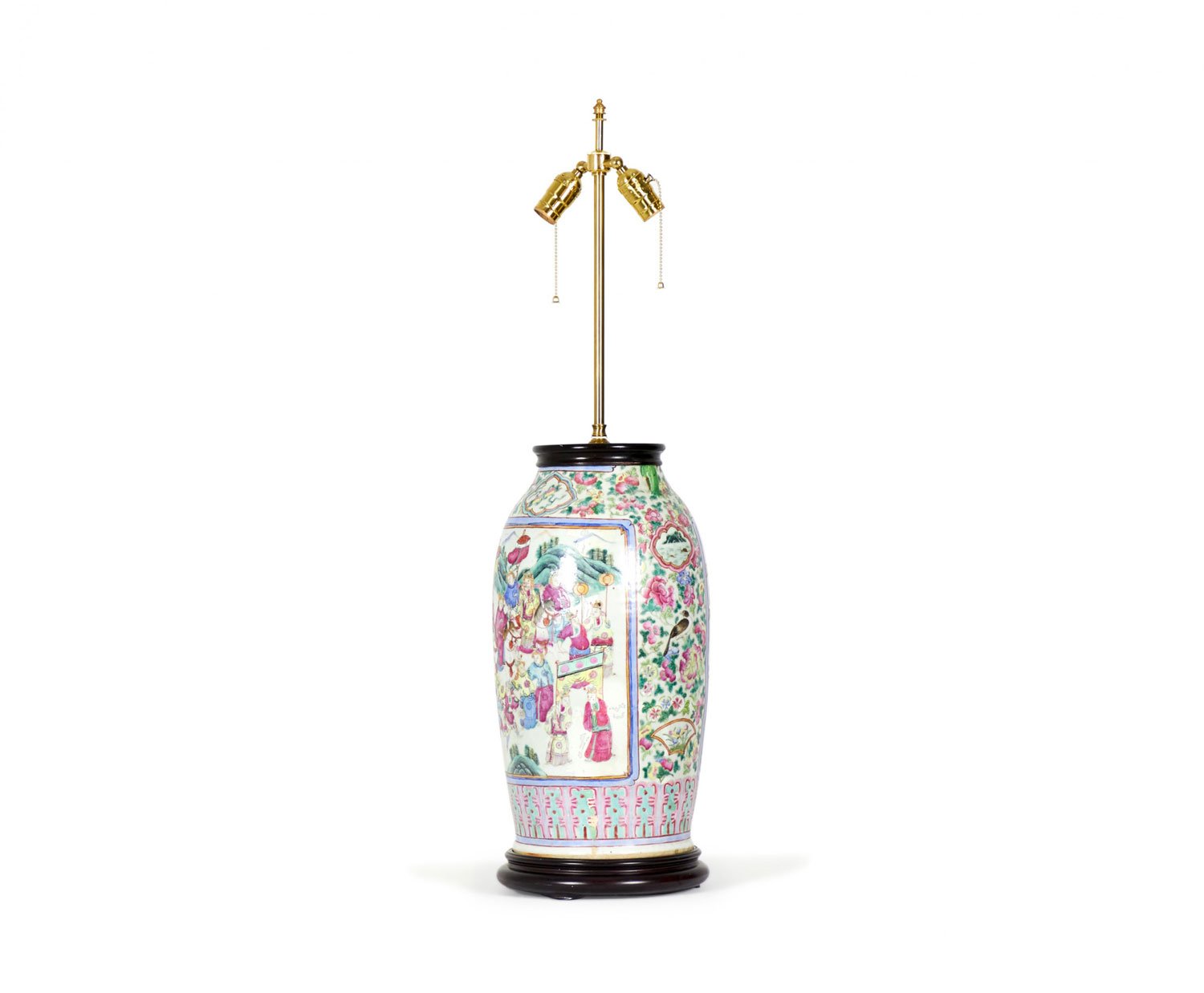 Antique Chinese table lamp made from an 18th century porcelain vase mounted with wood and brass hardware as a lamp, with a famille rose intricate design in blue, pink, purple, and green. (Similar lamp: NWL2721)
