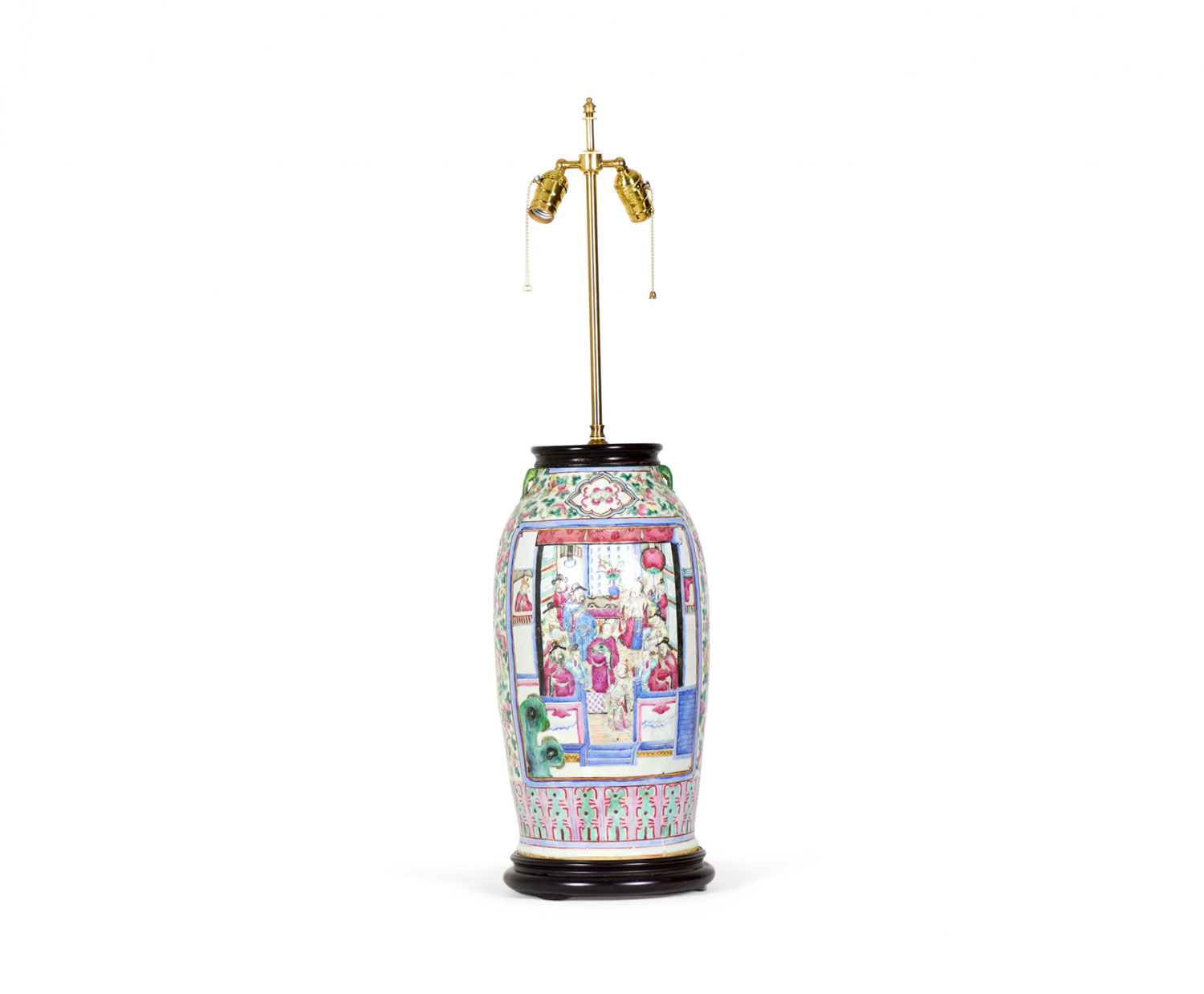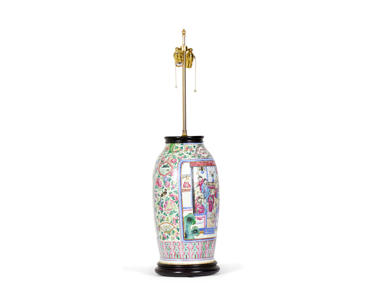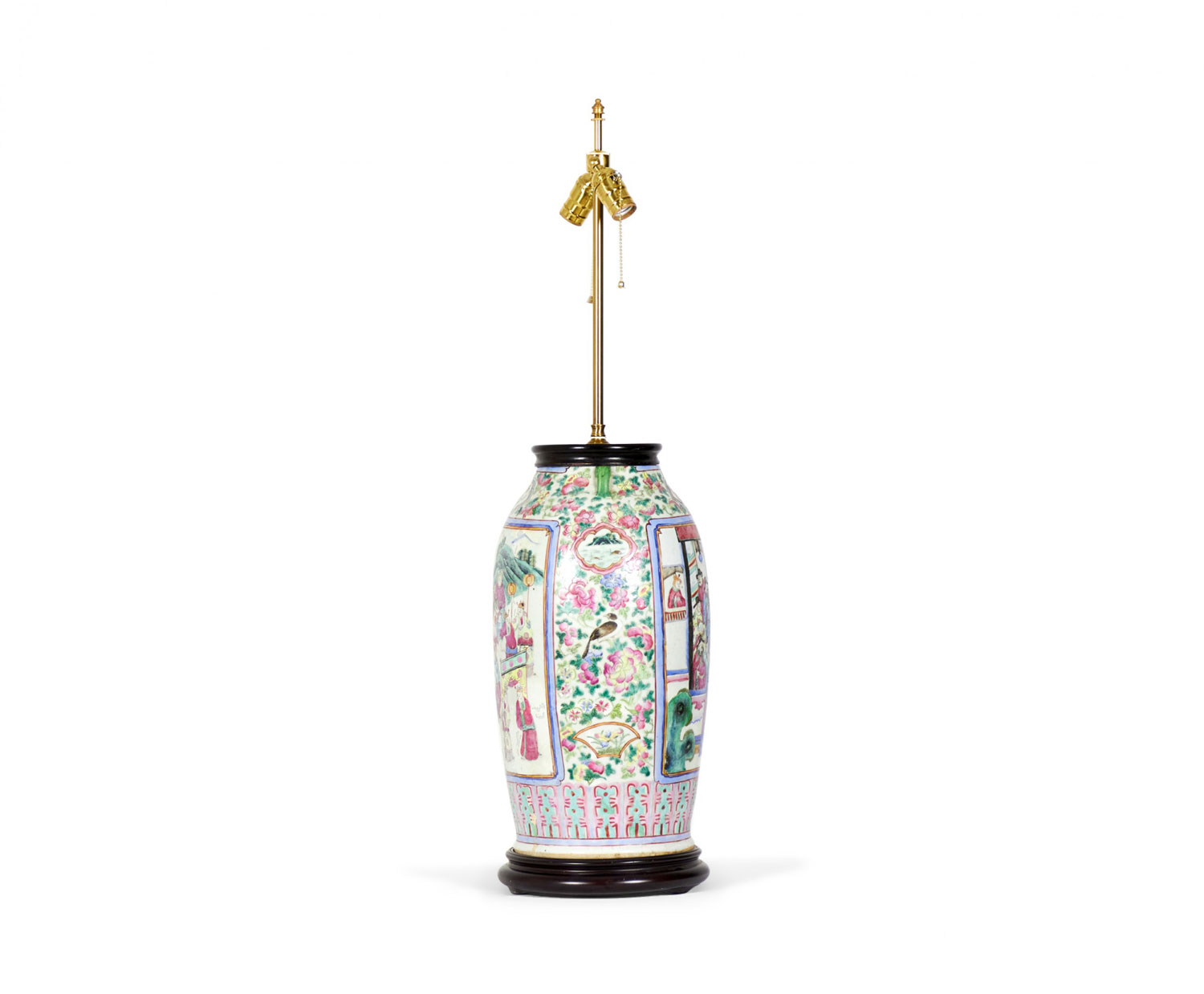 Antique Chinese table lamp made from an 18th century porcelain vase mounted with wood and brass hardware as a lamp, with a famille rose intricate design in blue, pink, purple, and green. (Similar lamp: NWL2721)