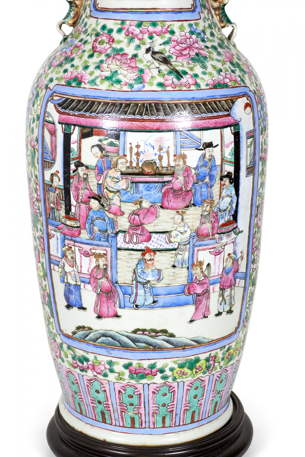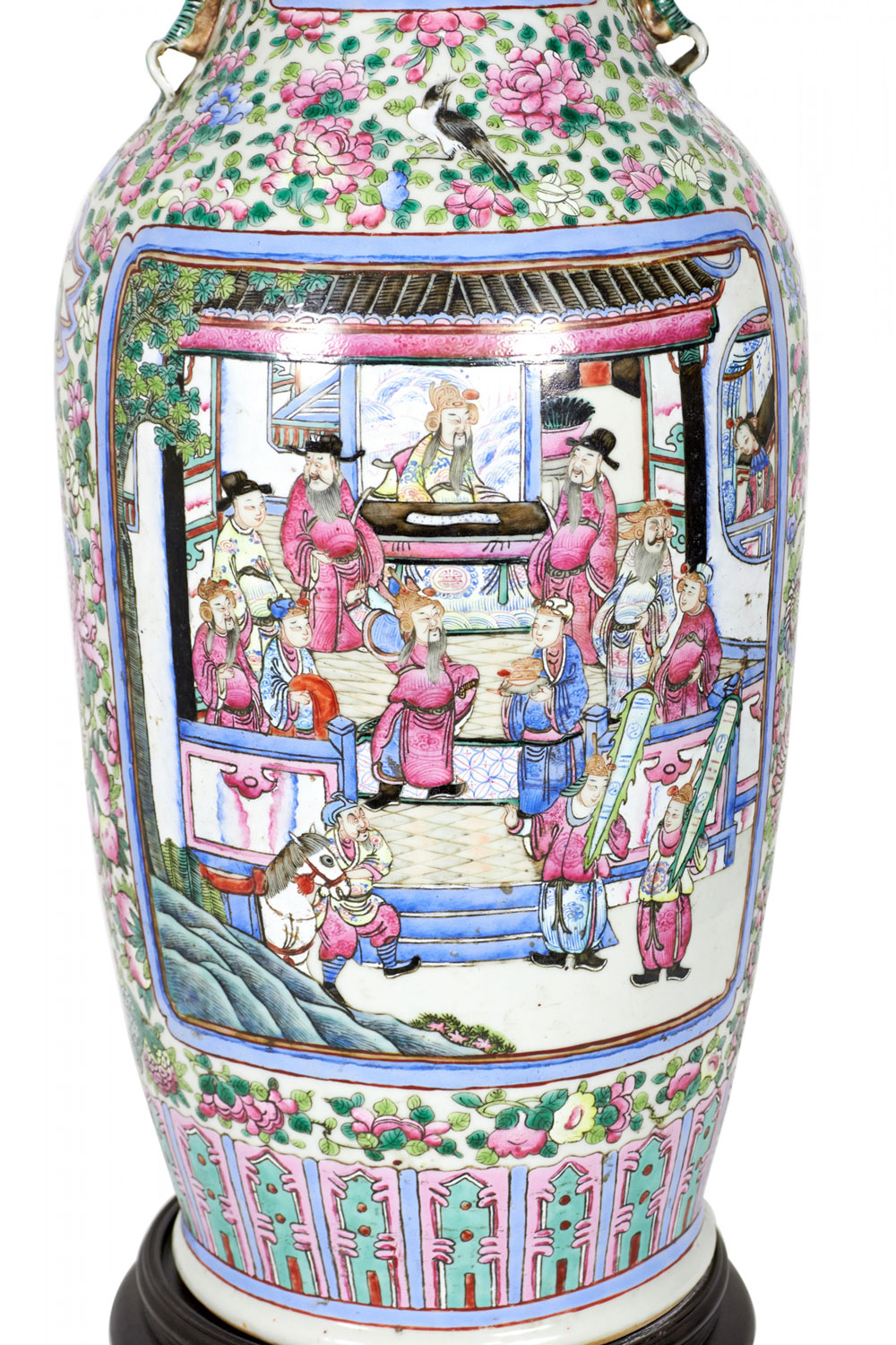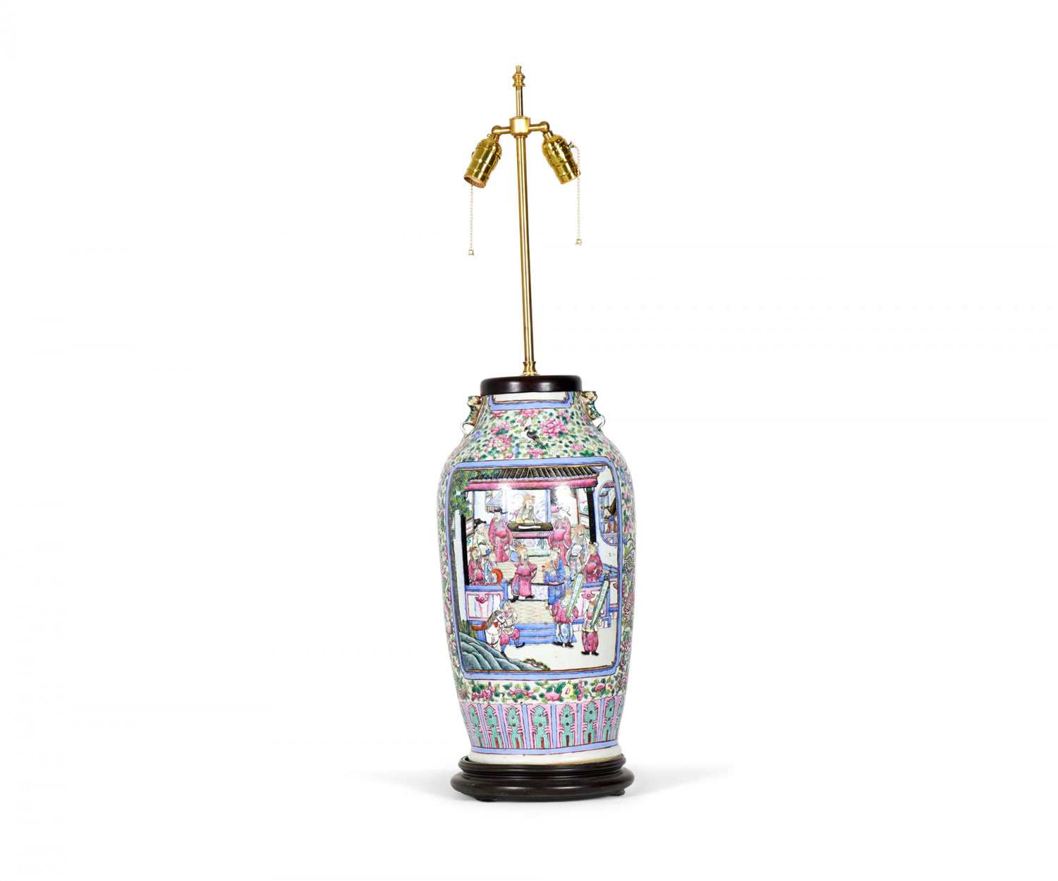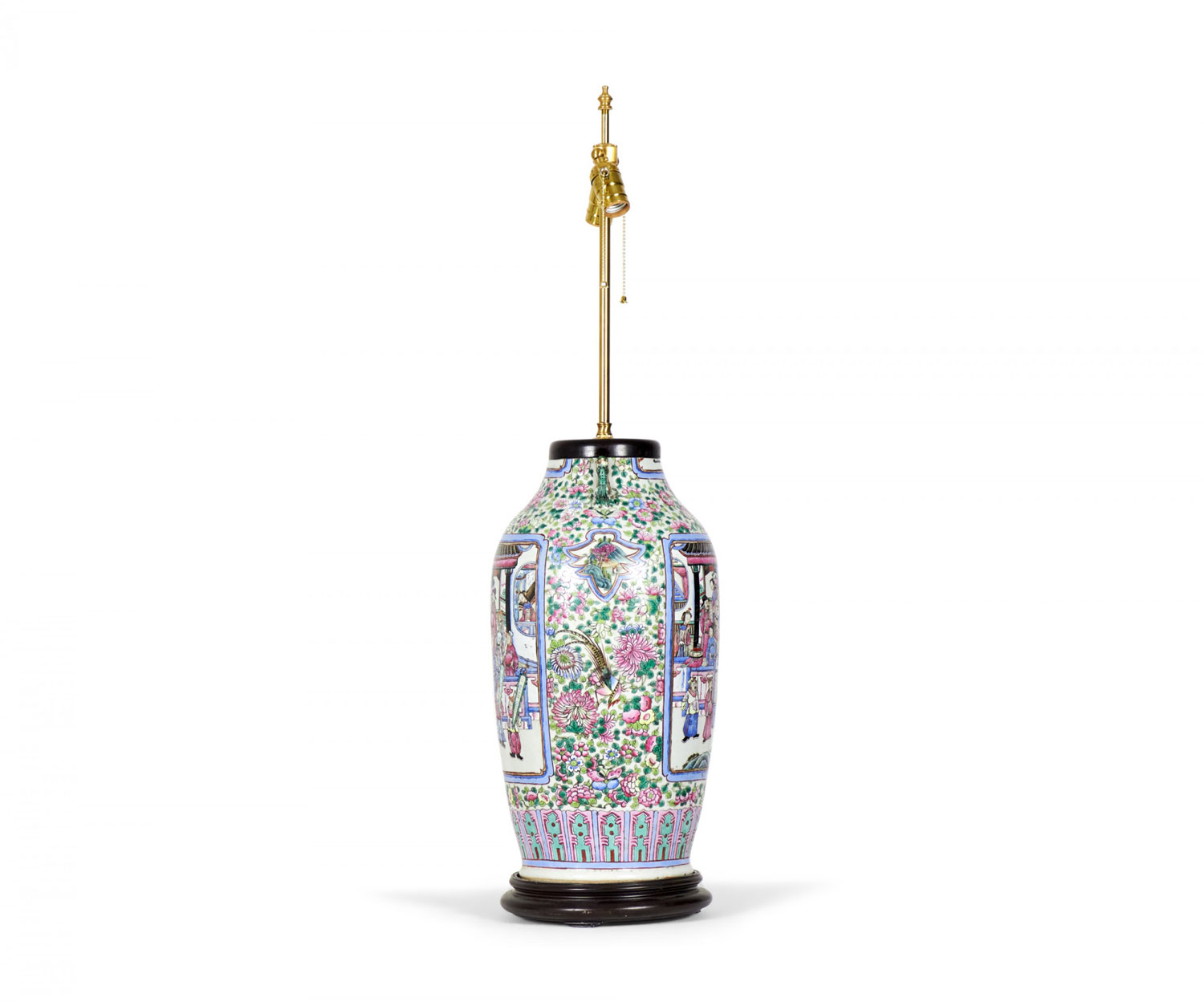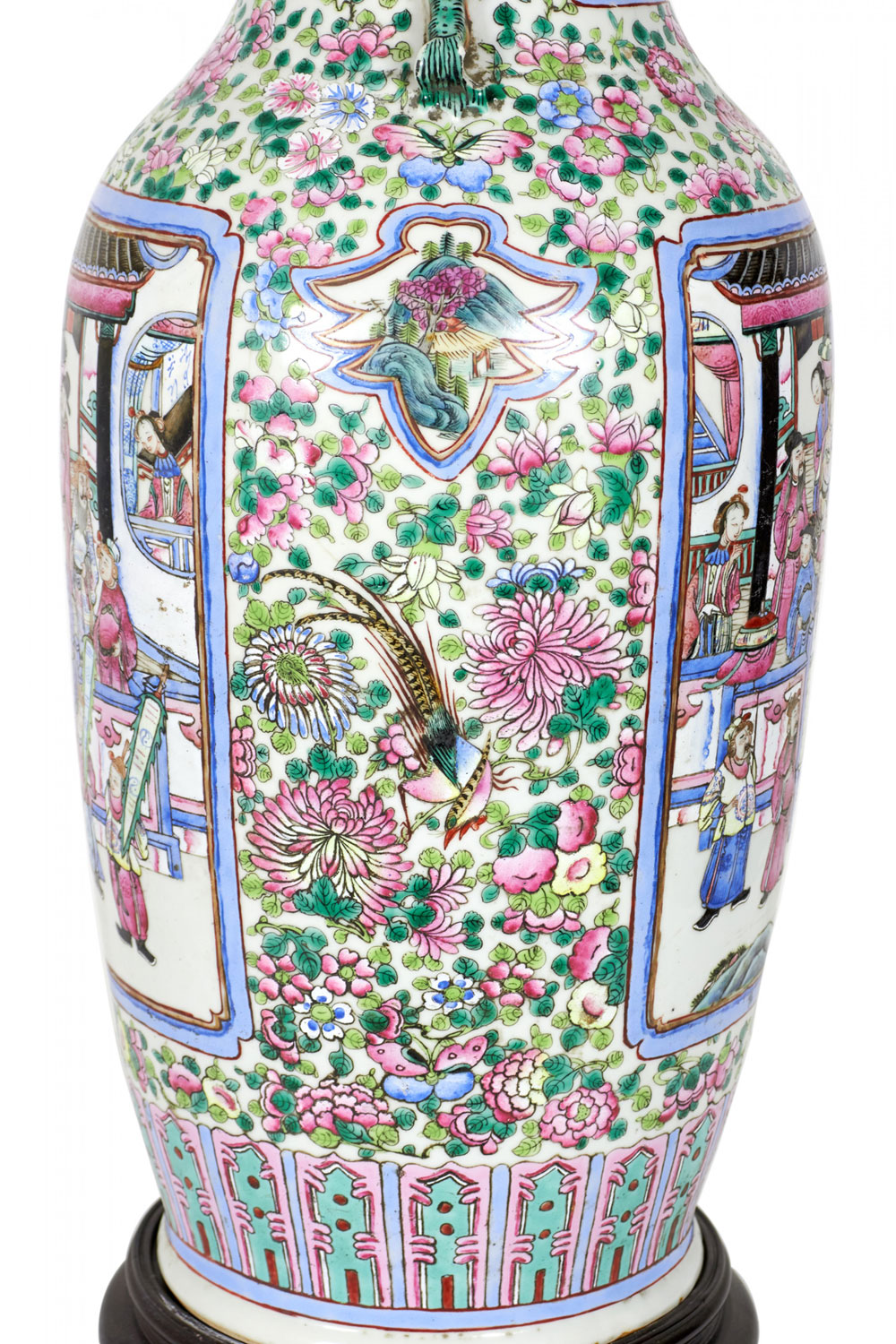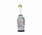 Antique Chinese table lamp made from an 18th century porcelain vase mounted with wood and brass hardware as a lamp, with a famille rose intricate design in blue, pink, purple, and green. (Similar lamp: NWL2711).