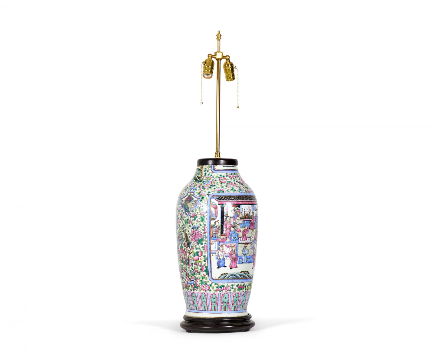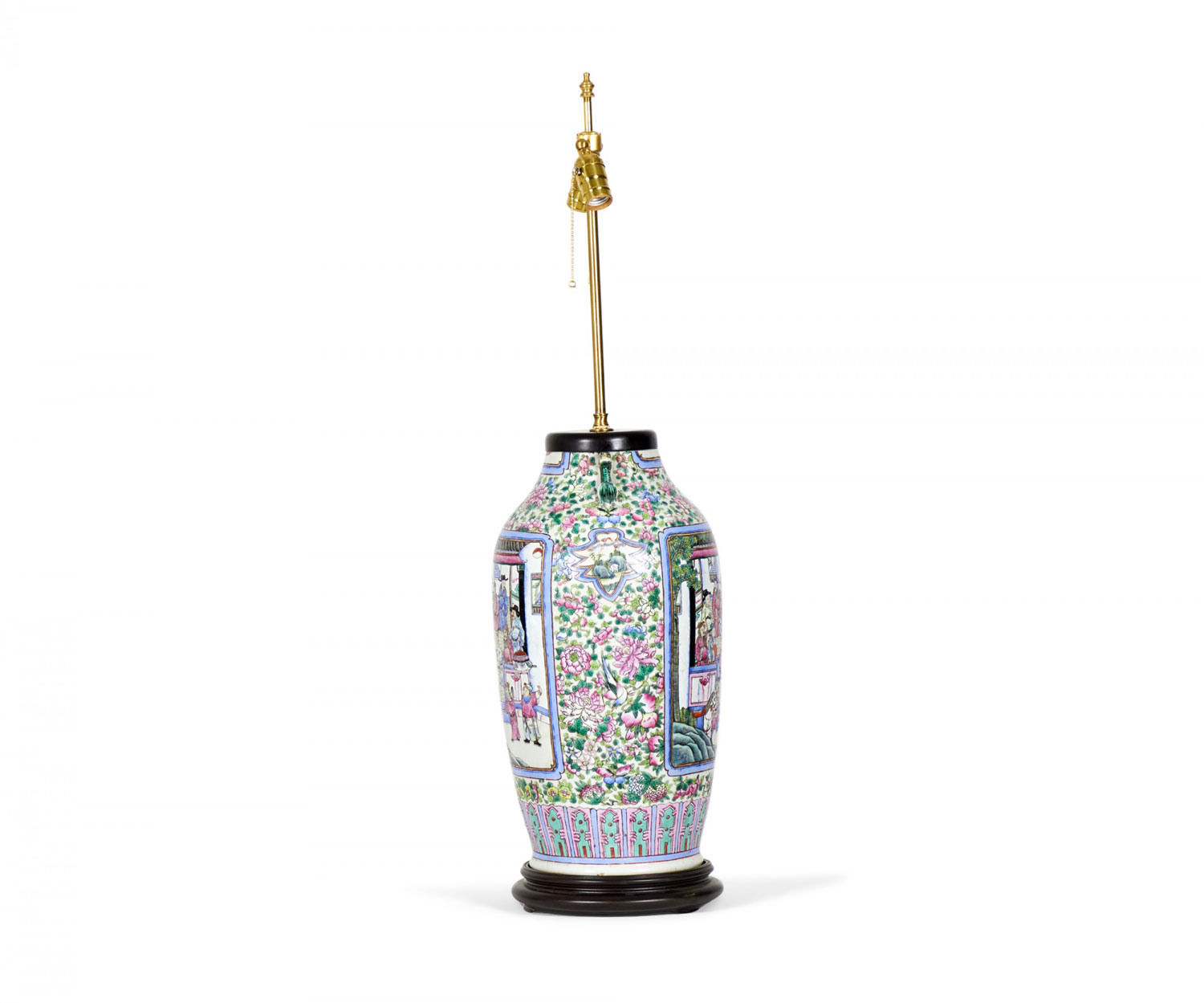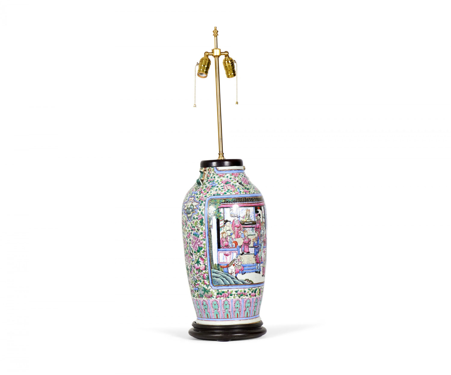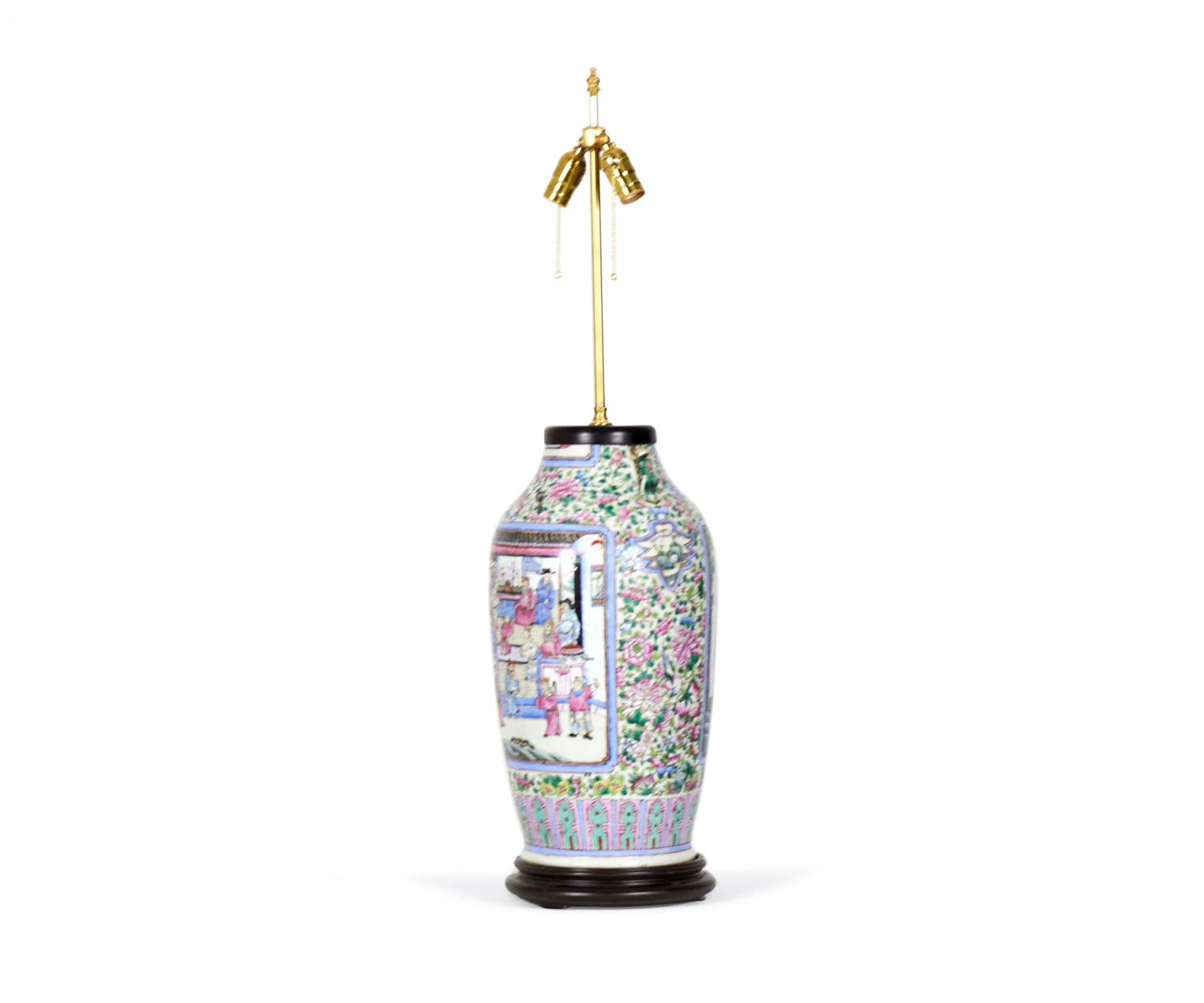 Antique Chinese table lamp made from an 18th century porcelain vase mounted with wood and brass hardware as a lamp, with a famille rose intricate design in blue, pink, purple, and green. (Similar lamp: NWL2711)