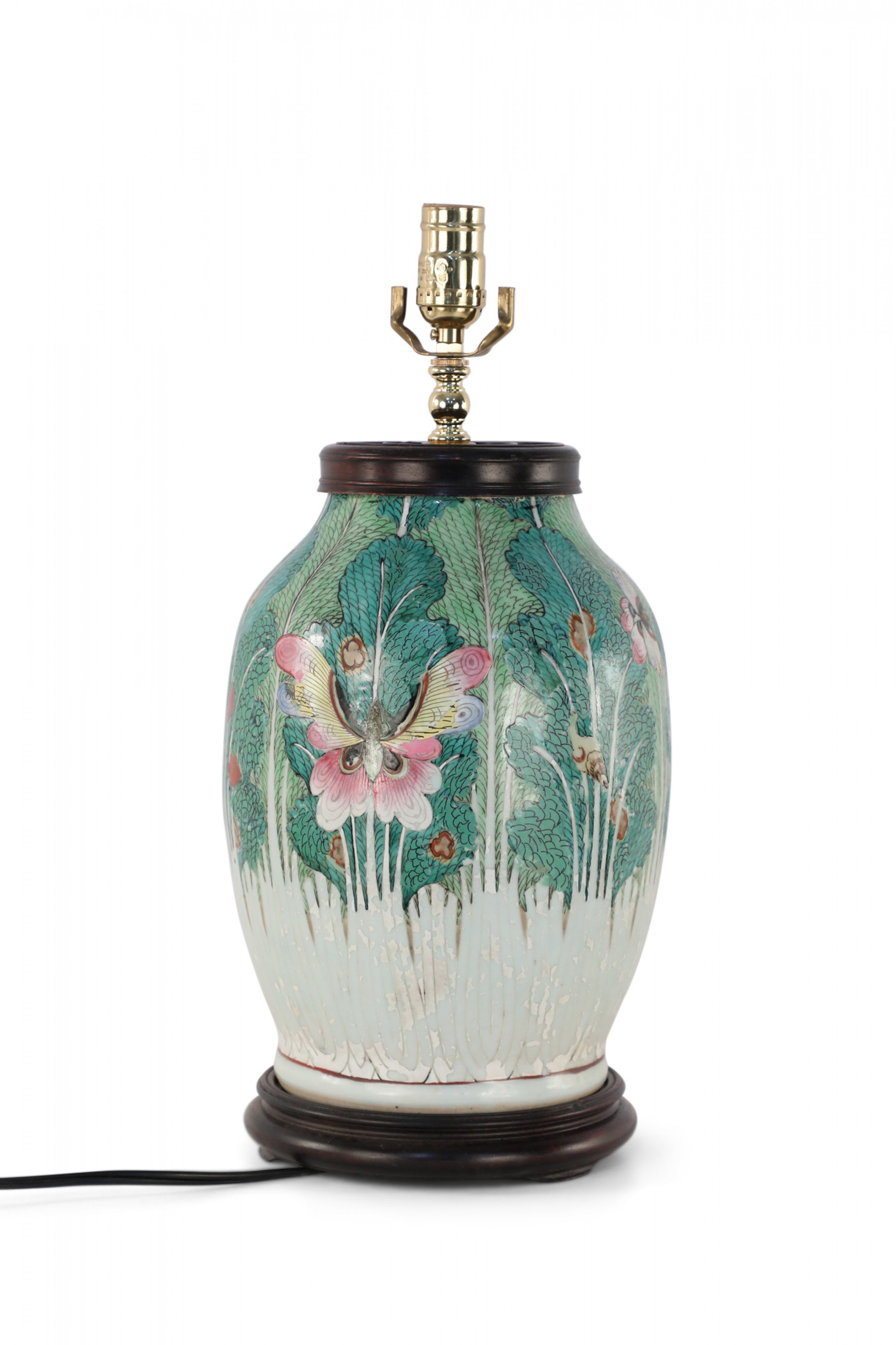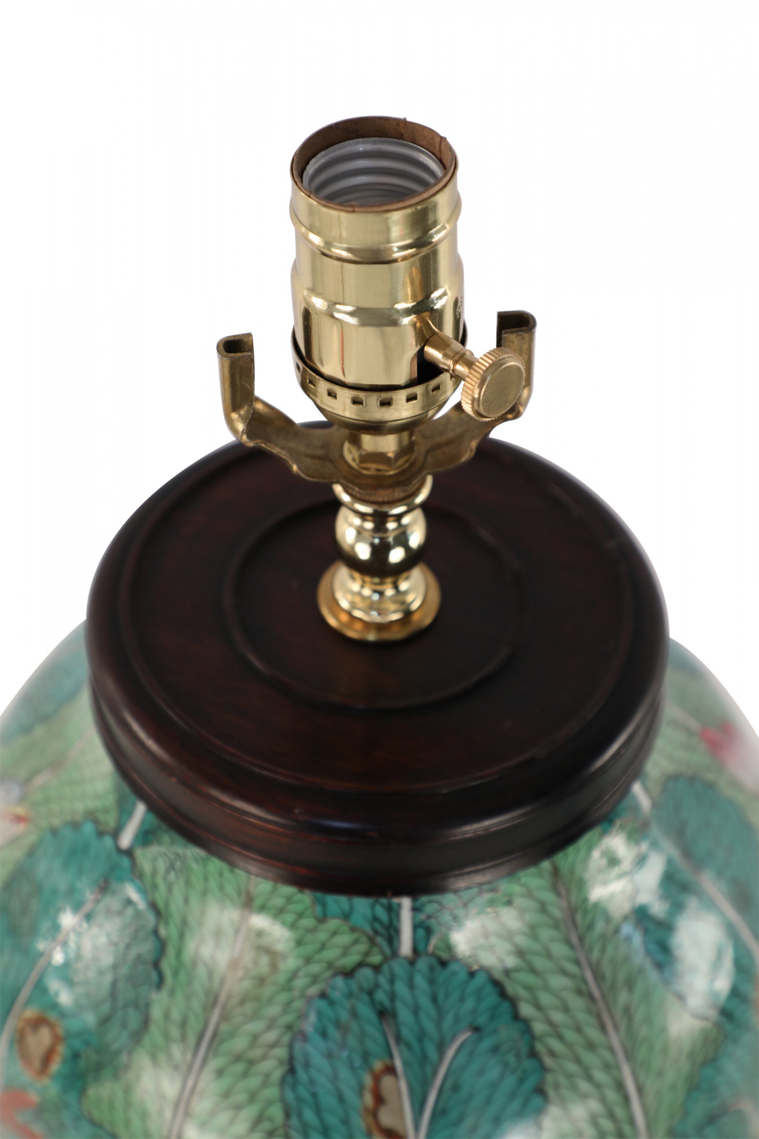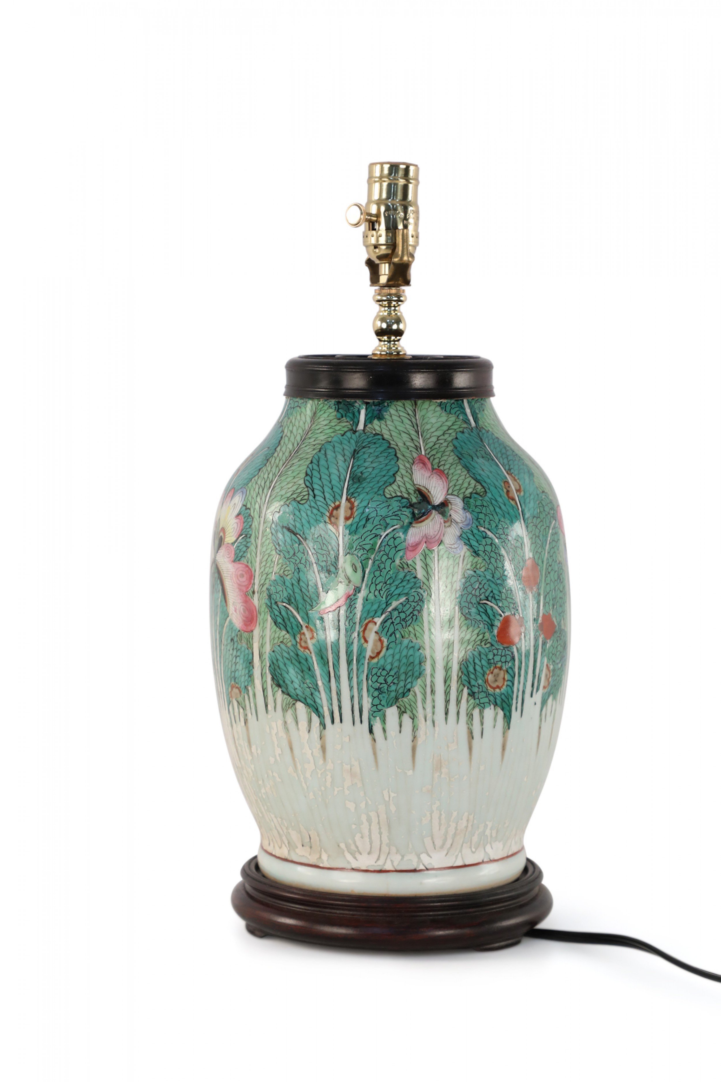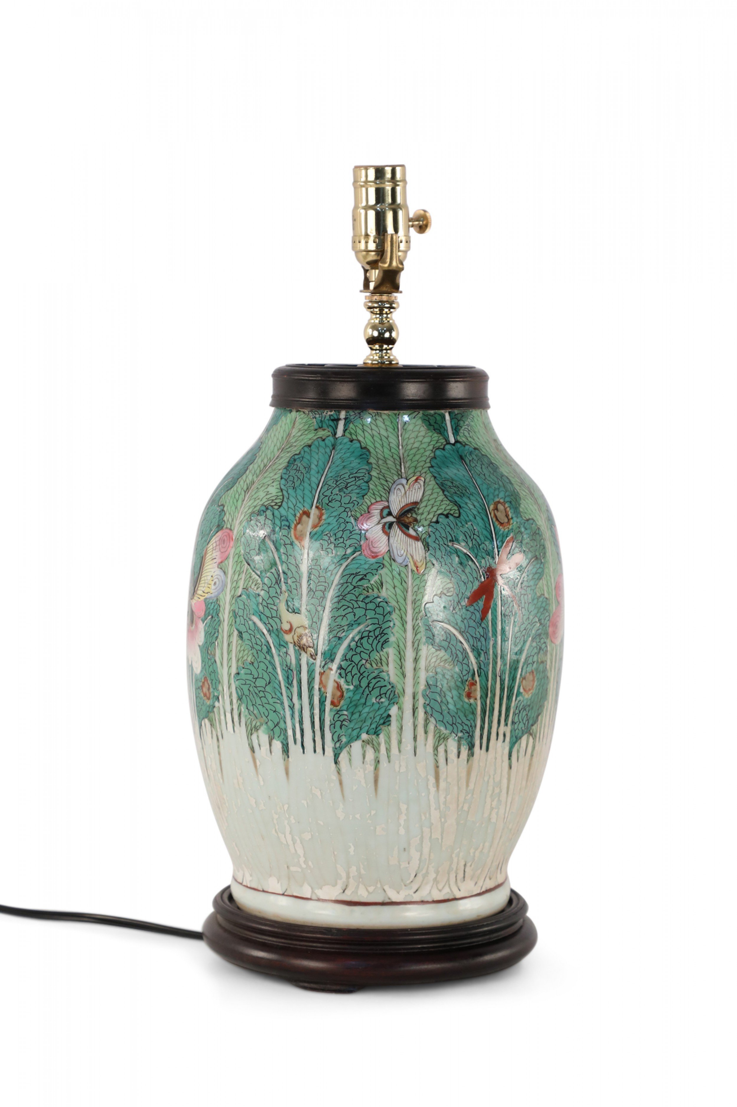 Antique Chinese (Early 20th Century) table lamp made from a vase painted with an intricate green motif of flora and dragon flies with brass hardware and a turned wooden base and top..