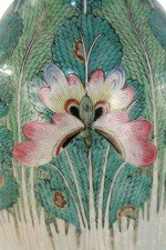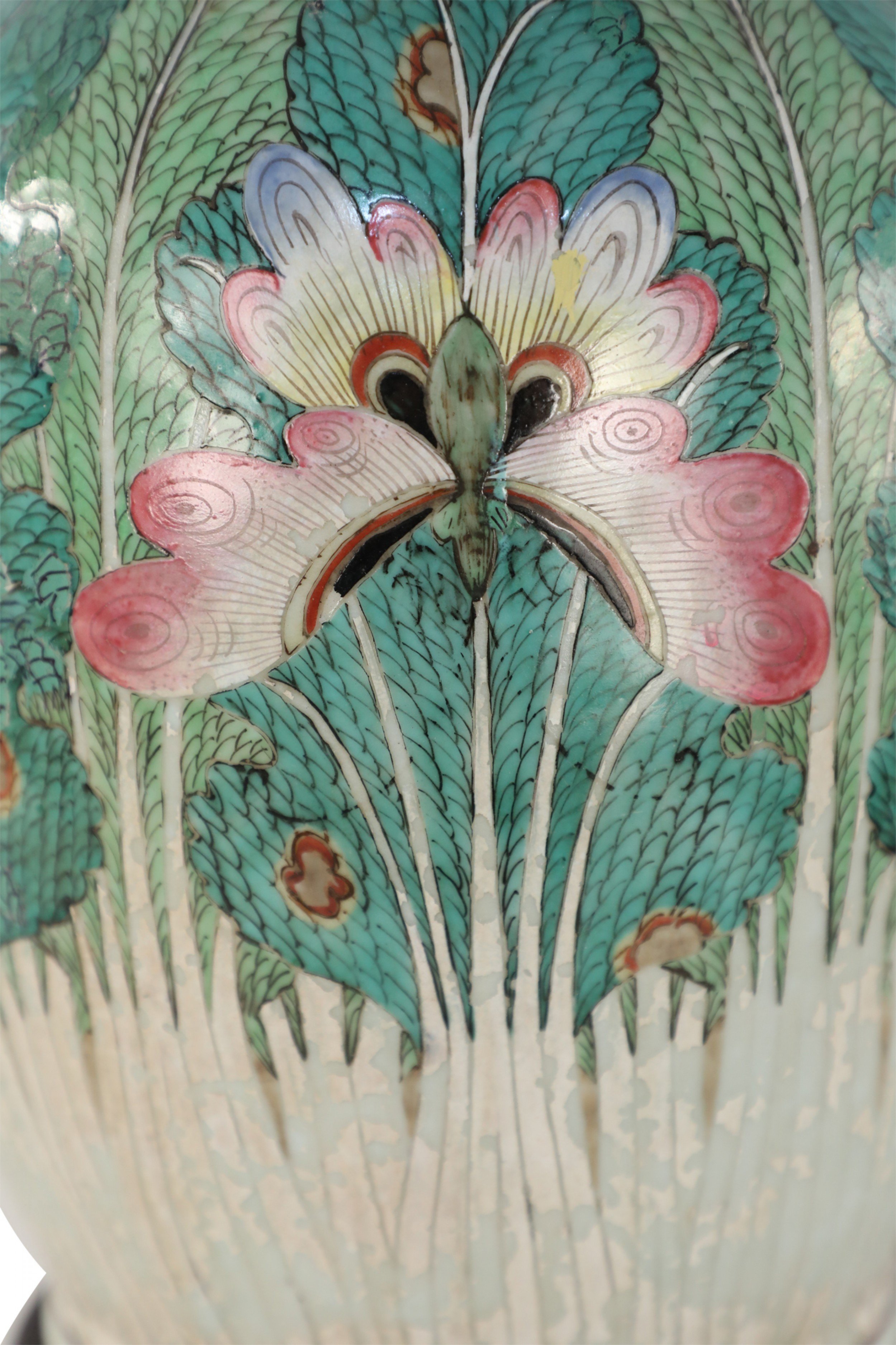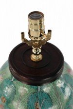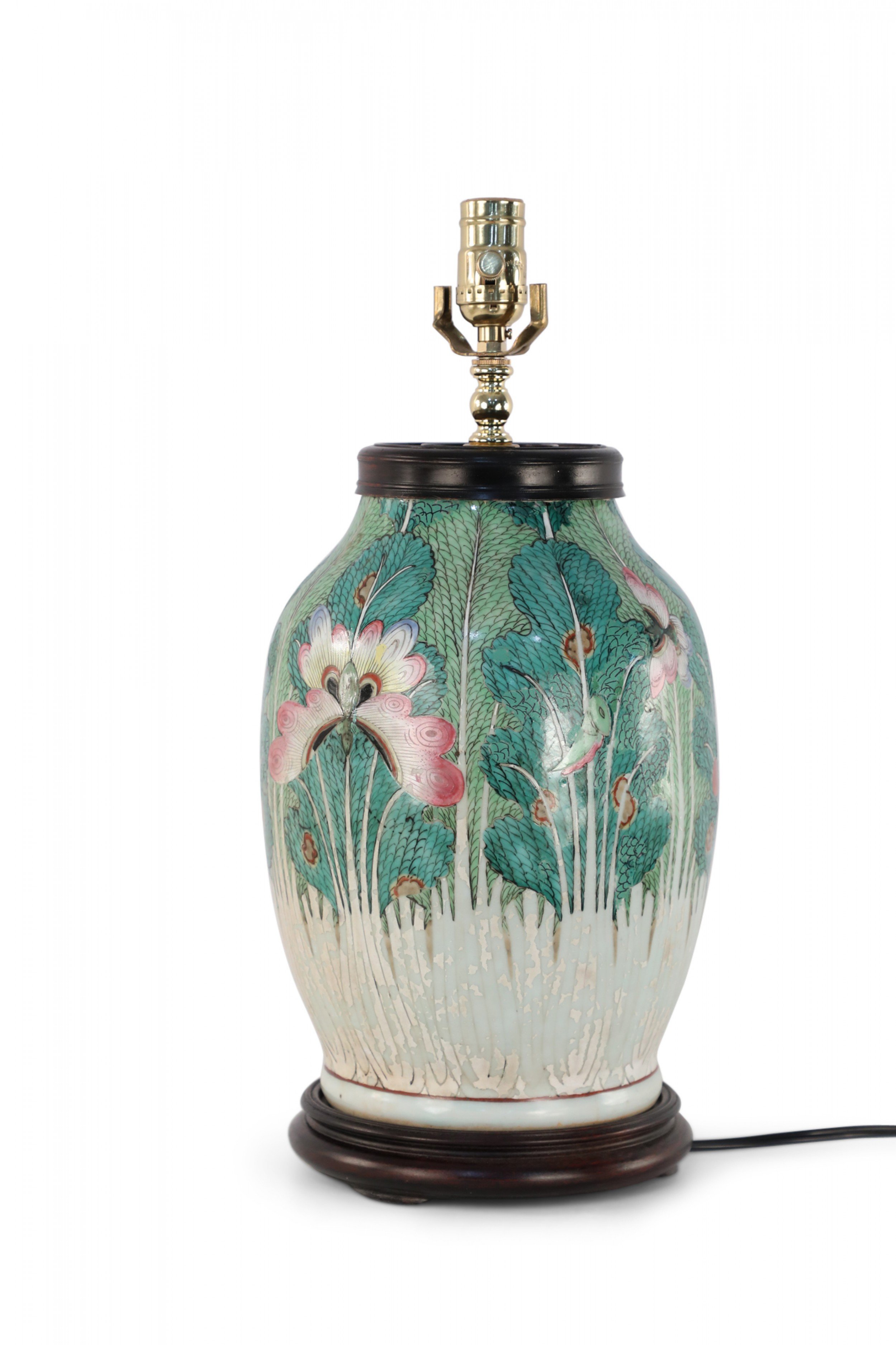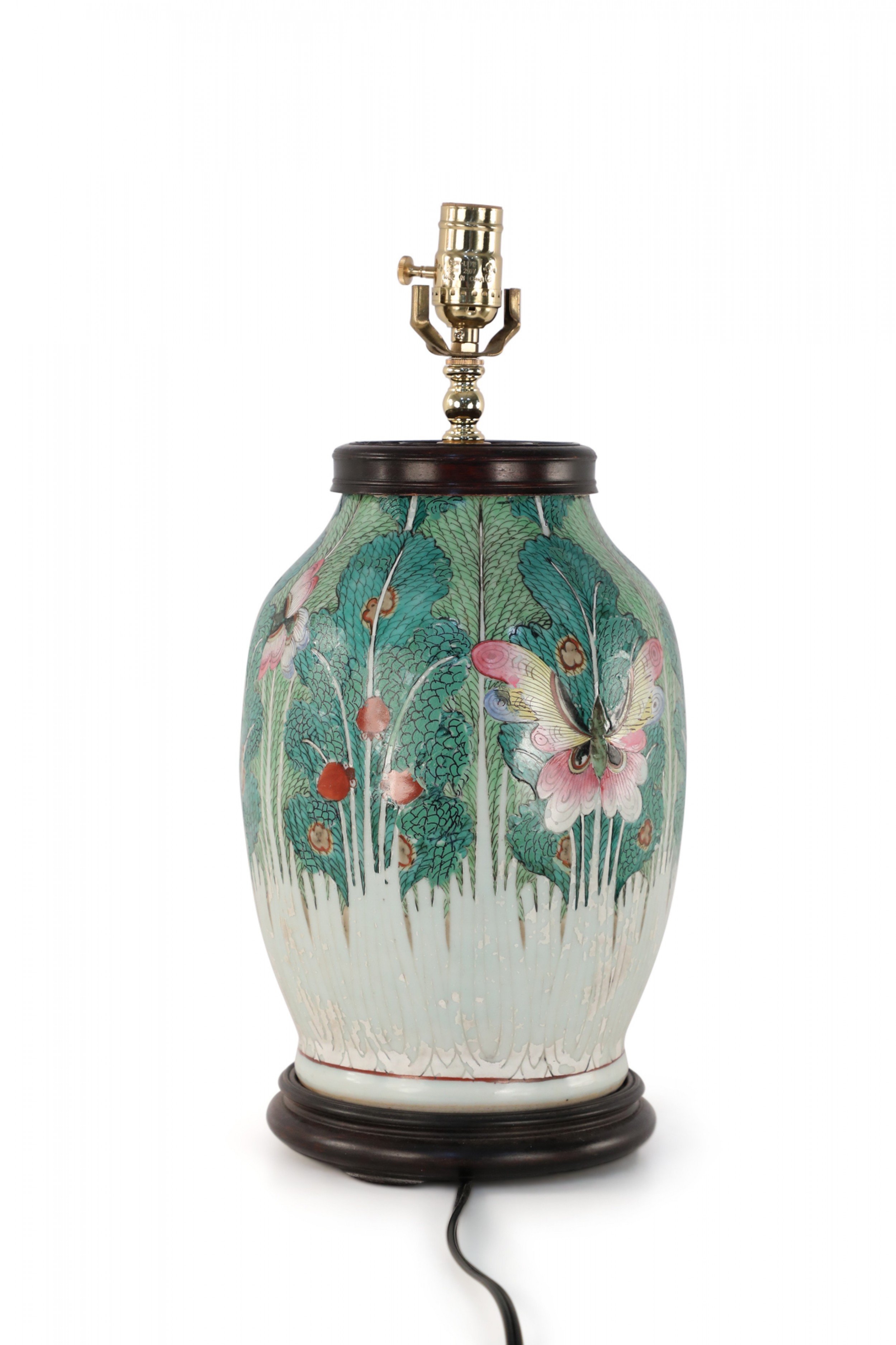 Antique Chinese (Early 20th Century) table lamp made from a vase painted with an intricate green motif of flora and dragon flies with brass hardware and a turned wooden base and top..