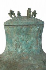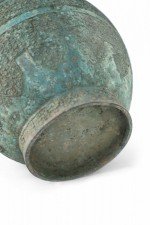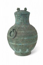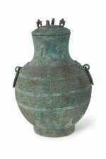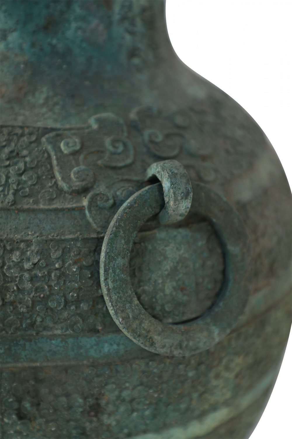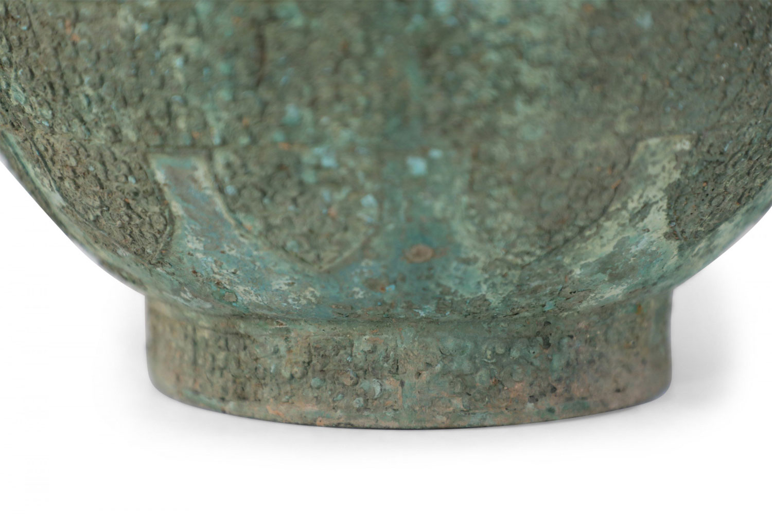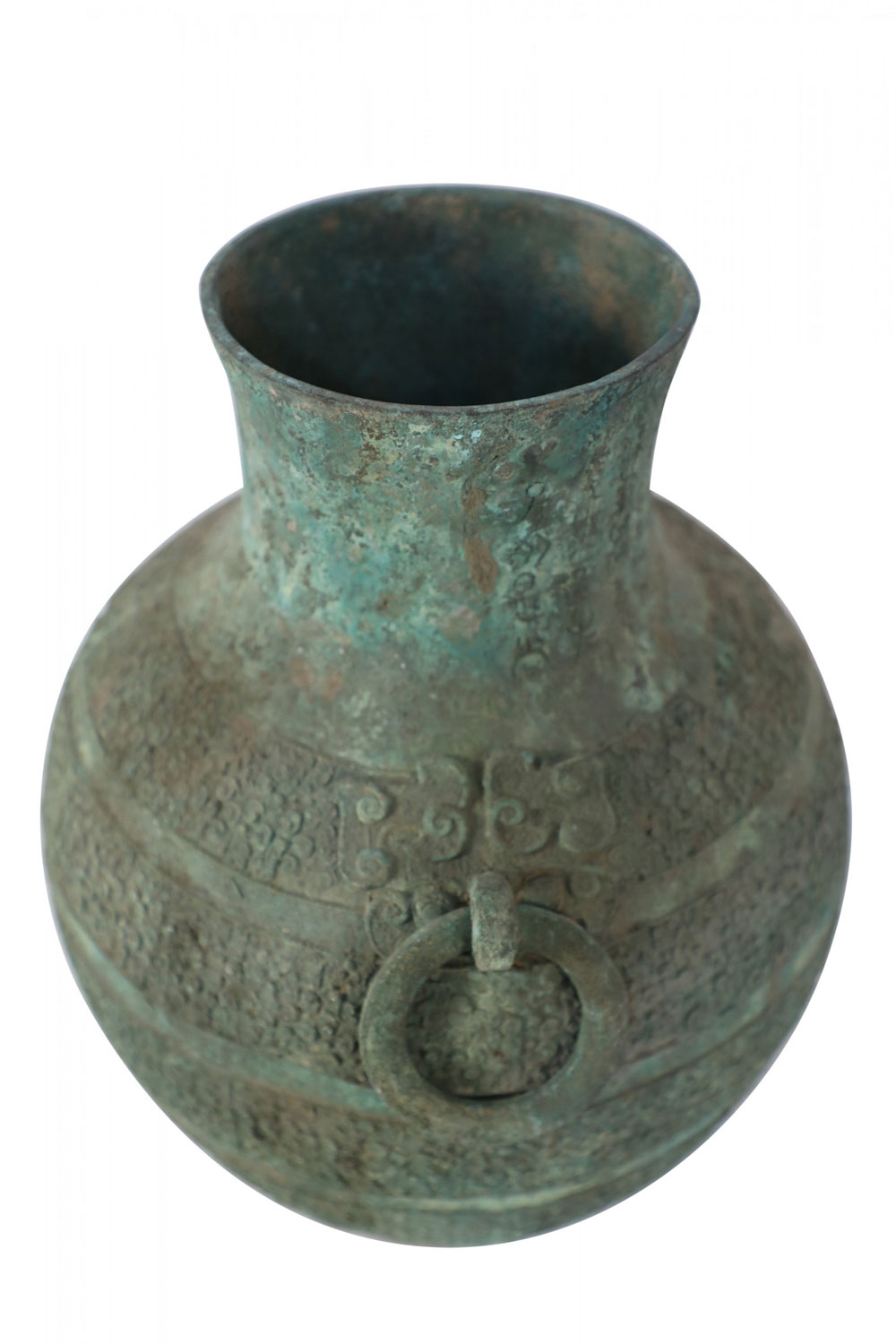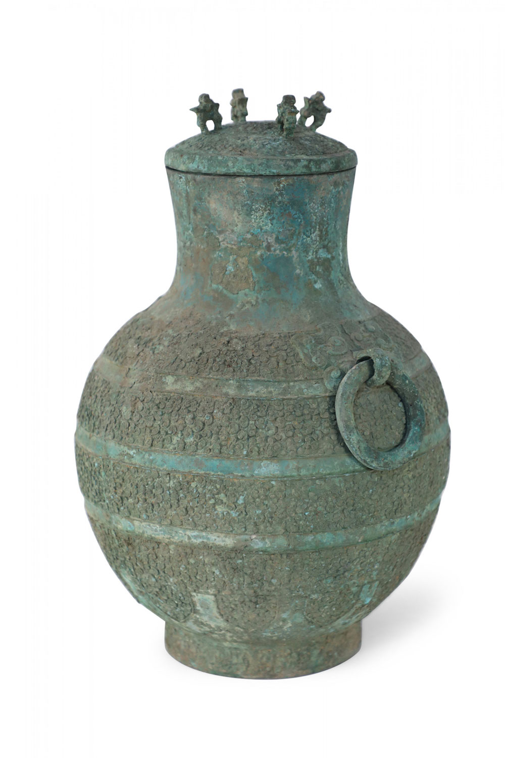 Antique Chinese Han Dynasty-style bulbous form verdigis bronze ritual wine vessel with an archaistic raised banded pattern, a domed lid with four zoomorphic-shaped loops, two decorative rings on the sides and a circular foot..