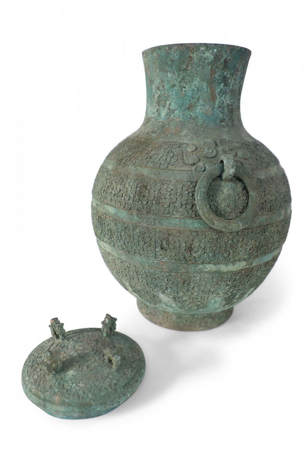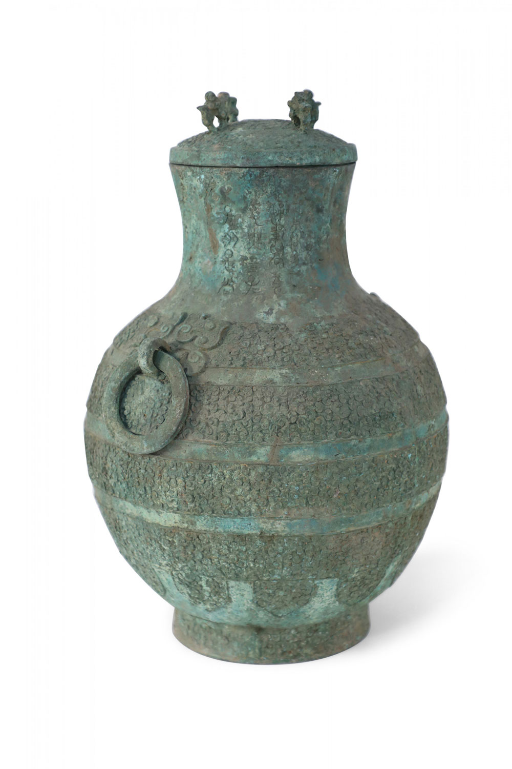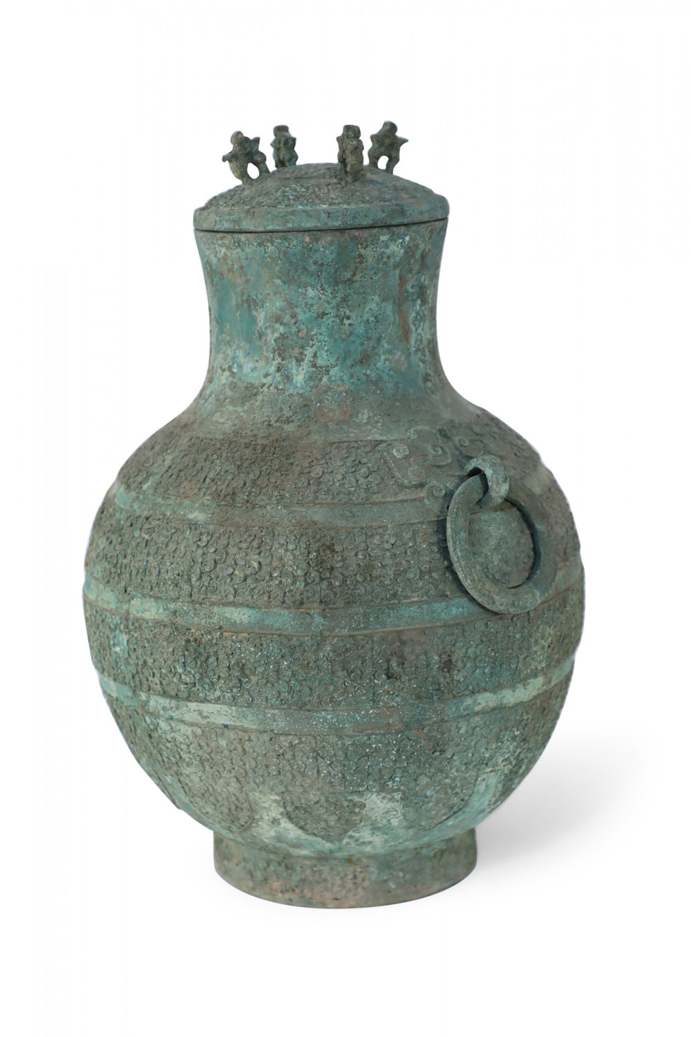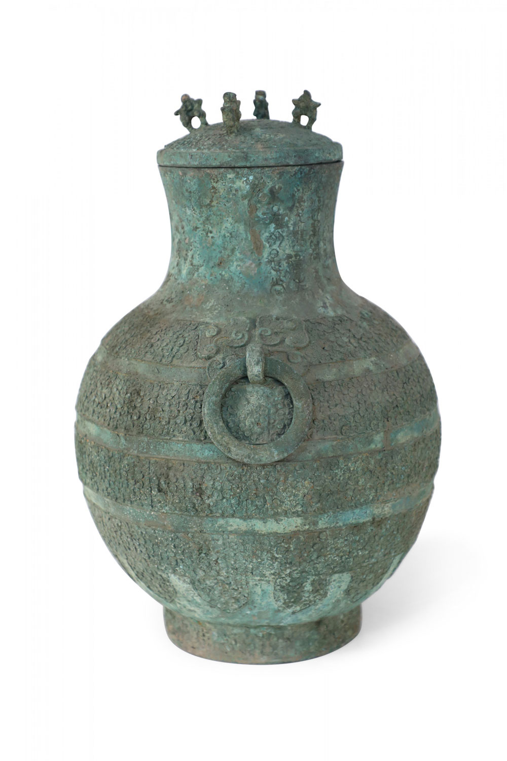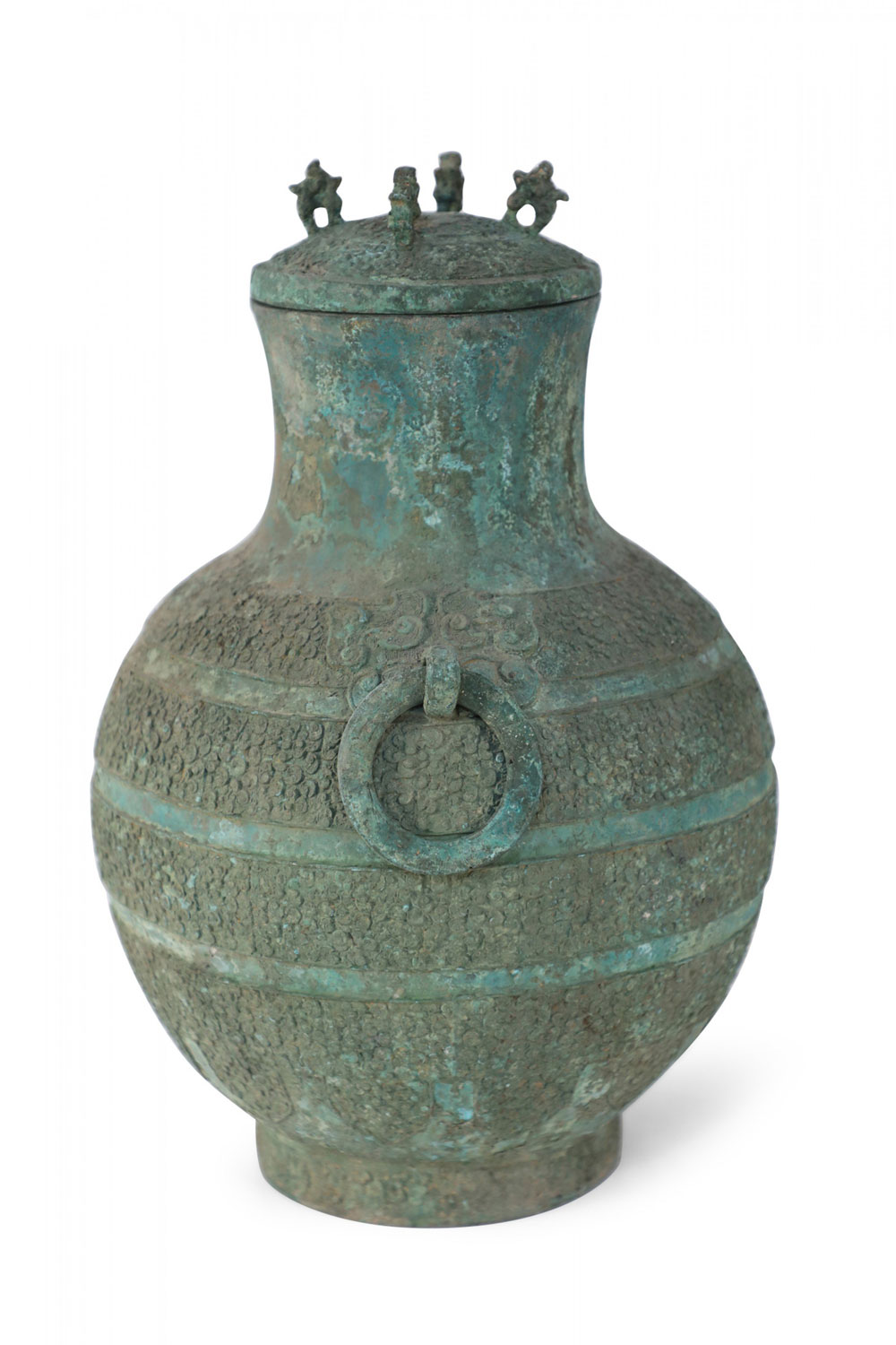 Antique Chinese Han Dynasty-style bulbous form verdigis bronze ritual wine vessel with an archaistic raised banded pattern, a domed lid with four zoomorphic-shaped loops, two decorative rings on the sides and a circular foot.