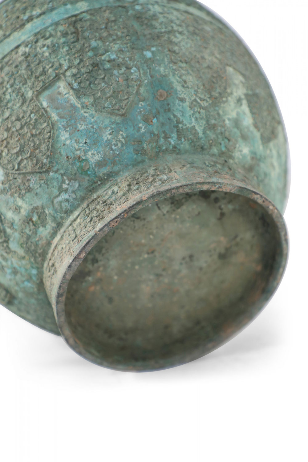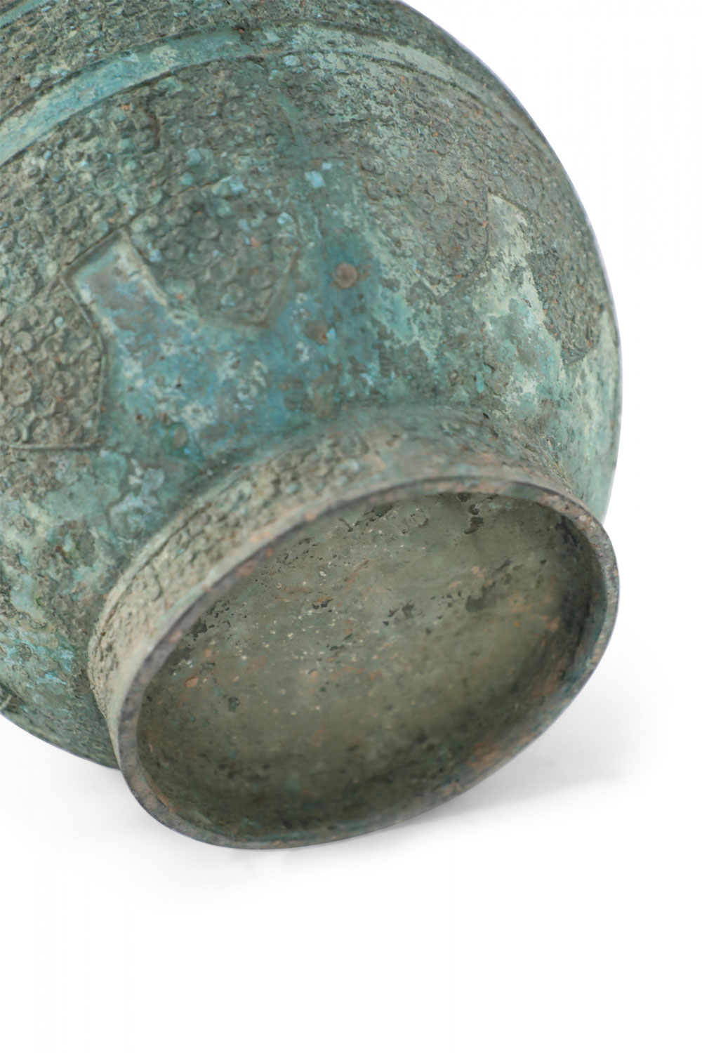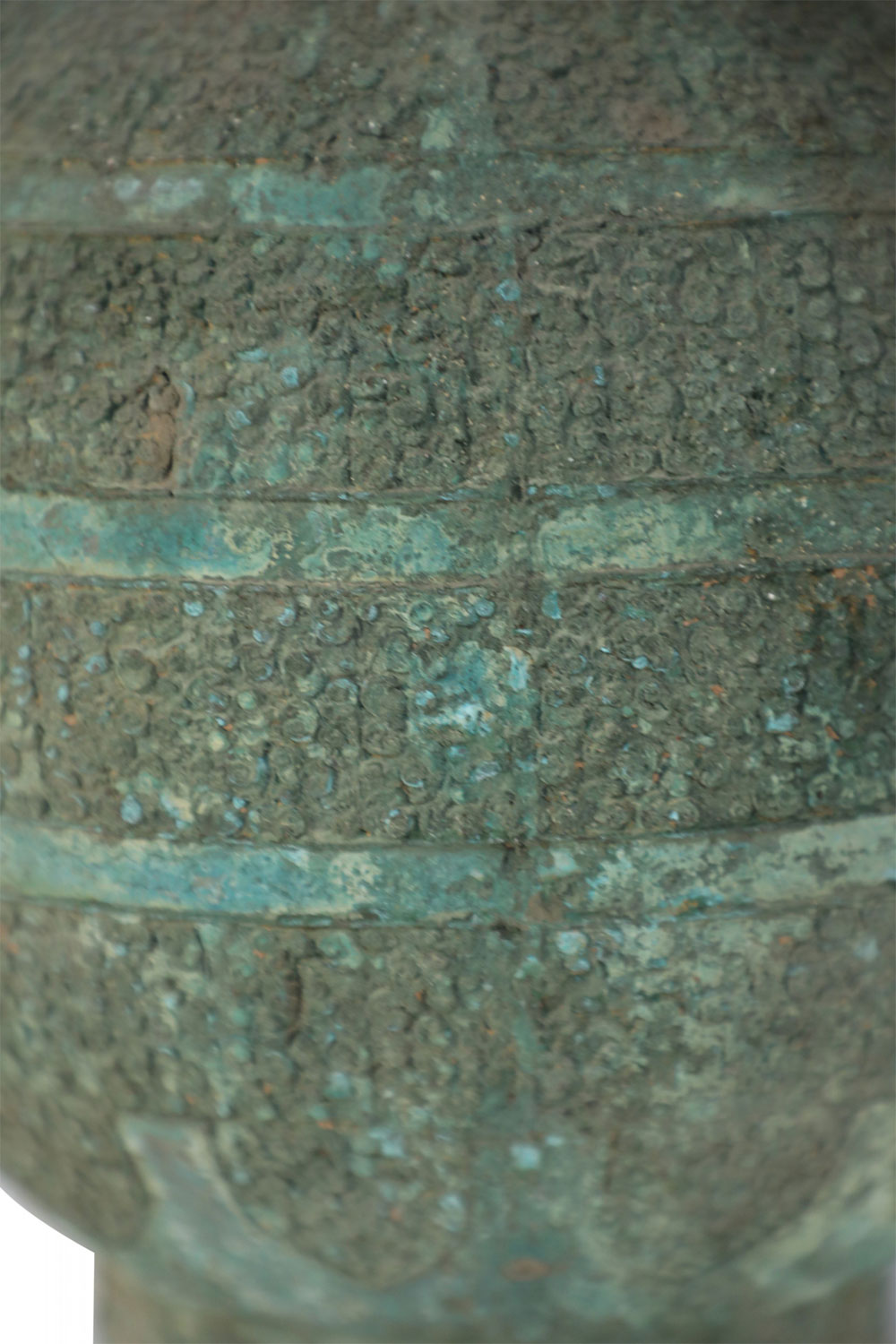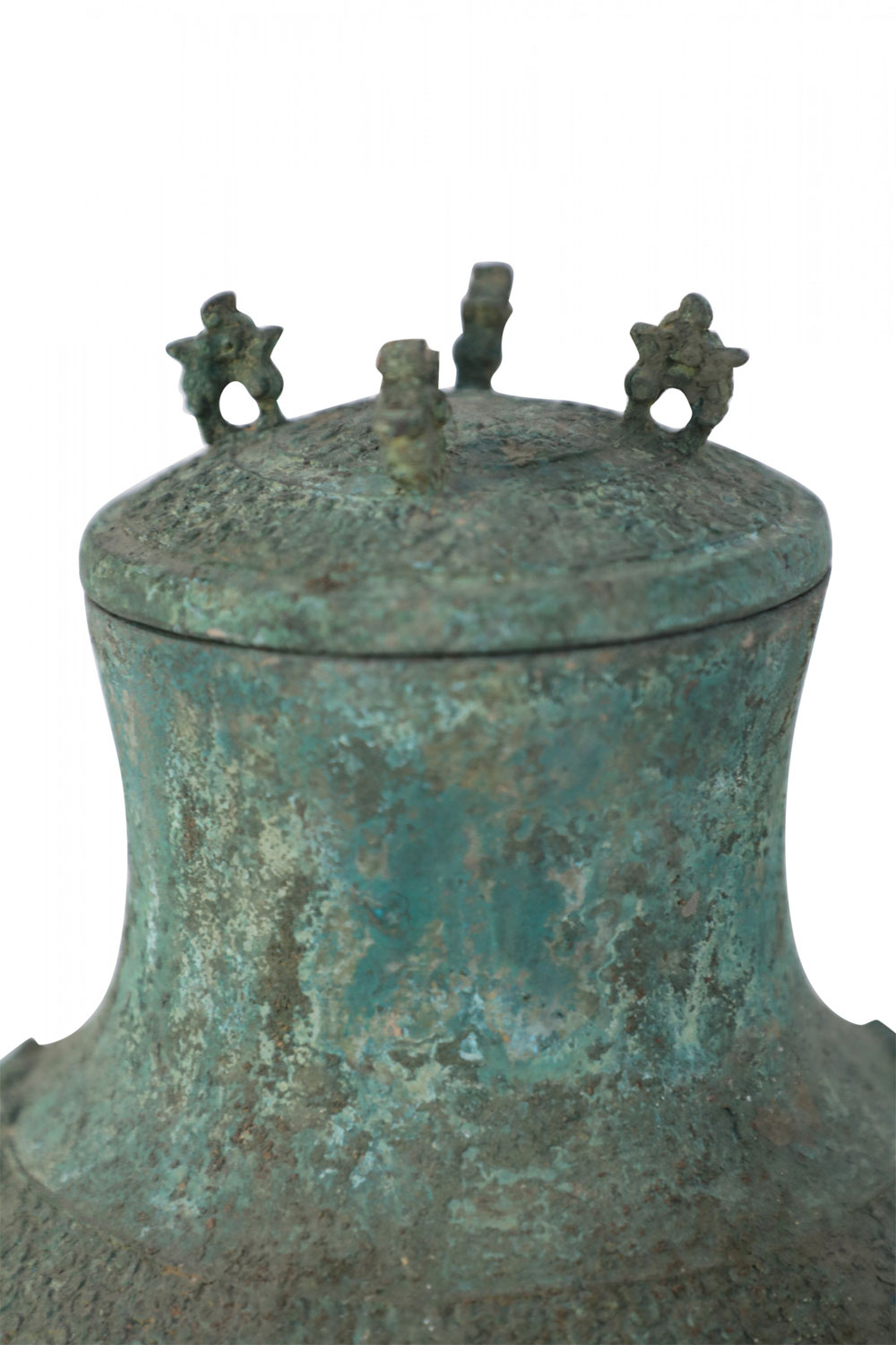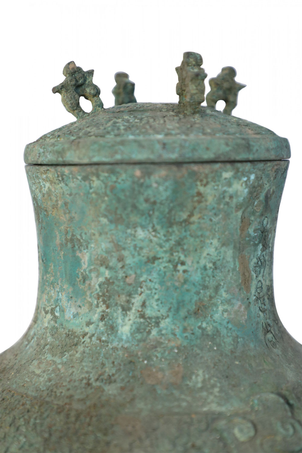 Antique Chinese Han Dynasty-style bulbous form verdigis bronze ritual wine vessel with an archaistic raised banded pattern, a domed lid with four zoomorphic-shaped loops, two decorative rings on the sides and a circular foot.
