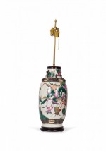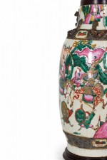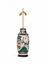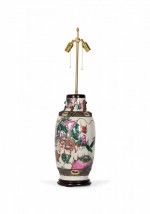 Antique Chinese table lamp made from an 18th century porcelain vase mounted with wood and brass hardware as a lamp, a multi-colored famille rose and genre scene depicting a procession against a beige background. (Similar lamp: NWL2719).