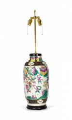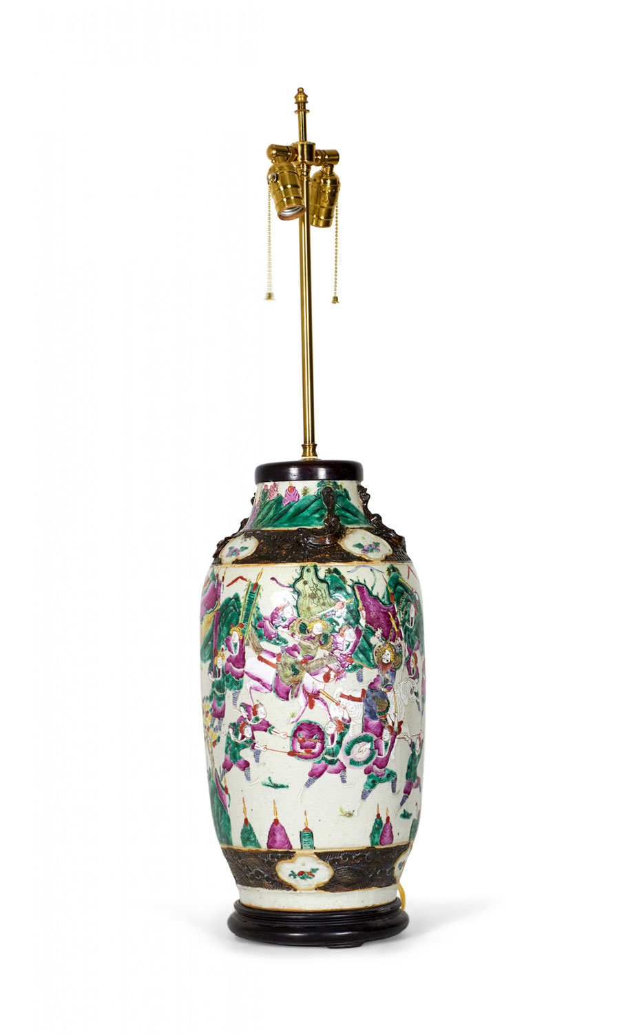 Antique Chinese table lamp made from an 18th century porcelain vase mounted with wood and brass hardware as a lamp, a multi-colored famille rose and genre scene depicting a procession against a beige background. (Similar lamp: NWL2714).