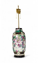 Antique Chinese table lamp made from an 18th century porcelain vase mounted with wood and brass hardware as a lamp, a multi-colored famille rose and genre scene depicting a procession against a beige background. (Similar lamp: NWL2714)