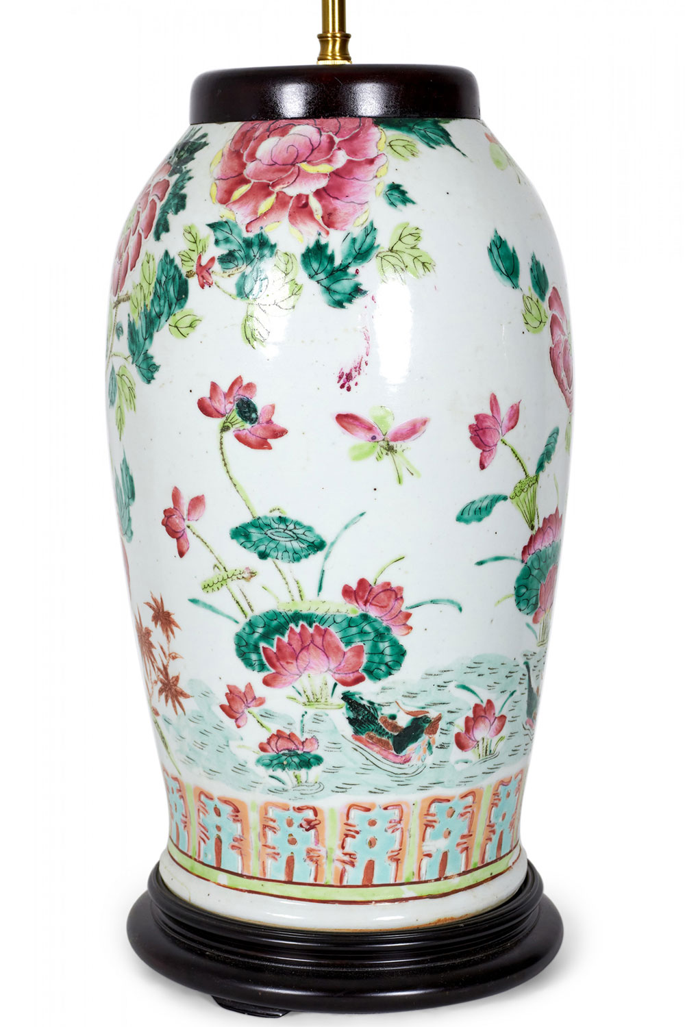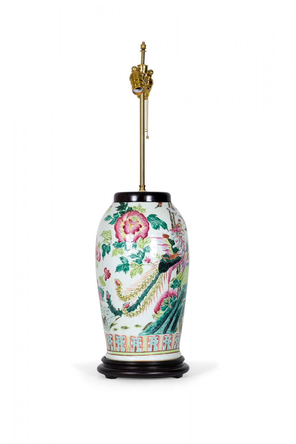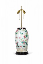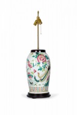 Antique Chinese table lamp made from an 18th century porcelain vase mounted with wood and brass hardware as a lamp, with a multi-colored famille rose and bird pattern against a beige background. (Similar lamp: NWL2715)