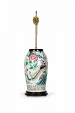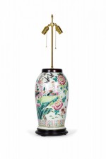 Antique Chinese table lamp made from an 18th century porcelain vase mounted with wood and brass hardware as a lamp, with a multi-colored famille rose and bird pattern against a beige background. (Similar lamp: NWL2715).