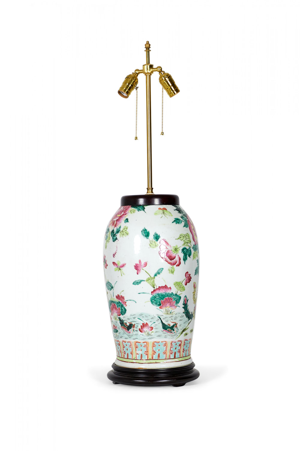 Style: Asian Materials & Techniques: Brass, metal, porcelain, wood Category: Lighting Condition: Ships without shade.