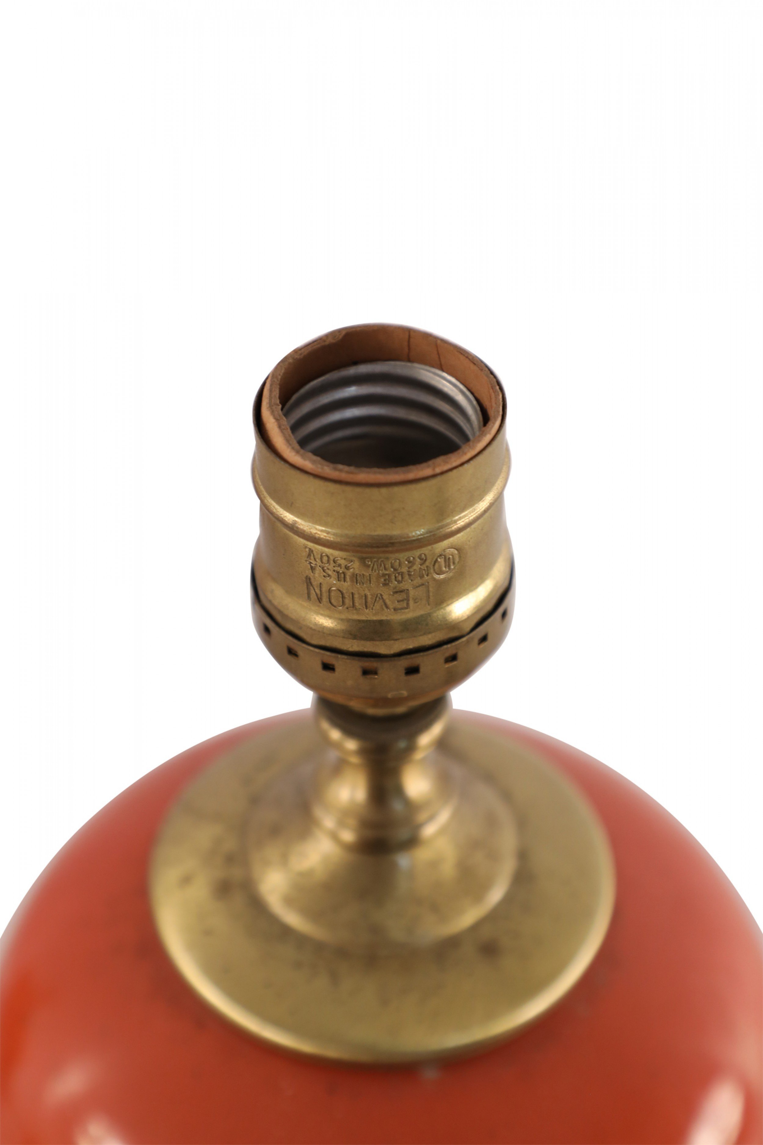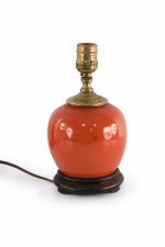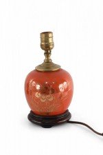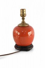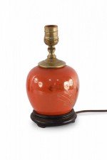 Antique Chinese (Early 20th Century) table lamp made from a round, orange, luster porcelain vase with with a gold floral bouquet design, mounted on a brown wooden base and fitted with patinated brass hardware..