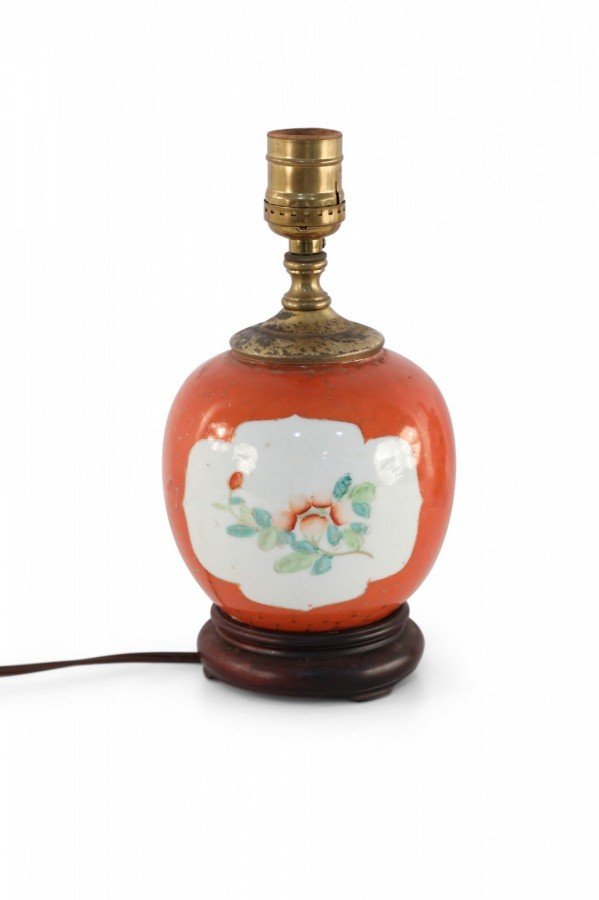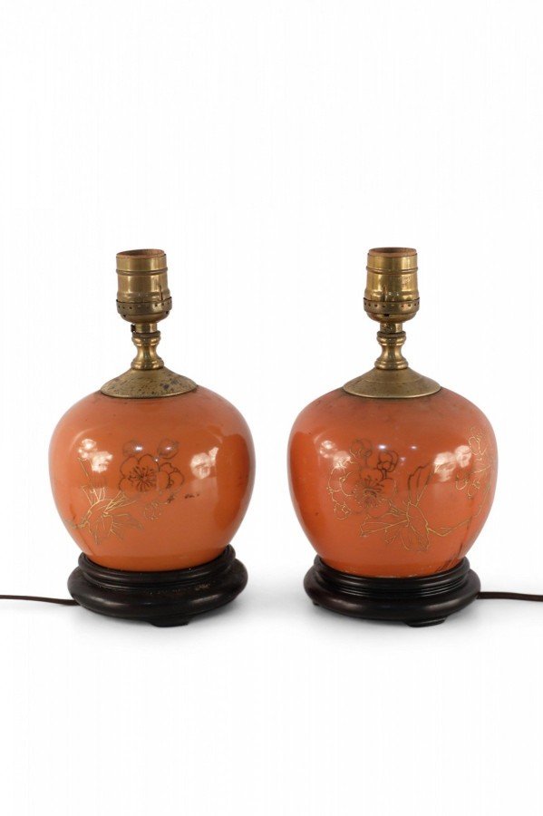 Antique Chinese Orange and Gold Crane Design Porcelain Table Lamp