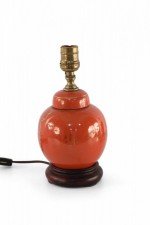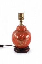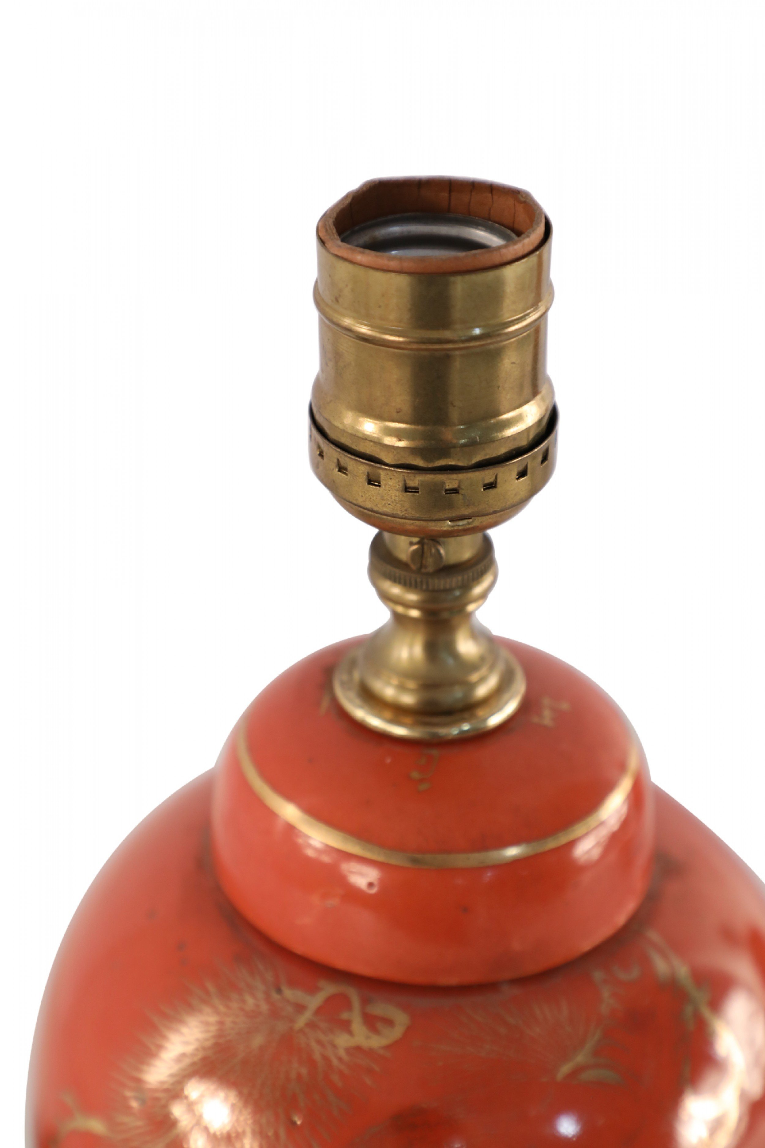 Antique Chinese (Early 20th Century) table lamp made from a round, orange, luster porcelain, lidded vase decorated with a gold crane design on one side and characters on the reverse, mounted on a wooden base and fitted with patinated brass hardware..