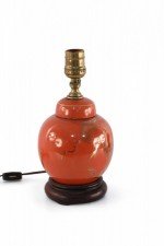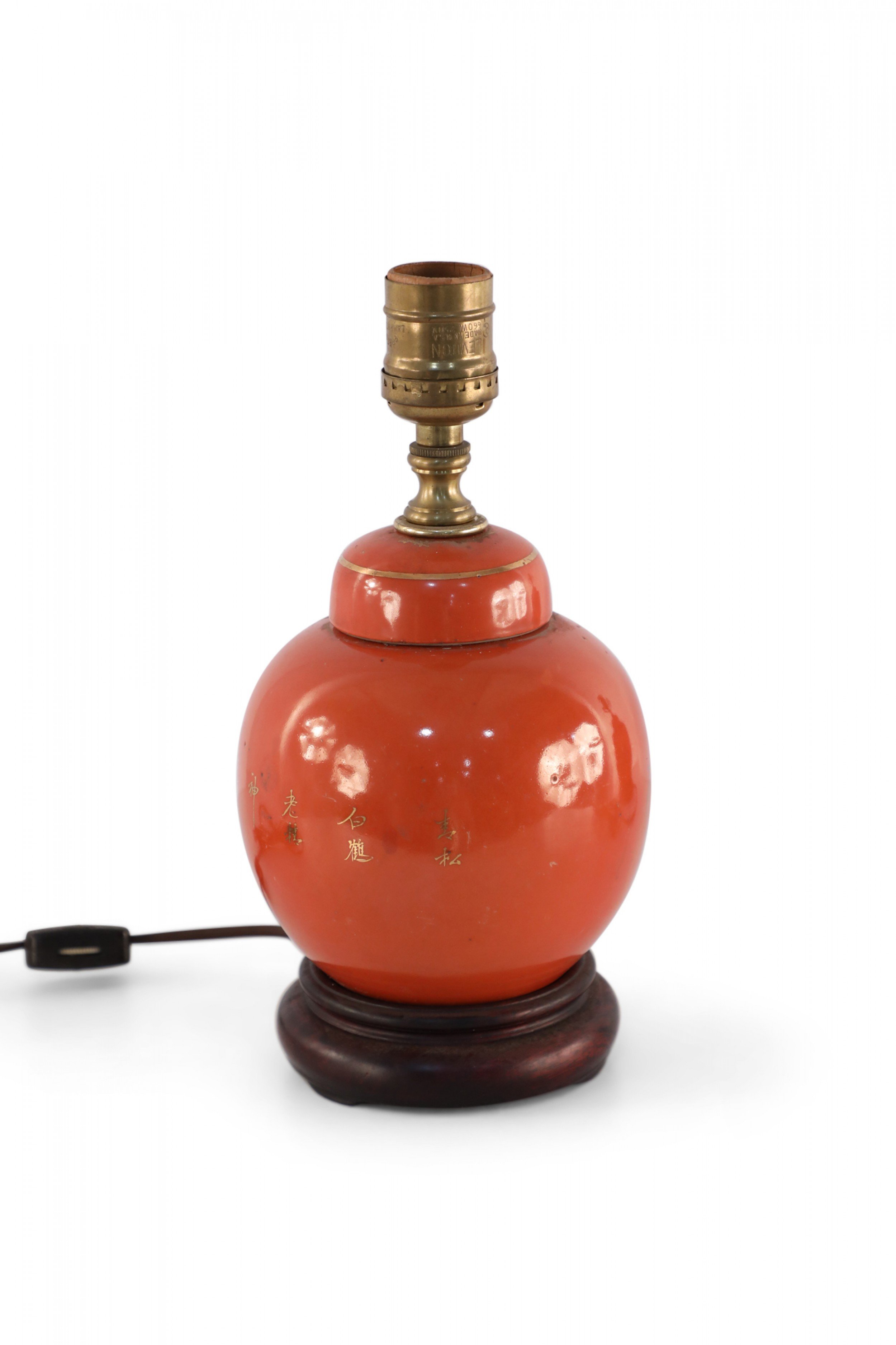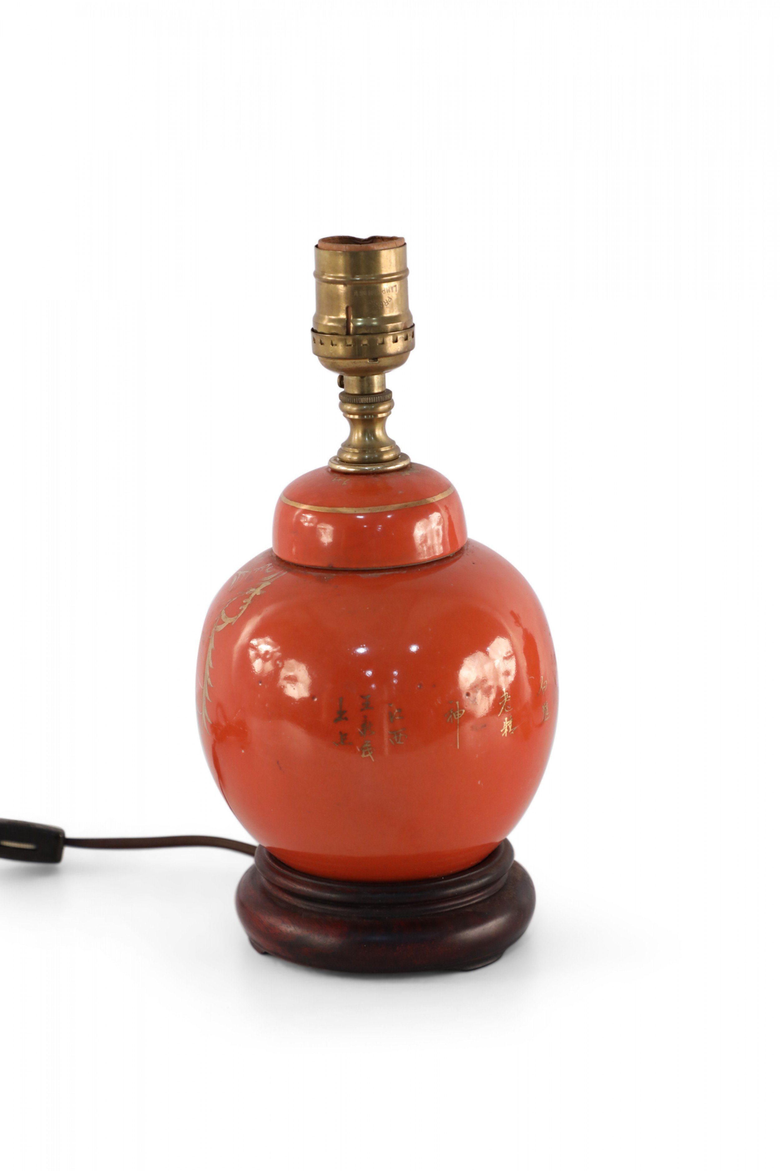 Antique Chinese (Early 20th Century) table lamp made from a round, orange, luster porcelain, lidded vase decorated with a gold crane design on one side and characters on the reverse, mounted on a wooden base and fitted with patinated brass hardware.