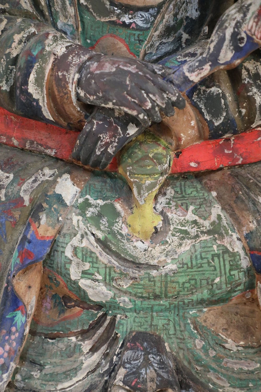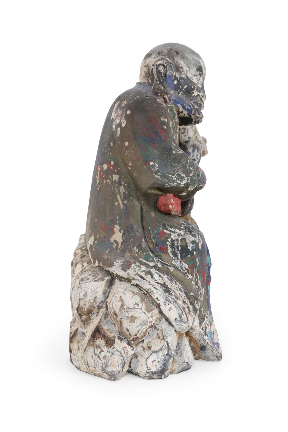 Antique Chinese (early 20th Century, Republic of China) clay Buddha sculpture with painted details in red, green, and blue. (Similar sculptures: NWL2497, NWL2499)