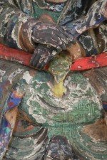 Antique Chinese (early 20th Century, Republic of China) clay Buddha sculpture with painted details in red, green, and blue. (Similar sculptures: NWL2497, NWL2499).