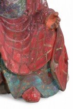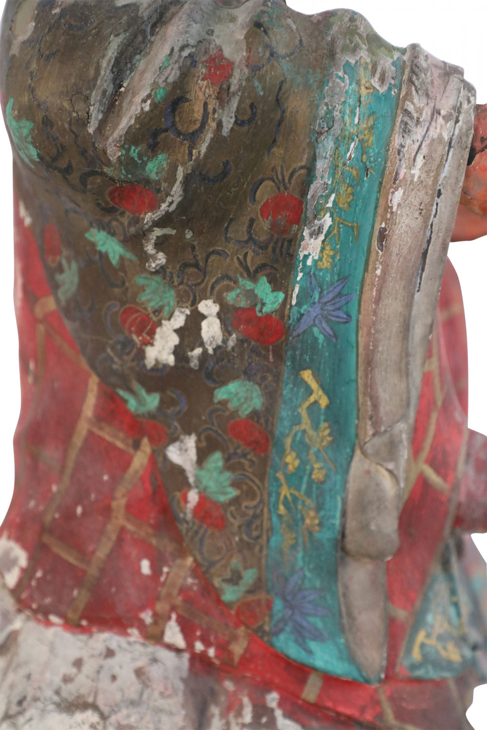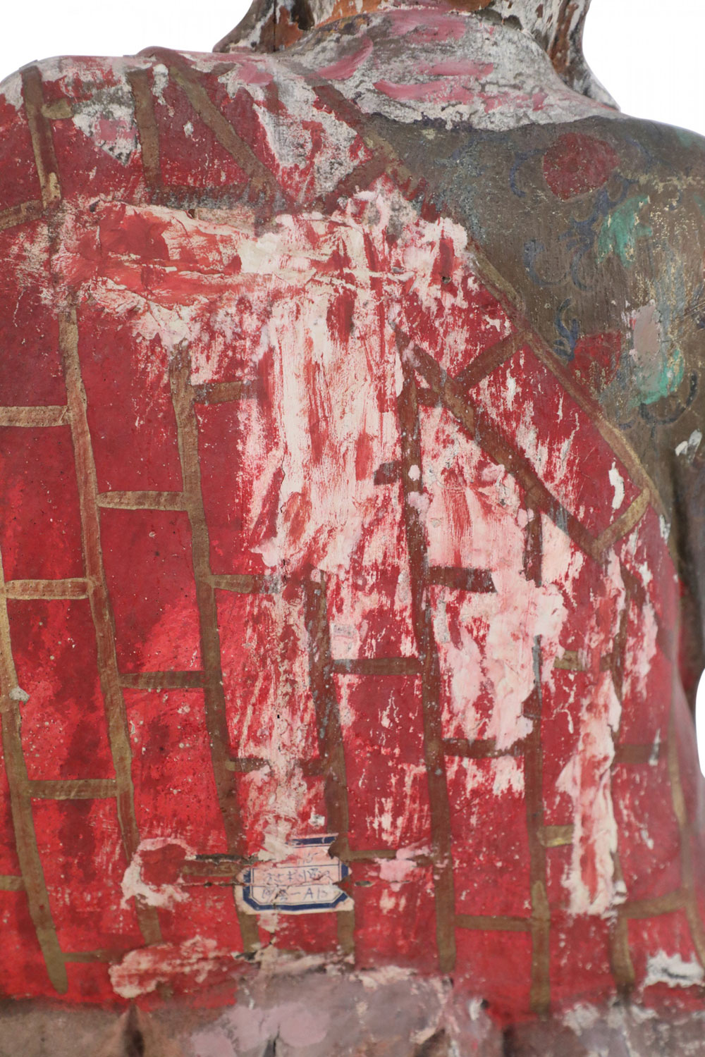 Antique Chinese (early 20th Century, Republic of China) clay Buddha sculpture with painted details and red and green robes. (Similar sculptures: NWL2498, NWL2499).