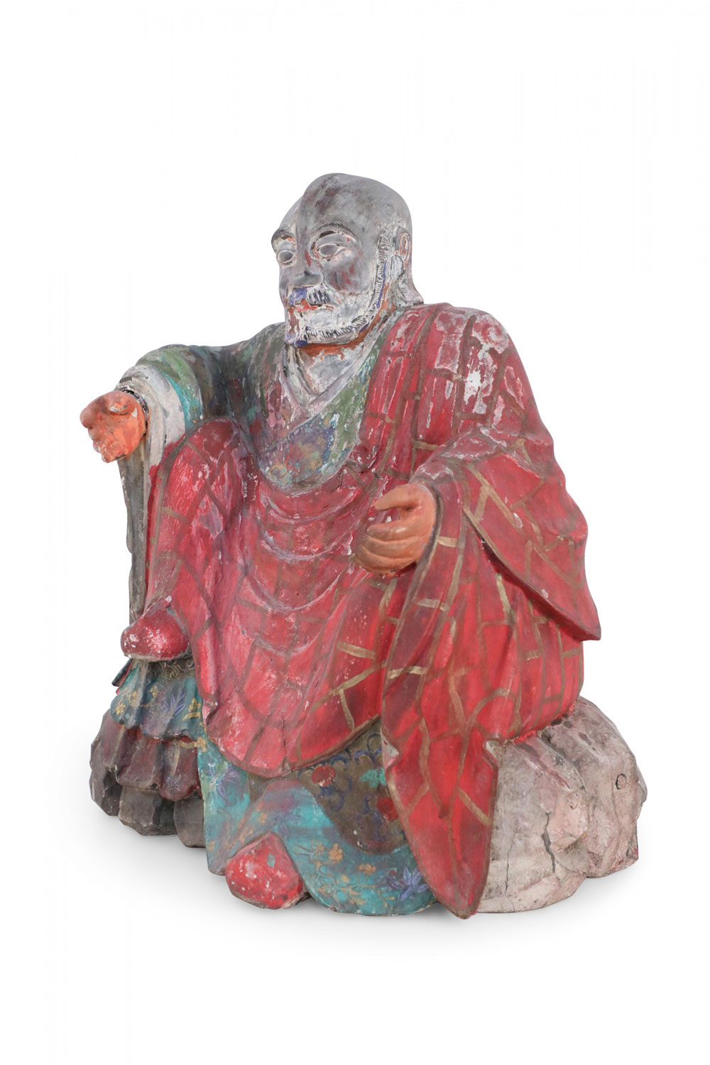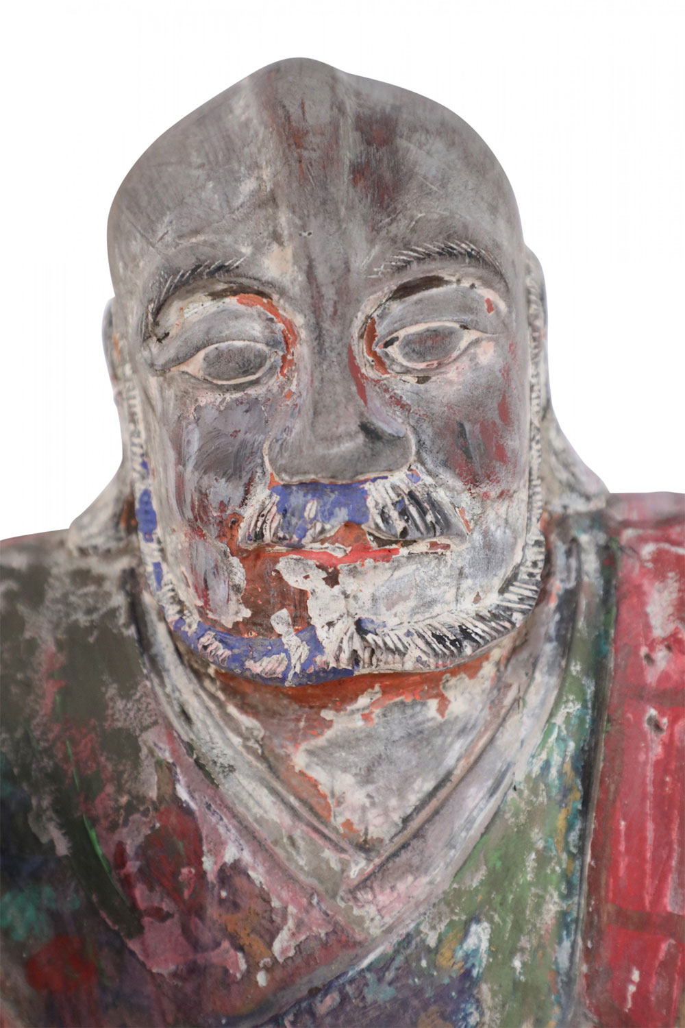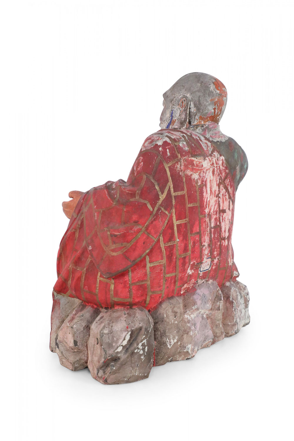 Antique Chinese (early 20th Century, Republic of China) clay Buddha sculpture with painted details and red and green robes. (Similar sculptures: NWL2498, NWL2499)