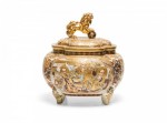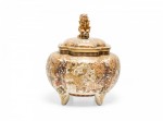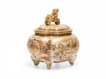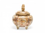 Chinese (19/20th Century-possibly Satsuma) porcelain oval shaped centerpiece with a footed base and decorated exterior having genre scenes and botanical designs in beige, brown, orange, and green with gilt trim and topped with a foo dog shaped handle cover..