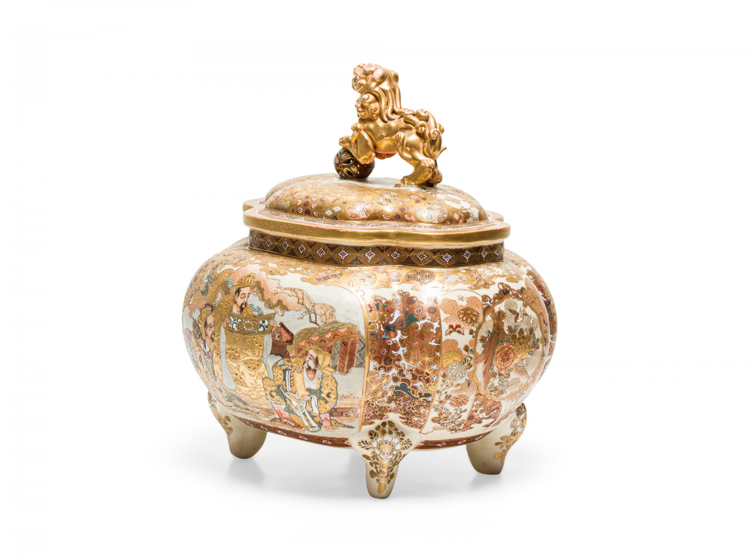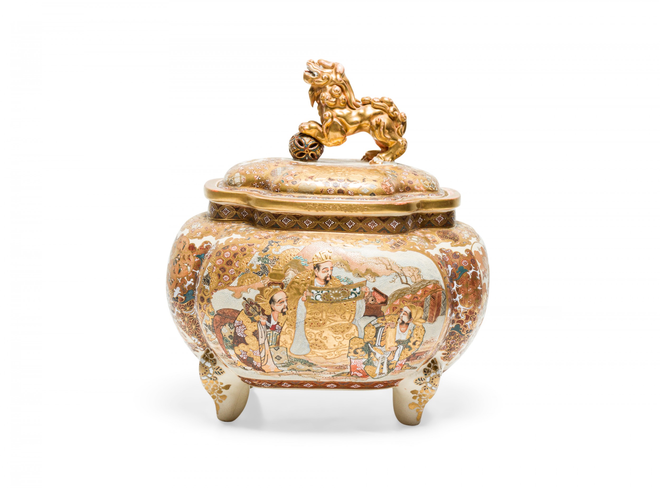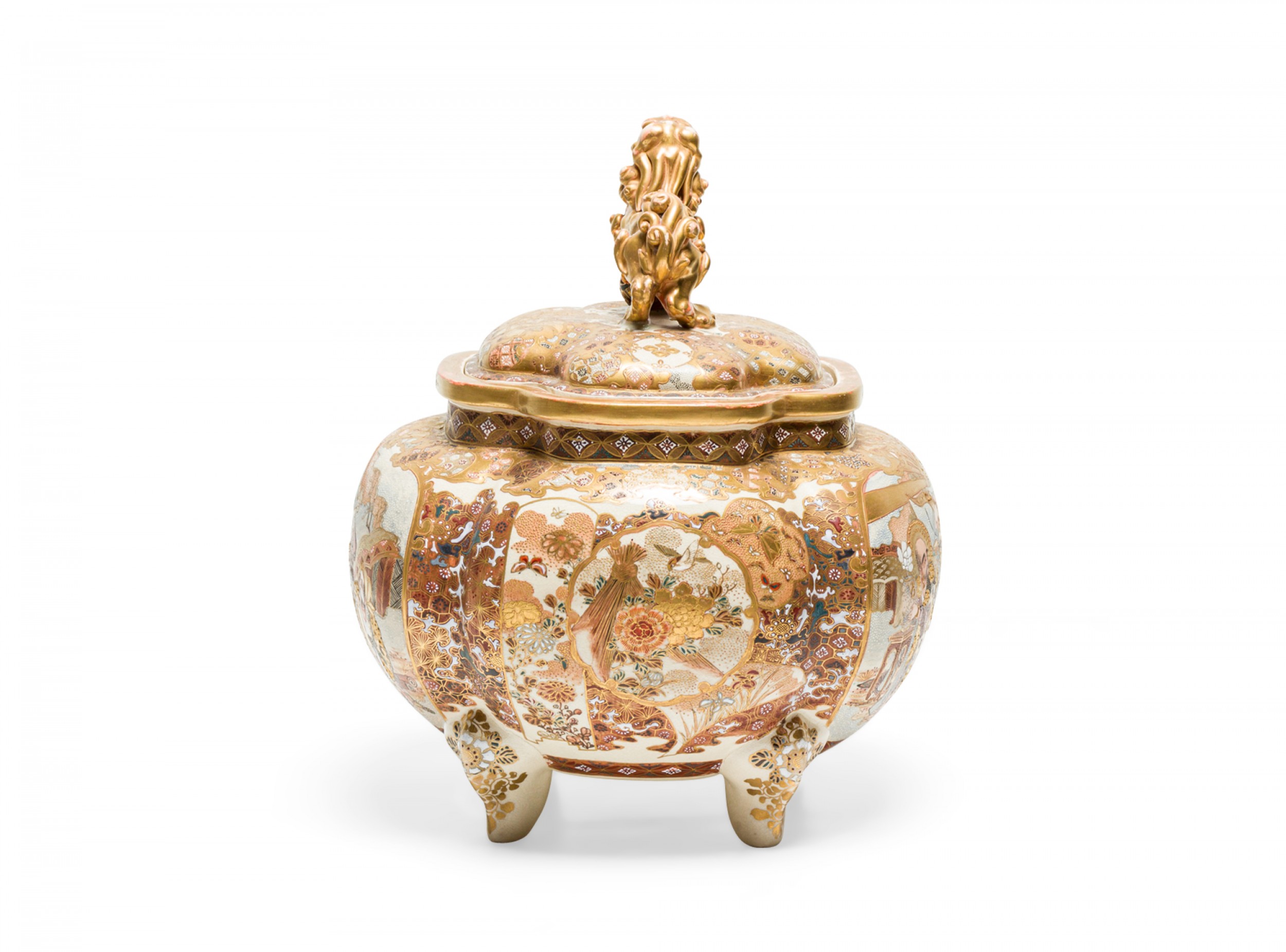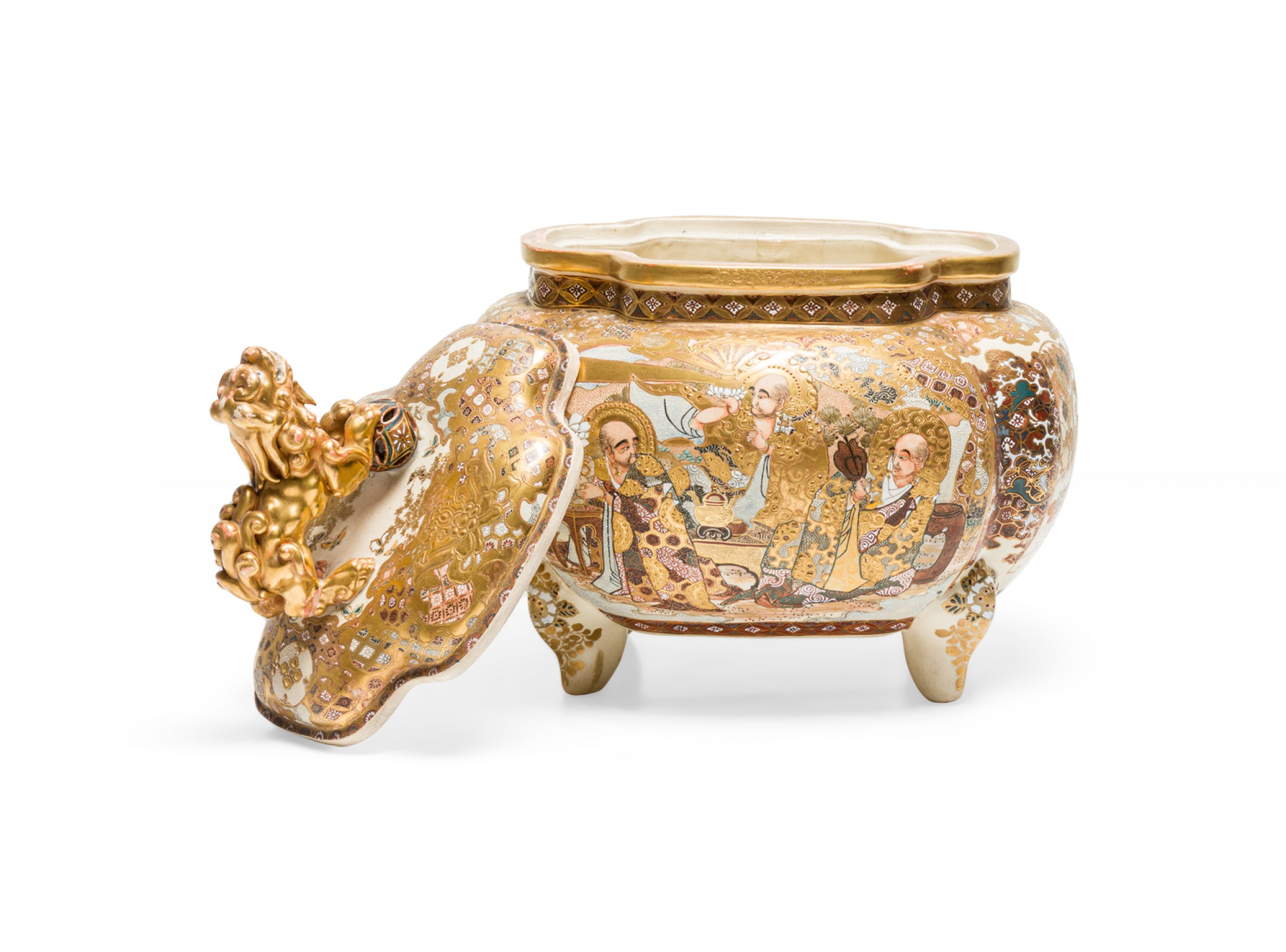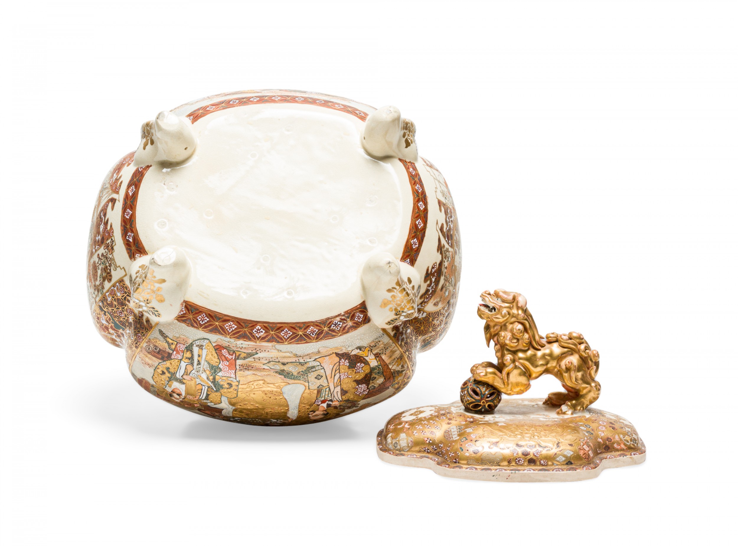 Chinese (19/20th Century-possibly Satsuma) porcelain oval shaped centerpiece with a footed base and decorated exterior having genre scenes and botanical designs in beige, brown, orange, and green with gilt trim and topped with a foo dog shaped handle cover.