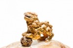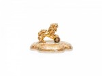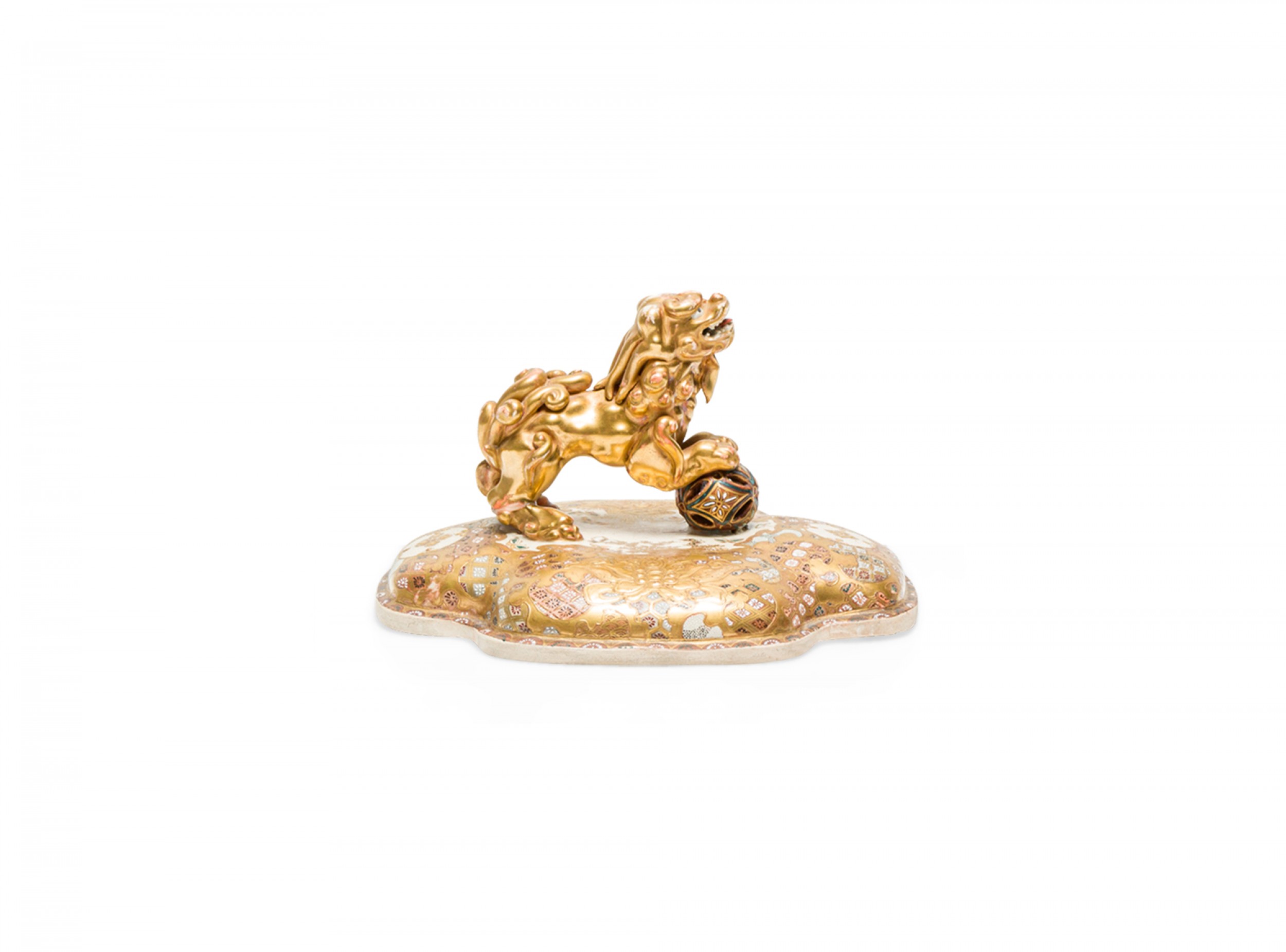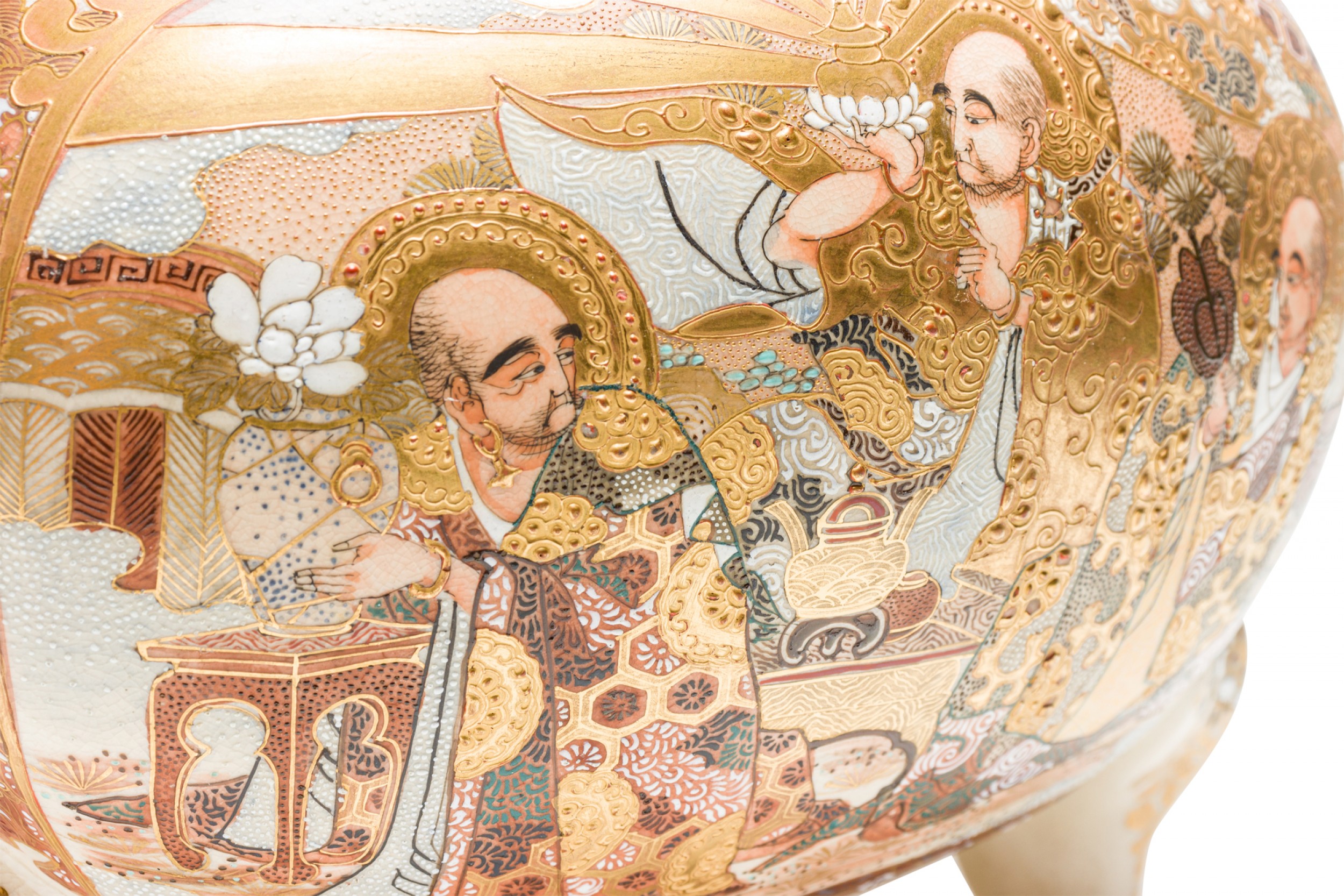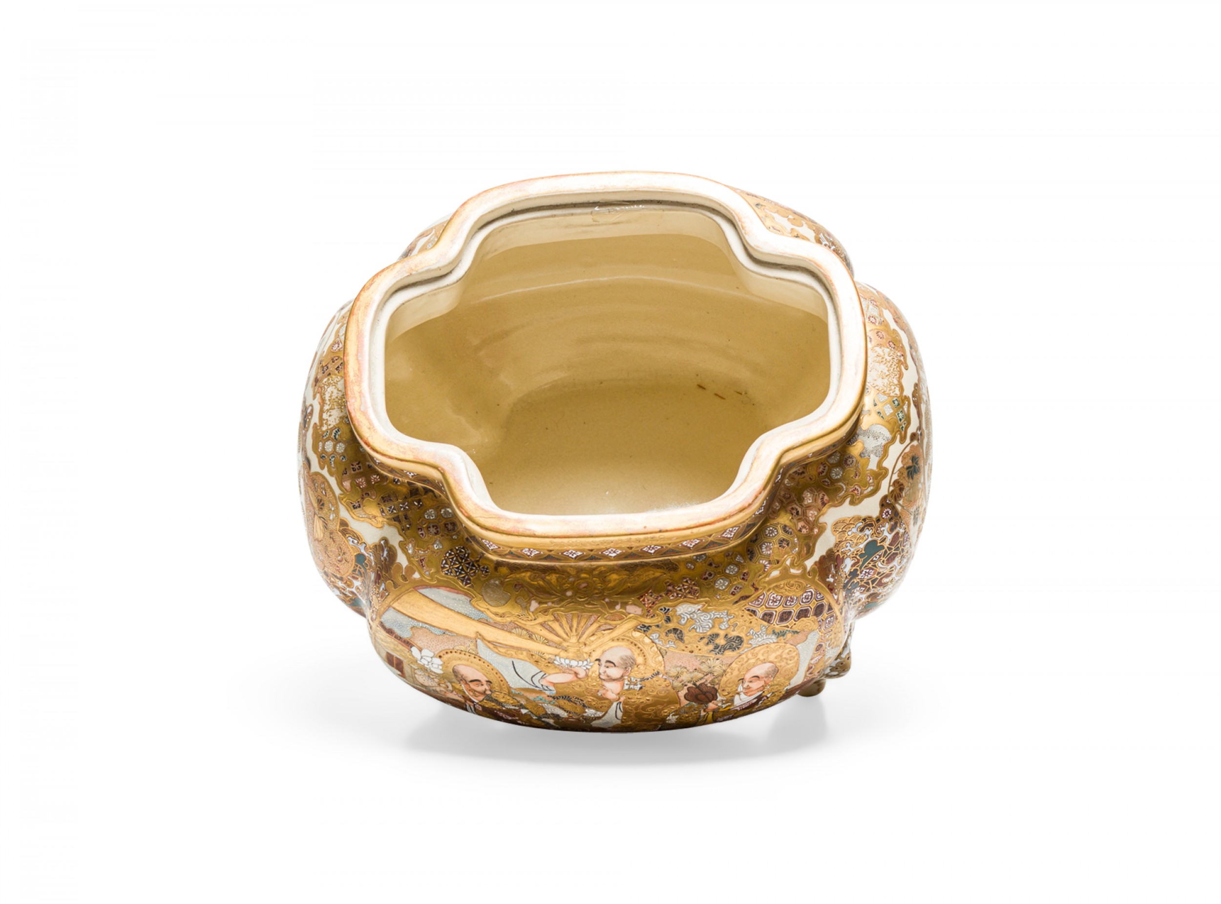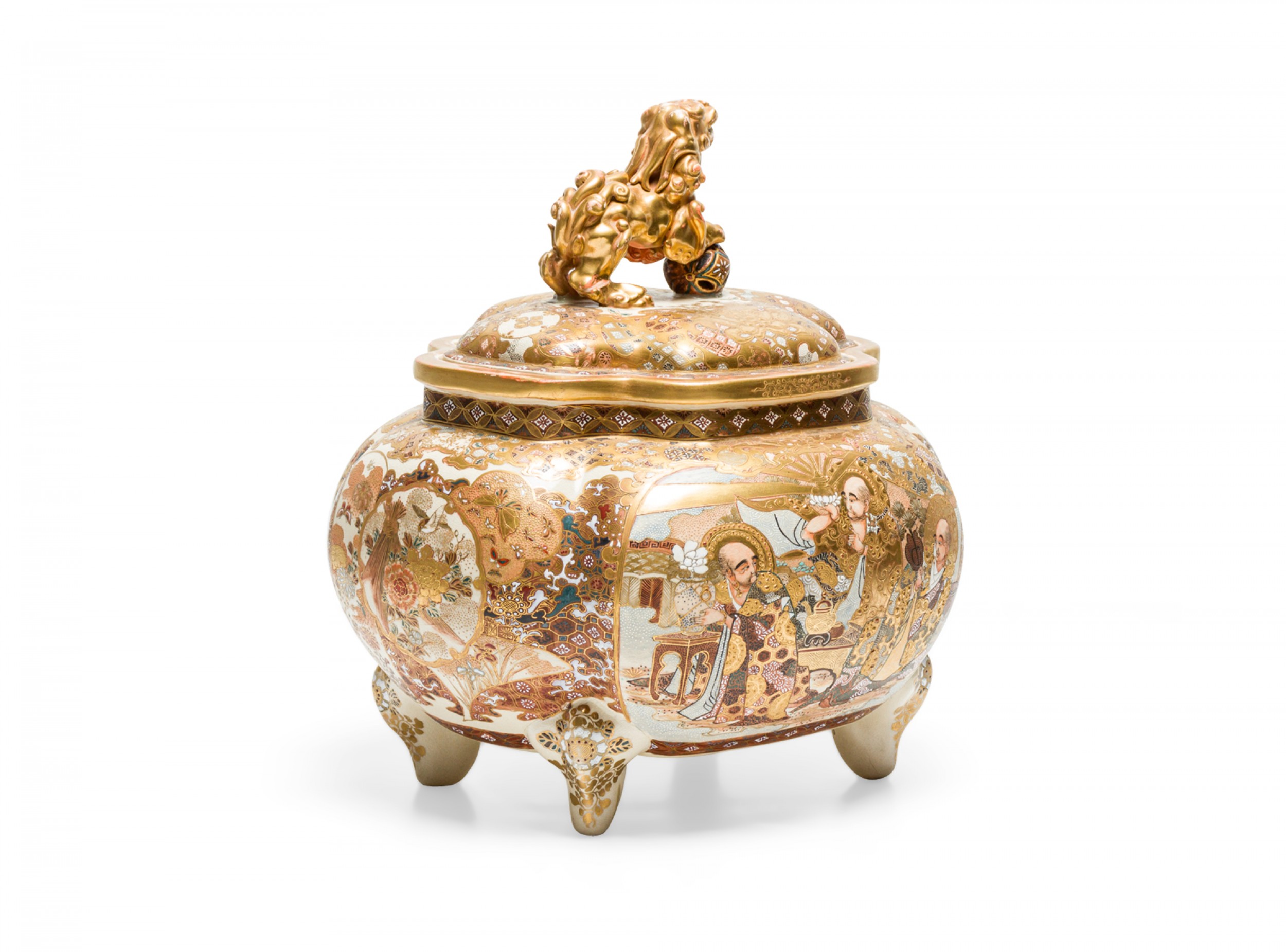 Chinese (19/20th Century-possibly Satsuma) porcelain oval shaped centerpiece with a footed base and decorated exterior having genre scenes and botanical designs in beige, brown, orange, and green with gilt trim and topped with a foo dog shaped handle cover.