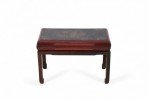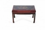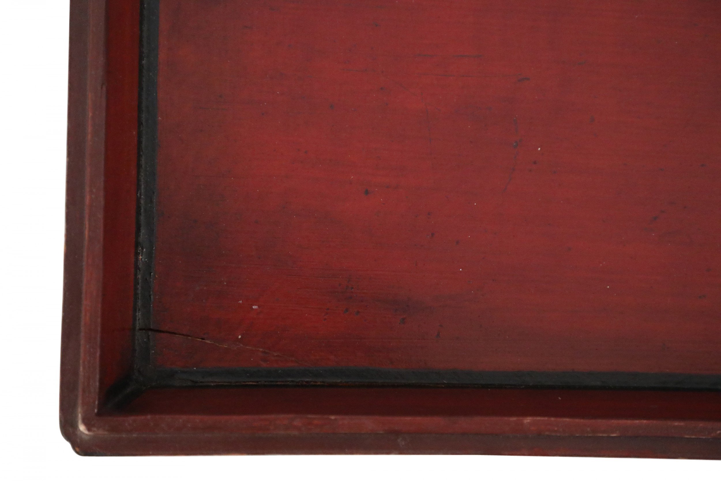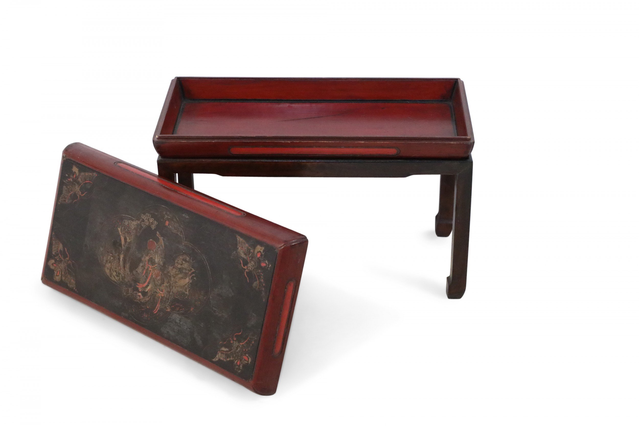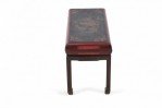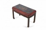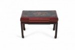 Antique Chinese (Early Republic) wooden bench with removeable, red-sided, black two-piece top painted in a gold and red central figurative scene and moths in each corner, supported by a wooden frame with square legs.