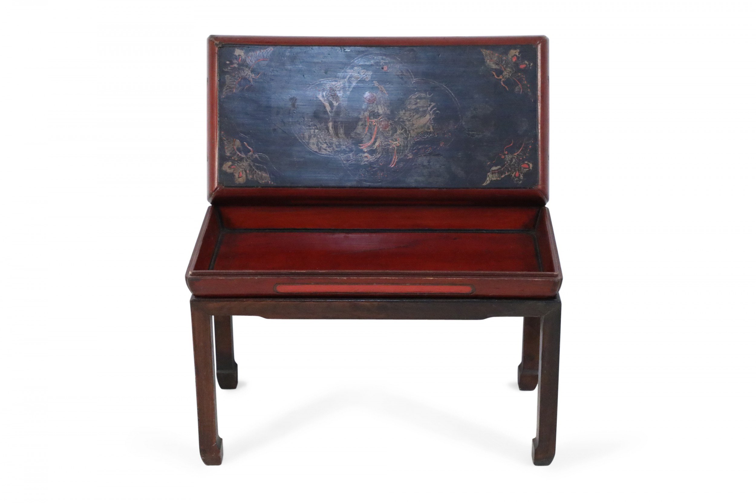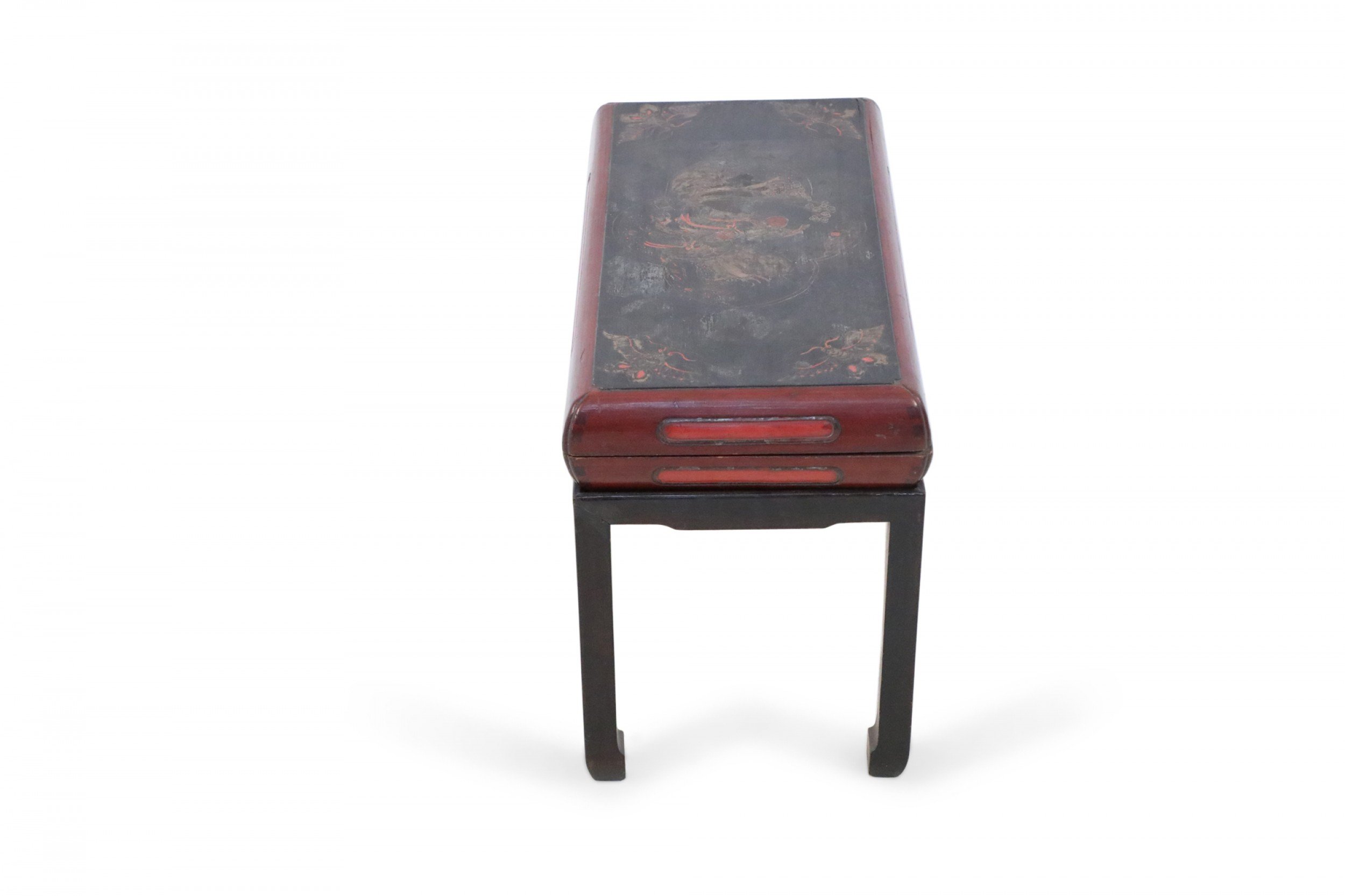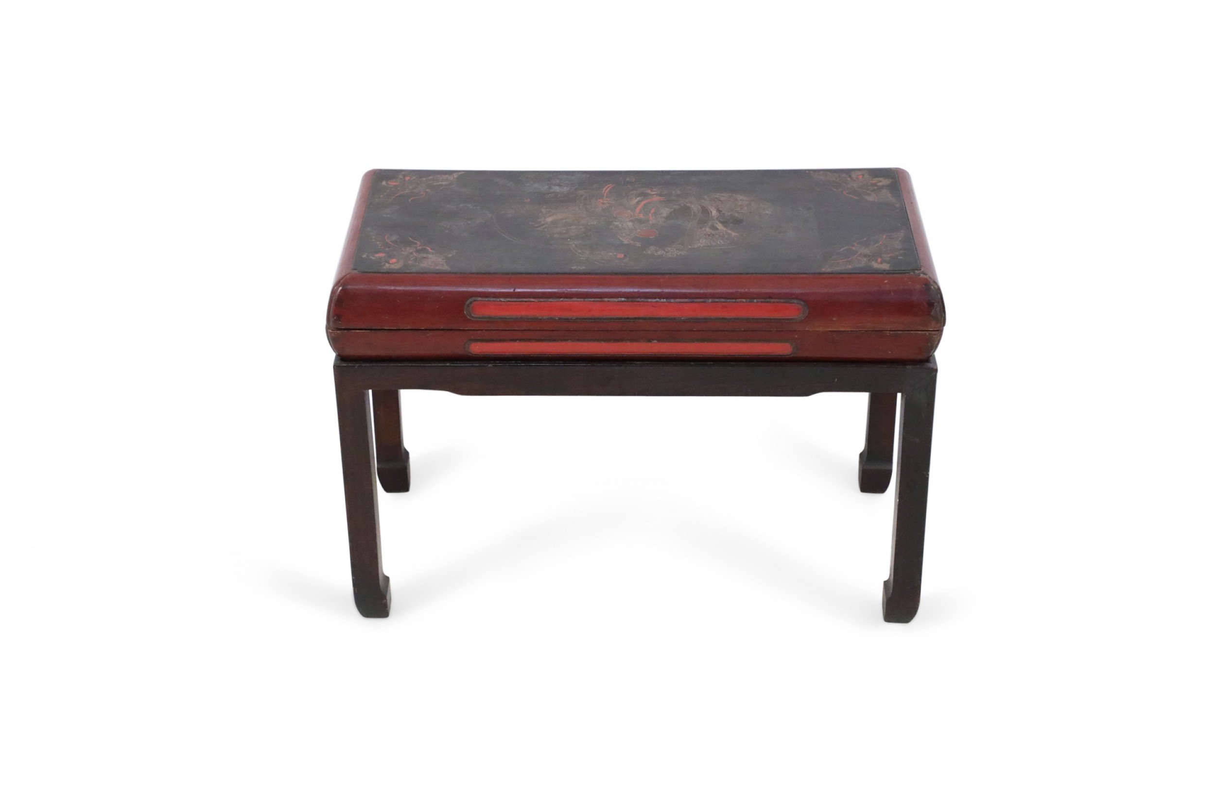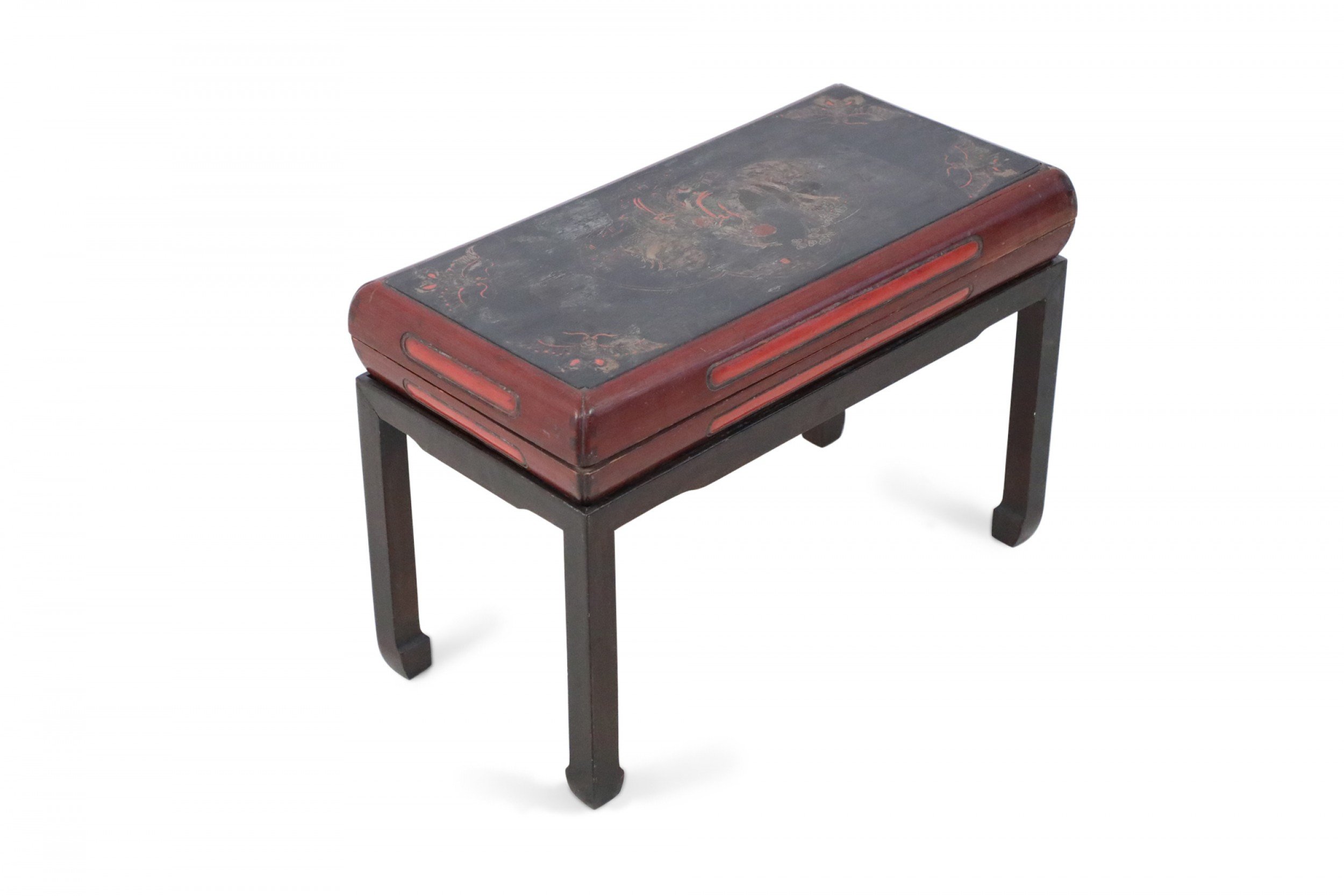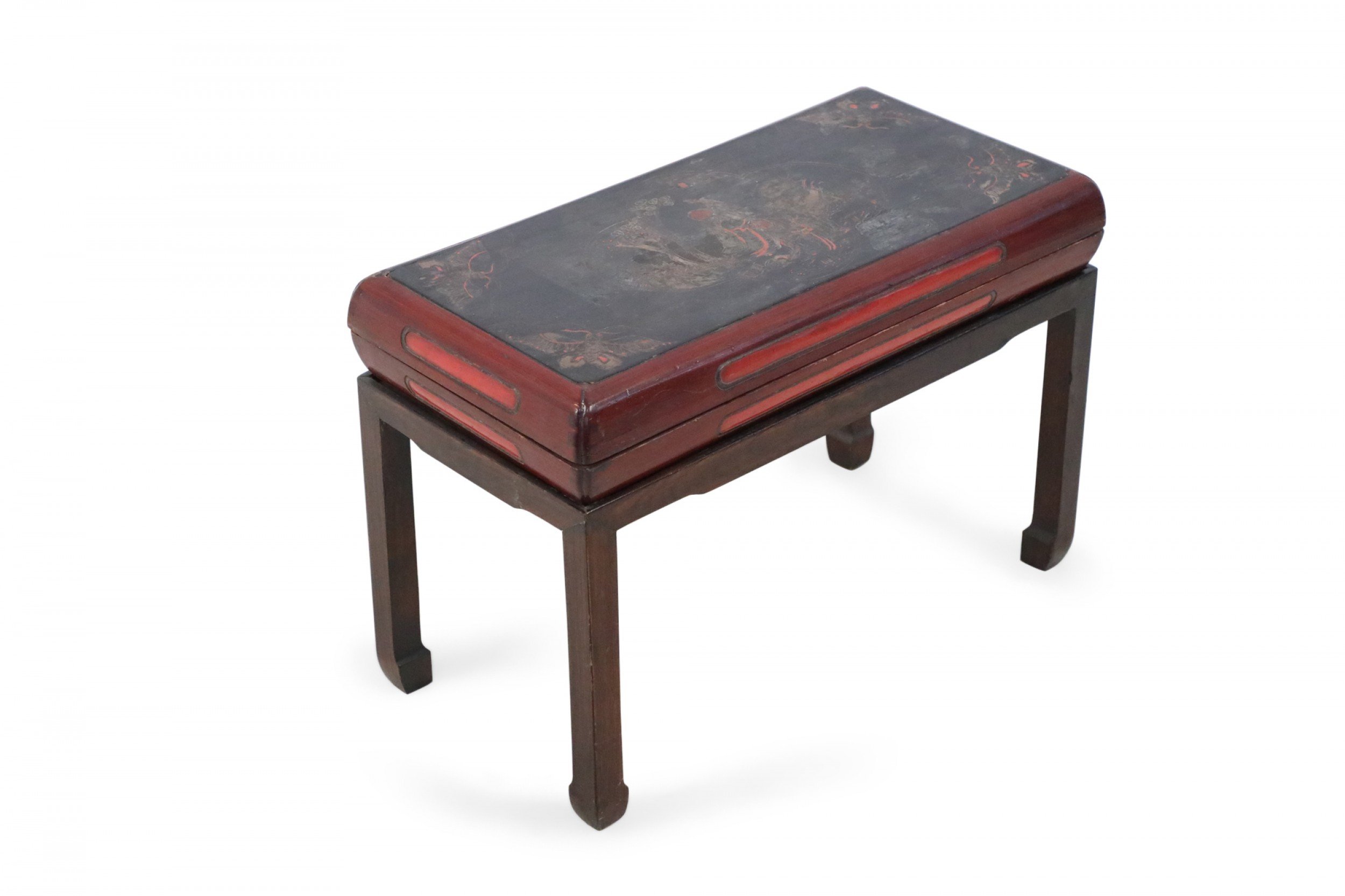 Antique Chinese (Early Republic) wooden bench with removeable, red-sided, black two-piece top painted in a gold and red central figurative scene and moths in each corner, supported by a wooden frame with square legs..