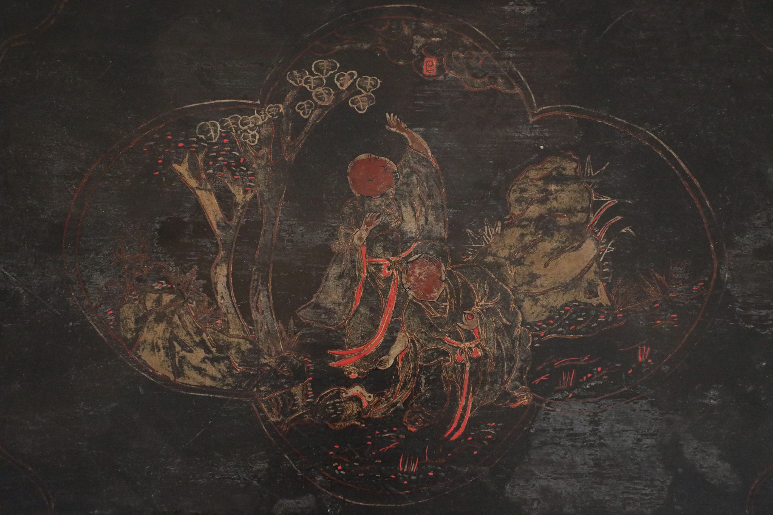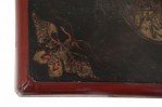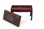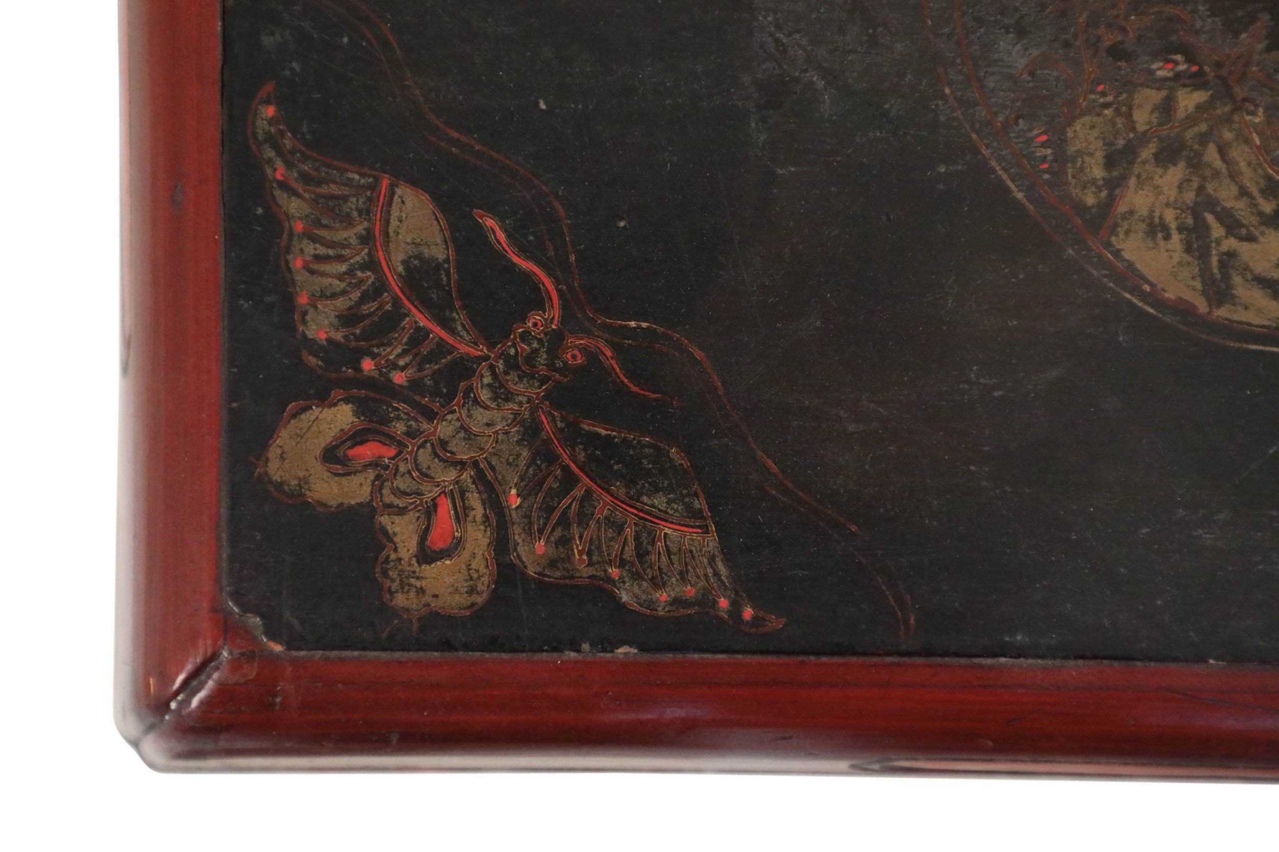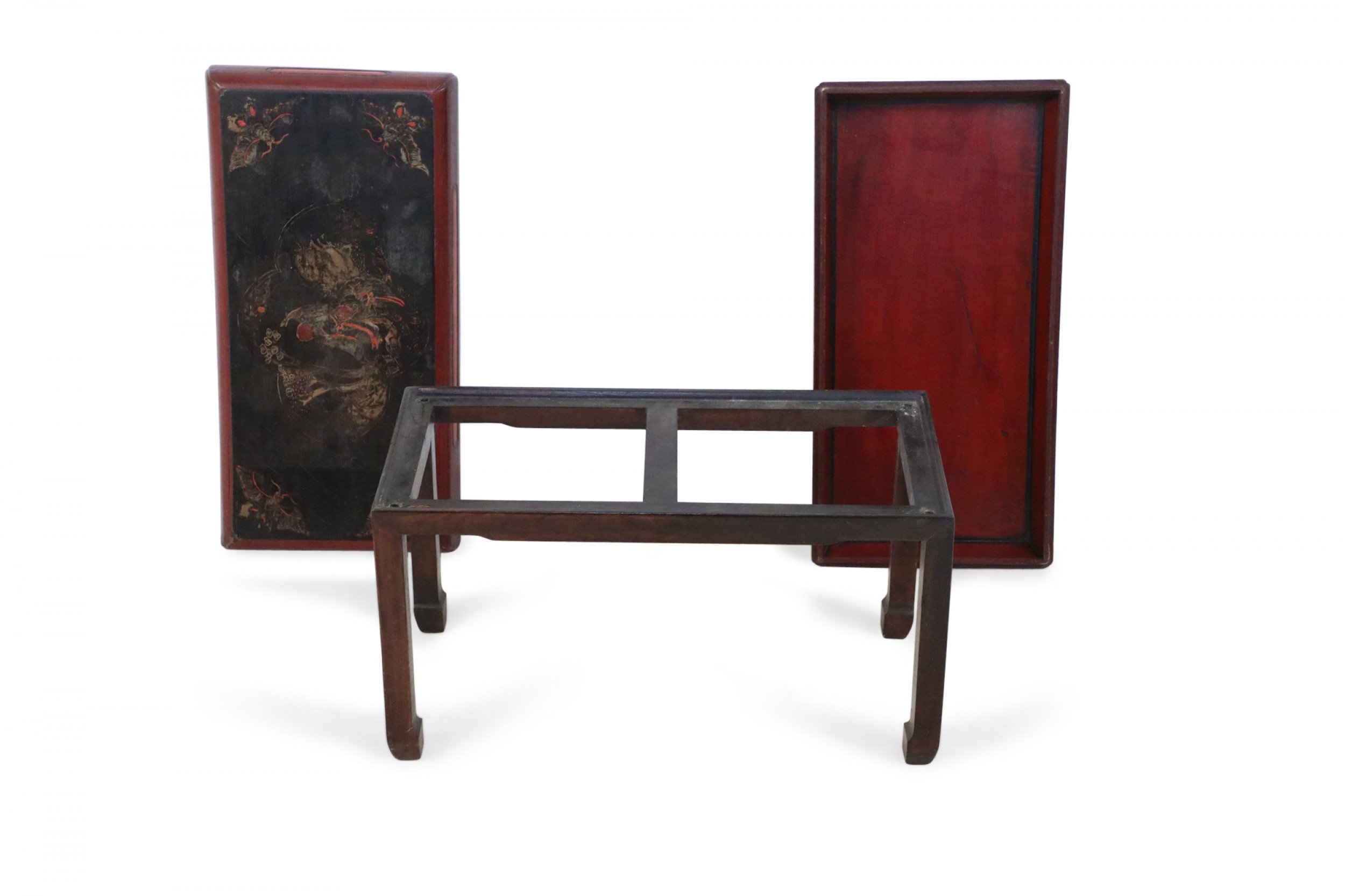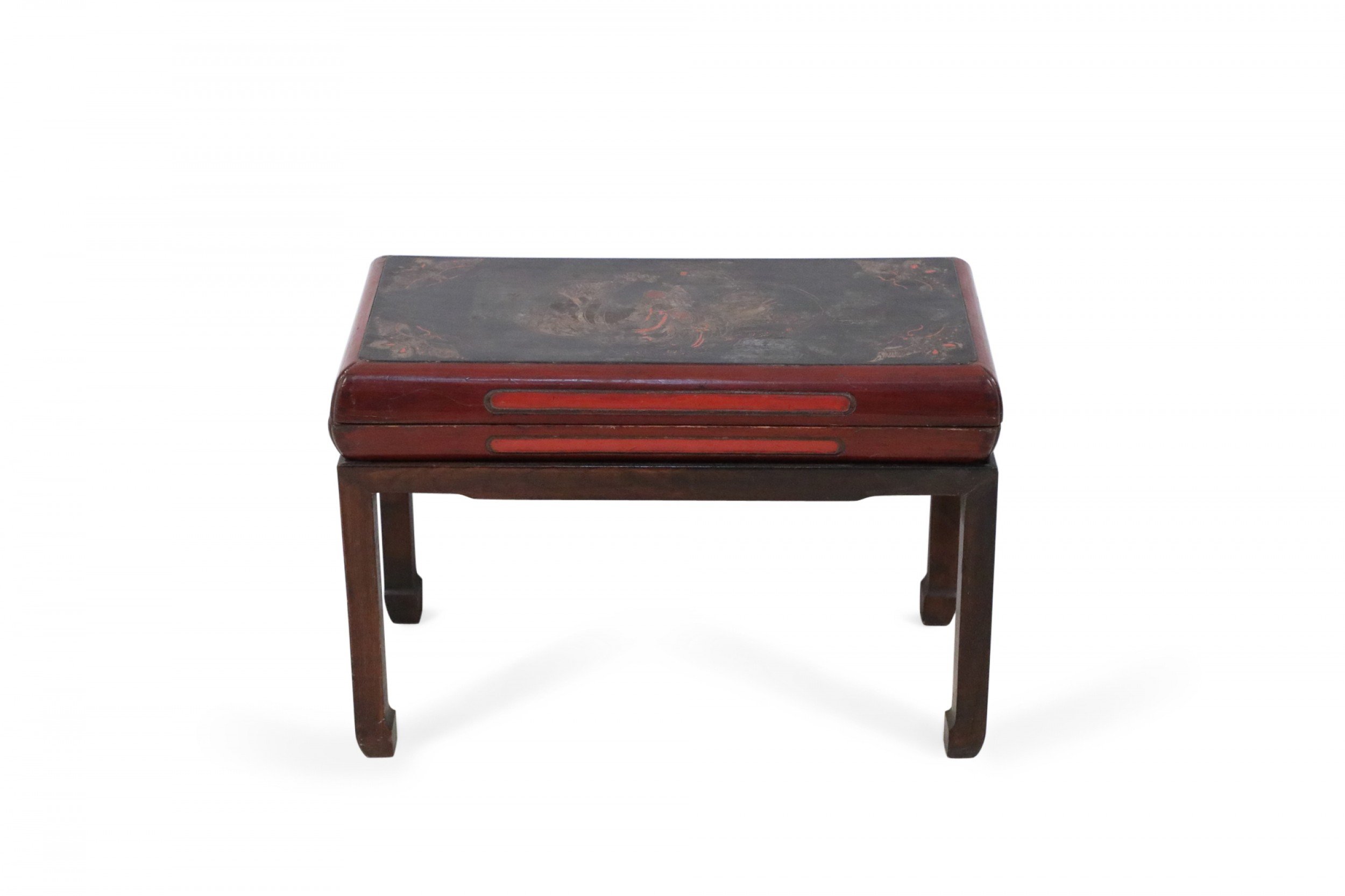 Antique Chinese (Early Republic) wooden bench with removeable, red-sided, black two-piece top painted in a gold and red central figurative scene and moths in each corner, supported by a wooden frame with square legs..