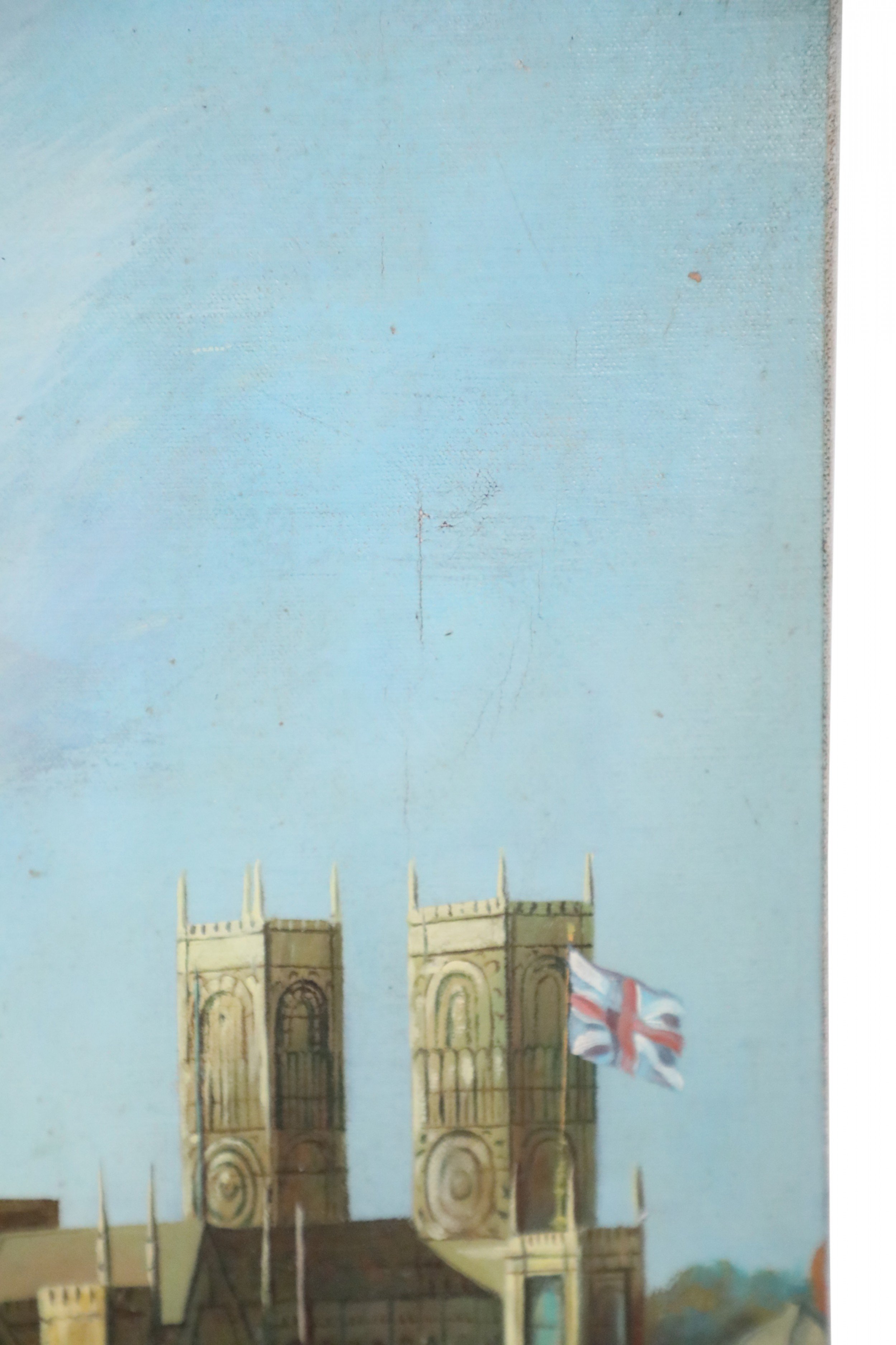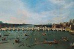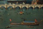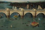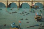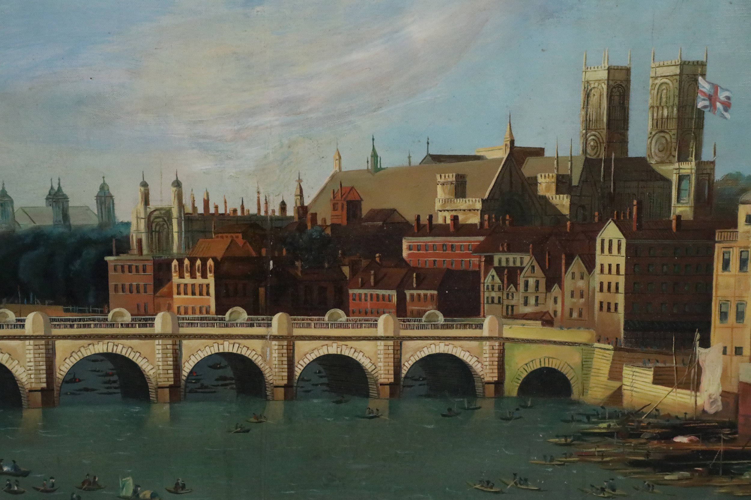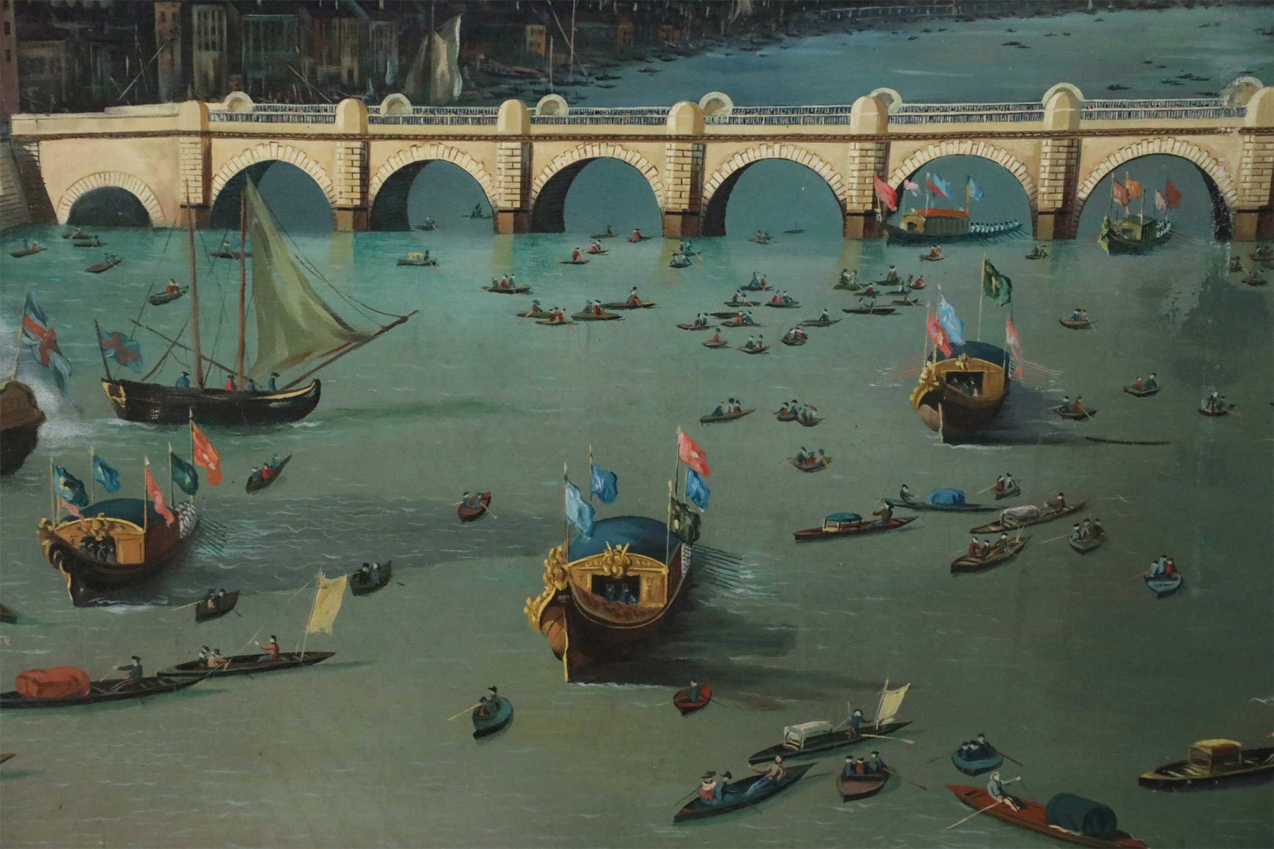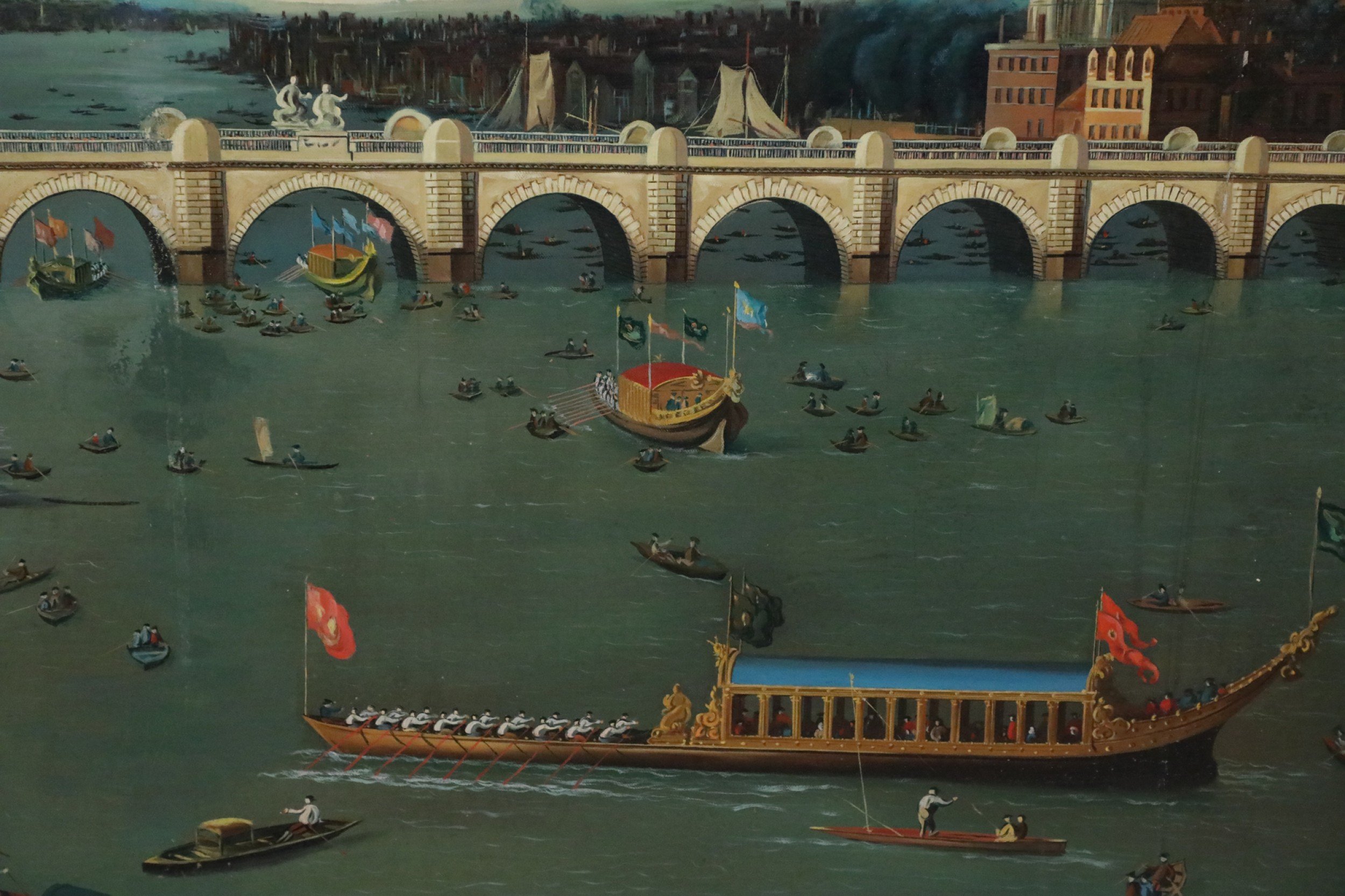 Italian Venetian-Style (20th Century) painting of a long, arched bridge stretching across a canal filled with boats and gondolas of all sizes, on unframed, rectangular canvas.