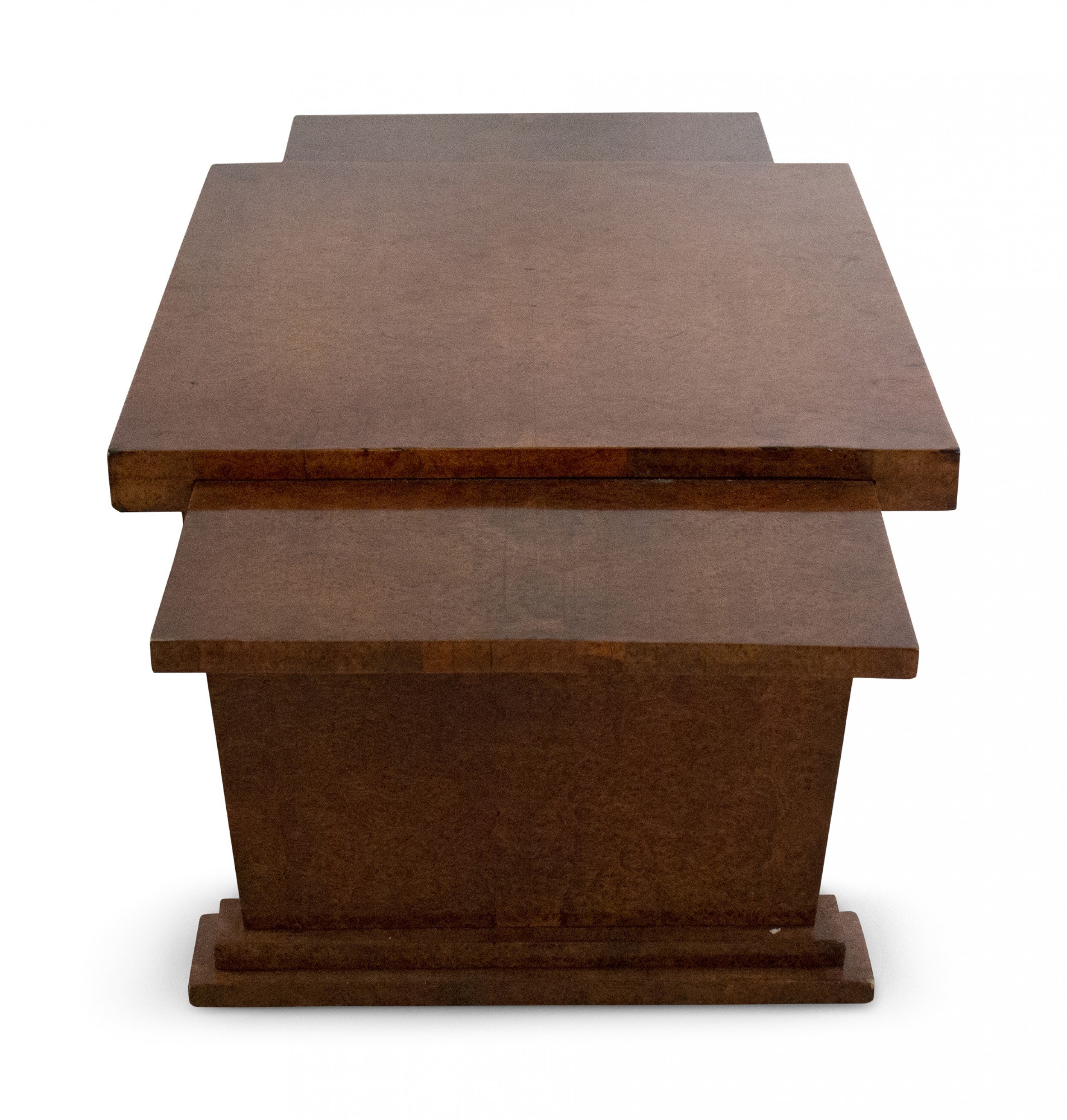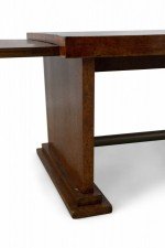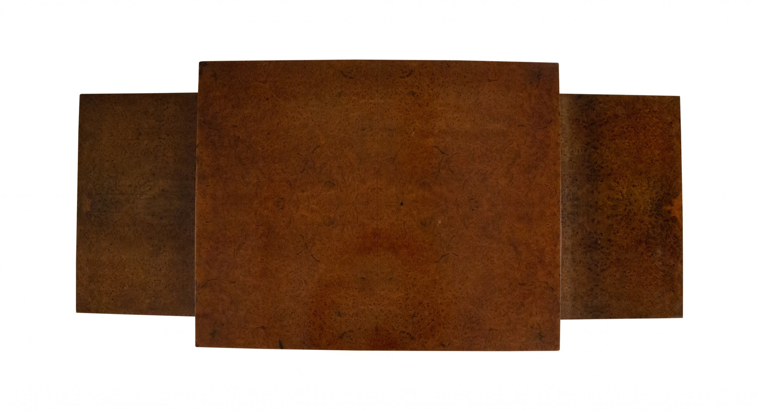American Art Deco Style burl wood coffee table with a raised center section and two slightly lower sides and a patinated bronze stretcher.
