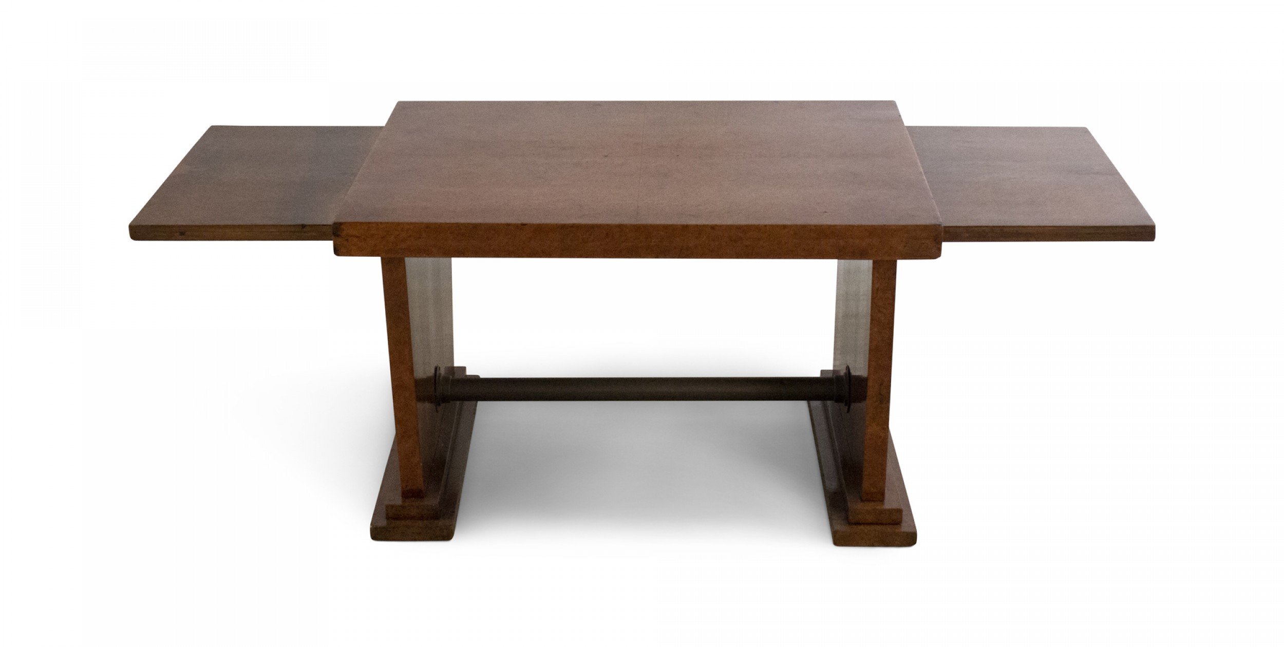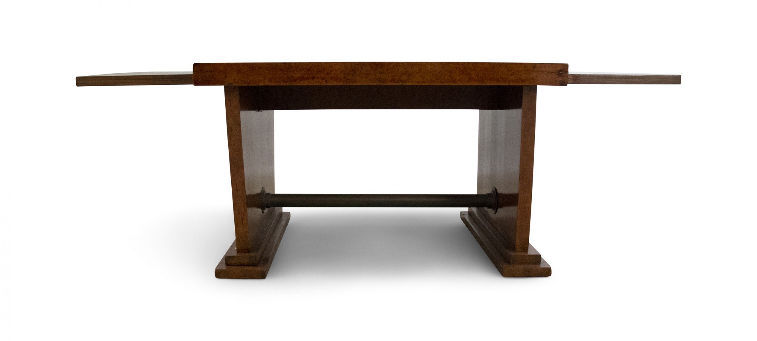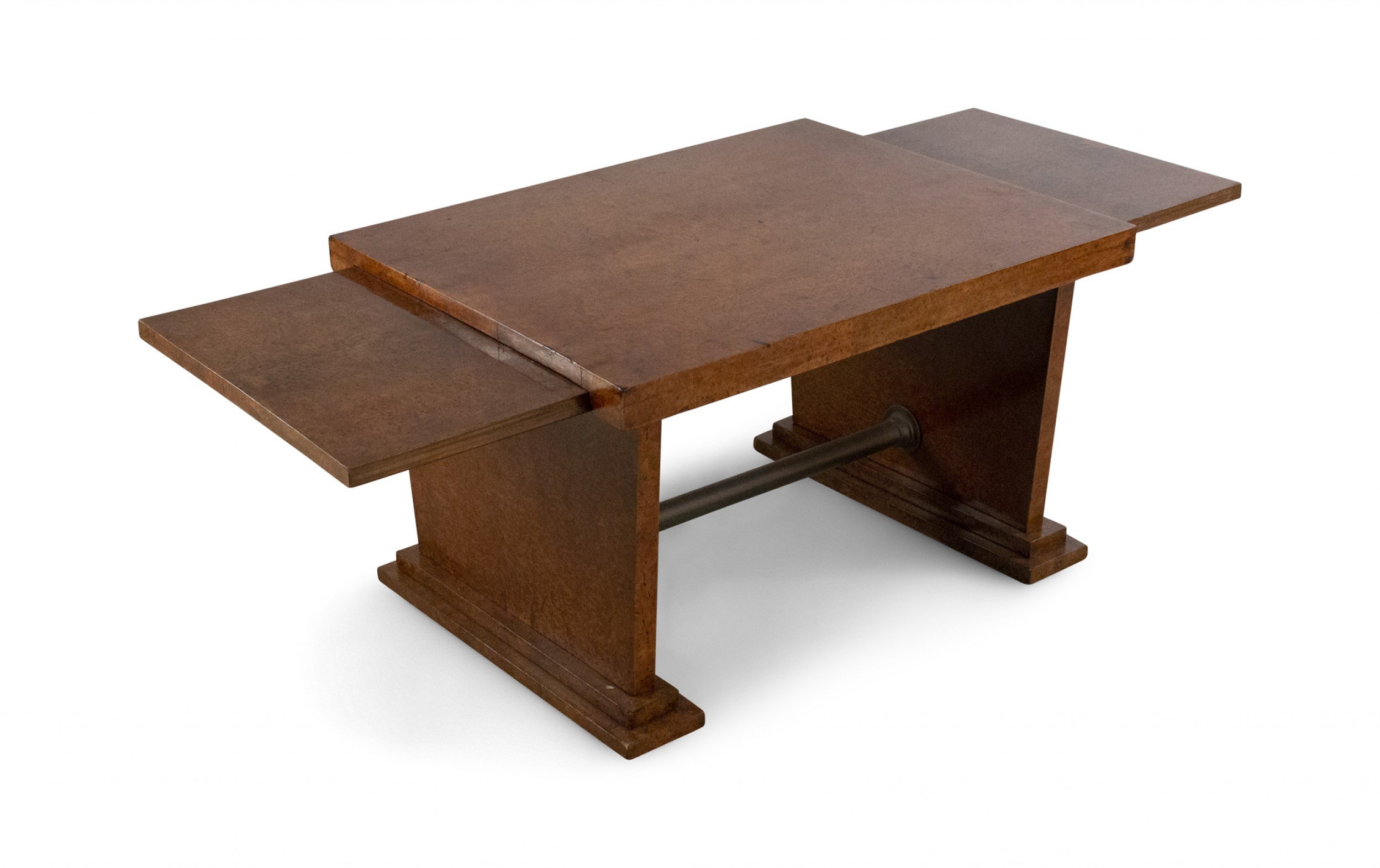 American Art Deco Style burl wood coffee table with a raised center section and two slightly lower sides and a patinated bronze stretcher..
