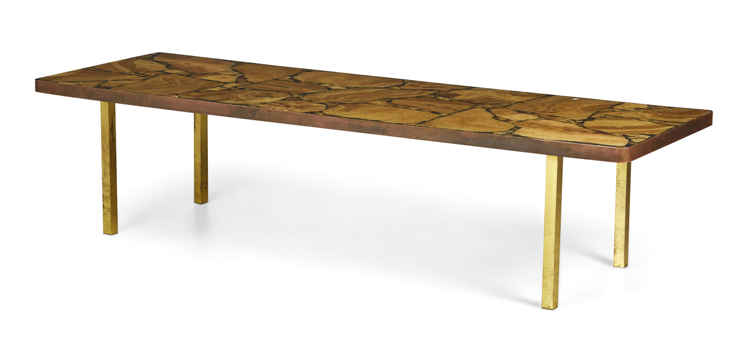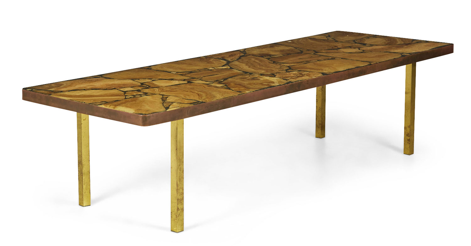 Style: Mid-Century Materials & Techniques: Brass, metal, resin, stone Category: Tables Condition: Large divot in resin table top. Good; Wear consistent with age and use