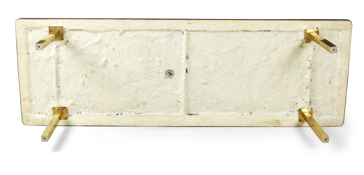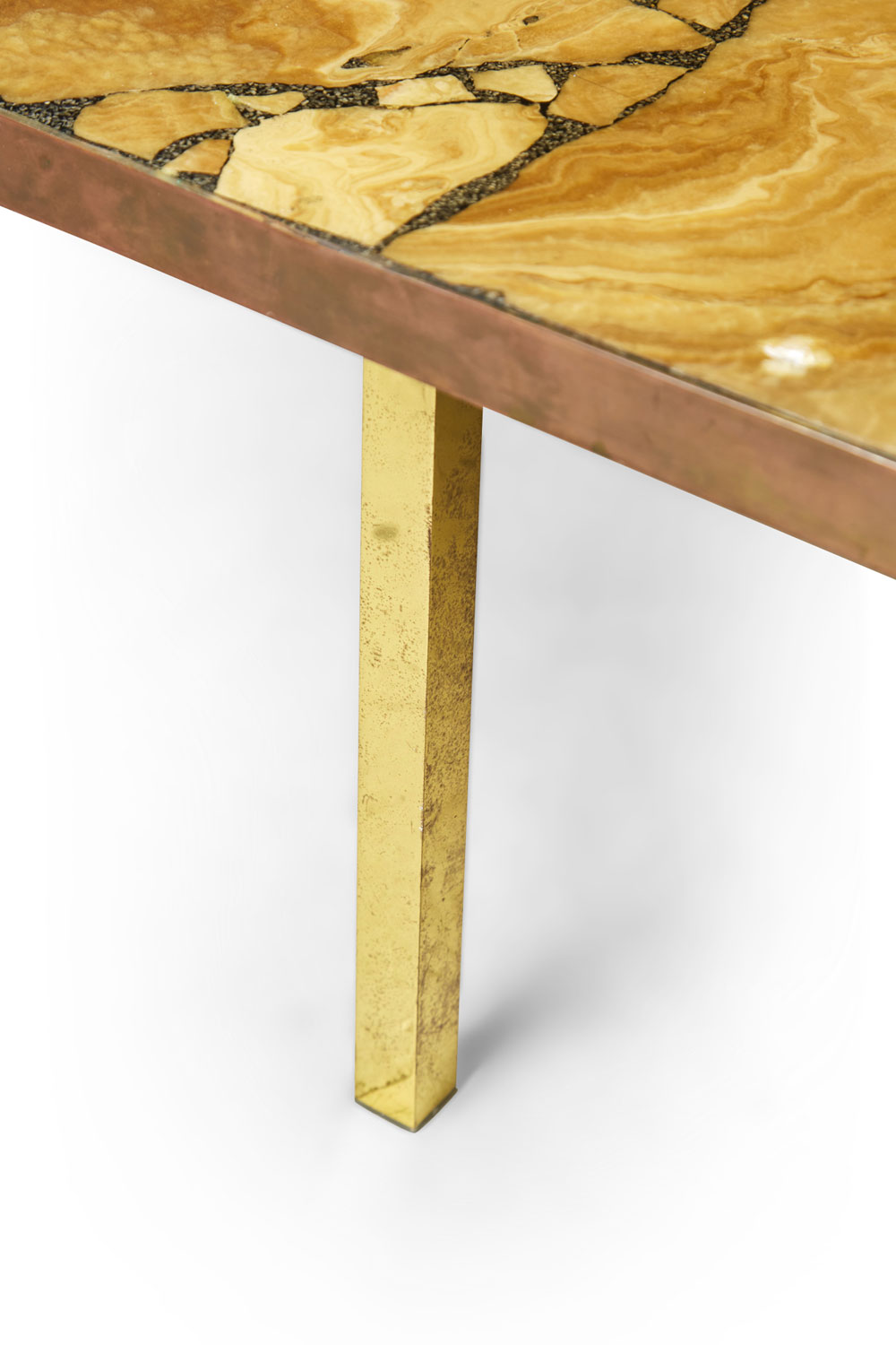 Mexican Mid-Century Modern (circa 1950) rectangular coffee table with an onyx stone and resin top resting on four square brass legs. (ARTURO PANI FOR MULLER OF MEXICO)