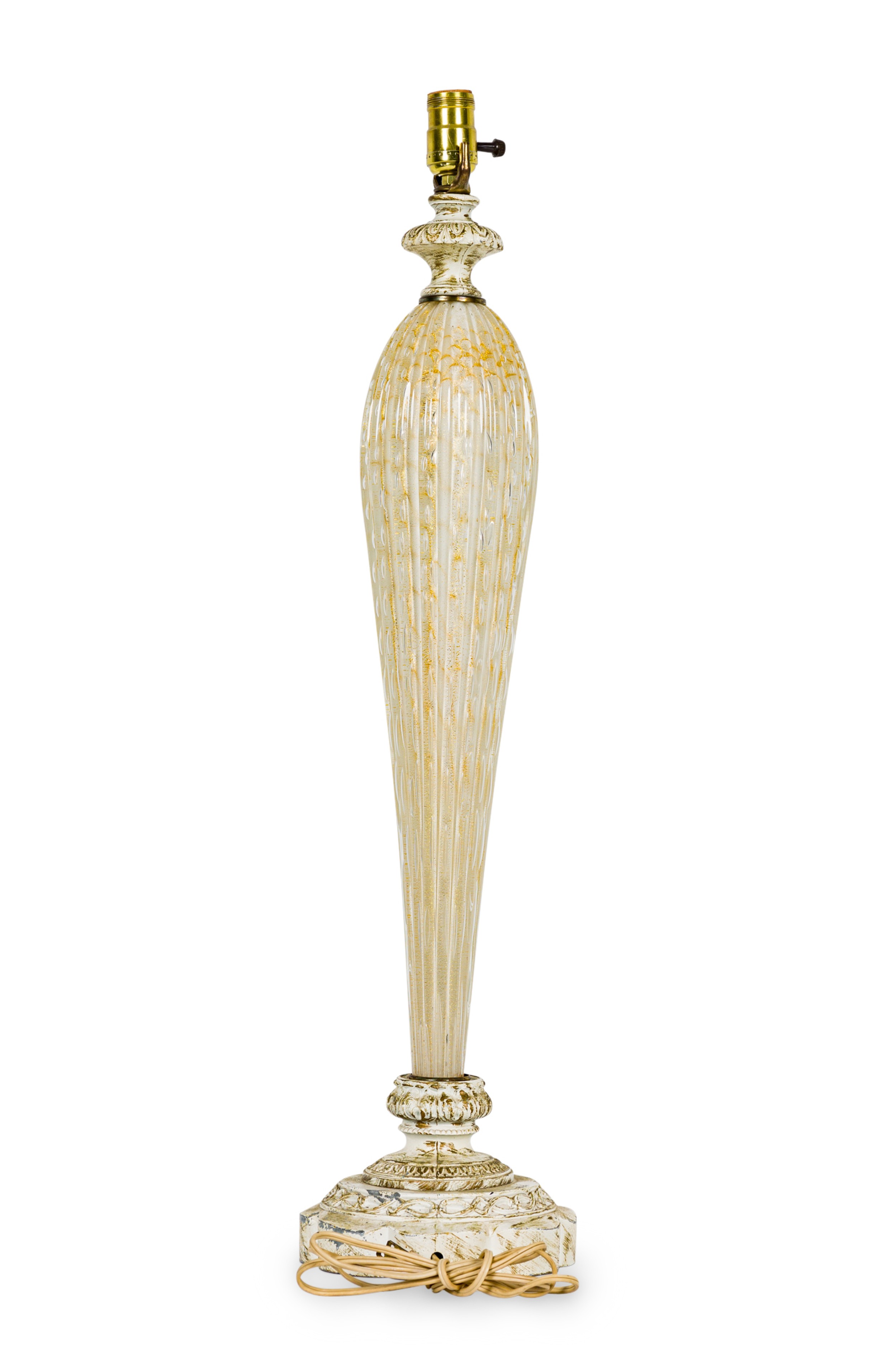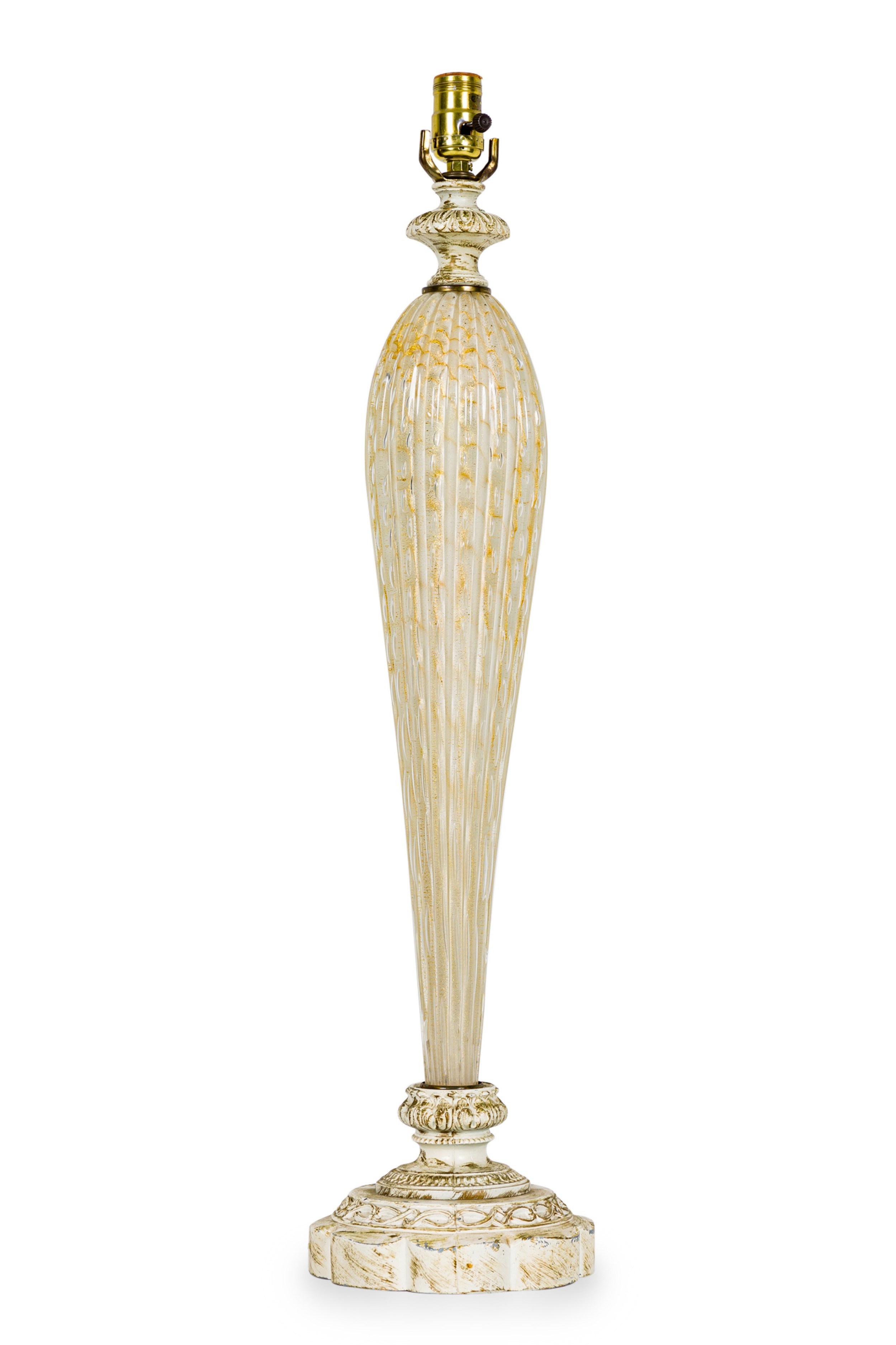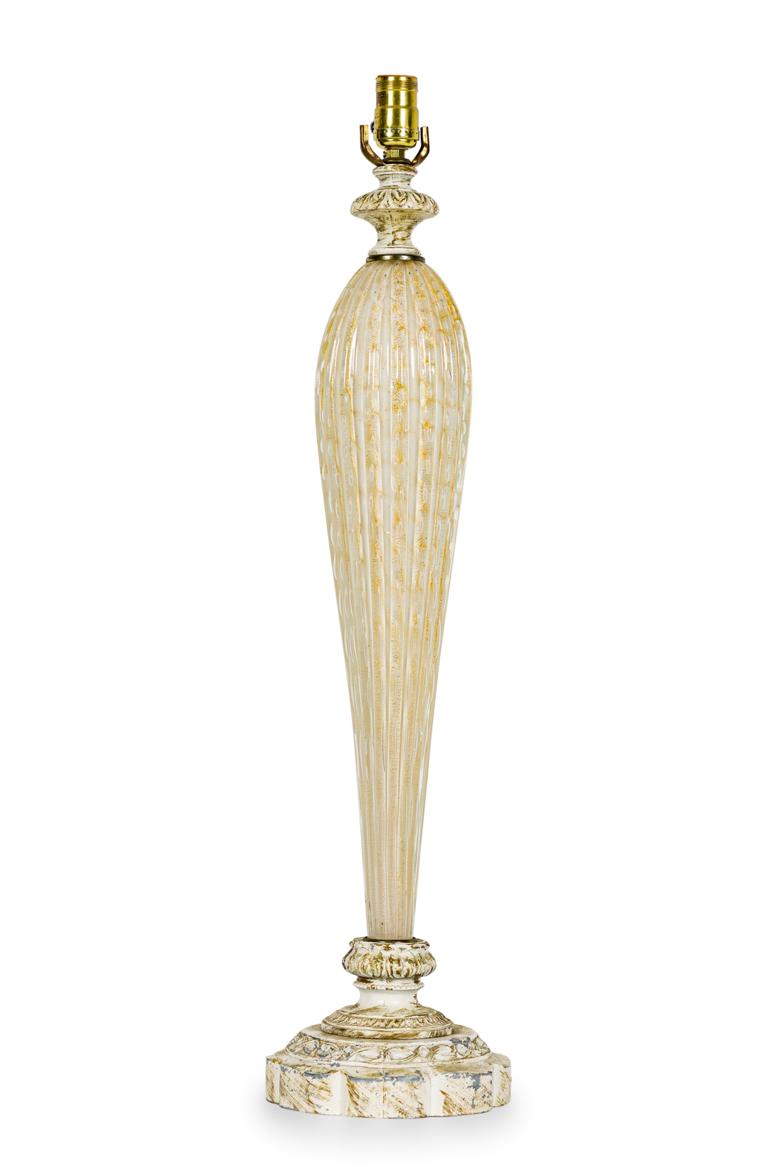 Italian Mid-Century Murano glass table lamp featuring gold fleck and bubble throughout hand made glass atop a round painted base (BAROVIER & TOSO).