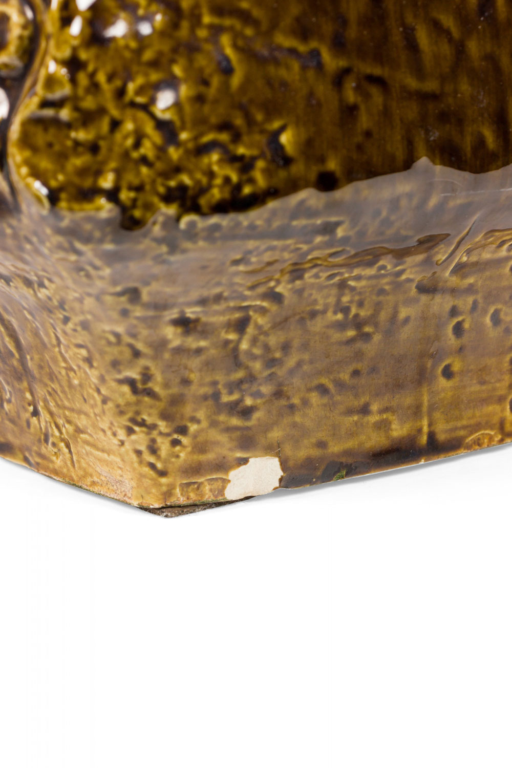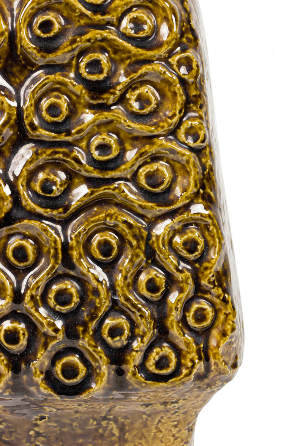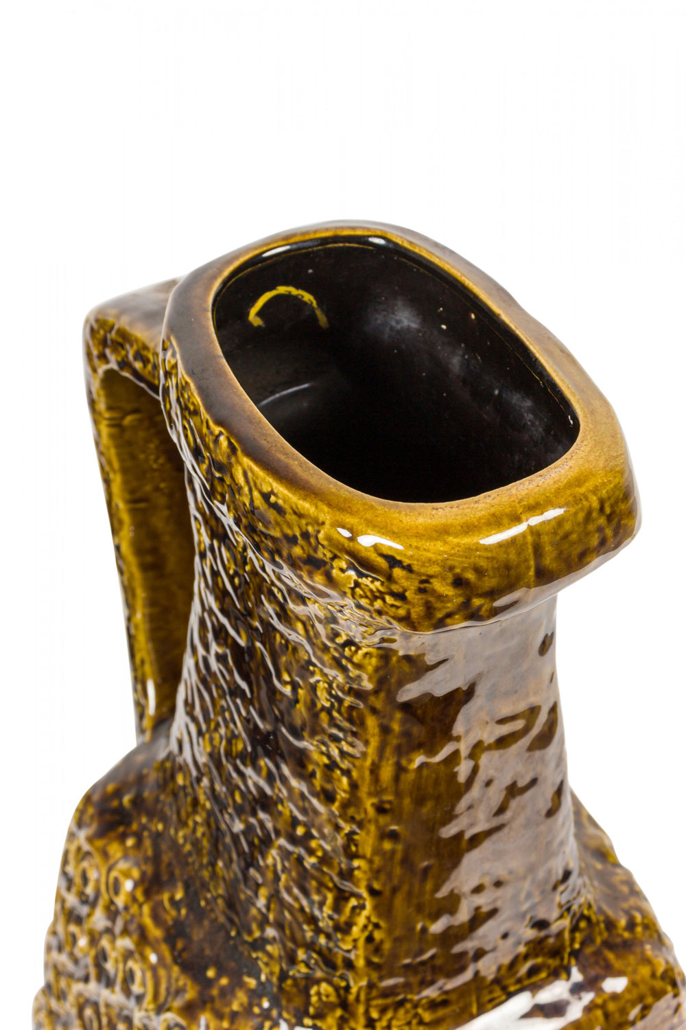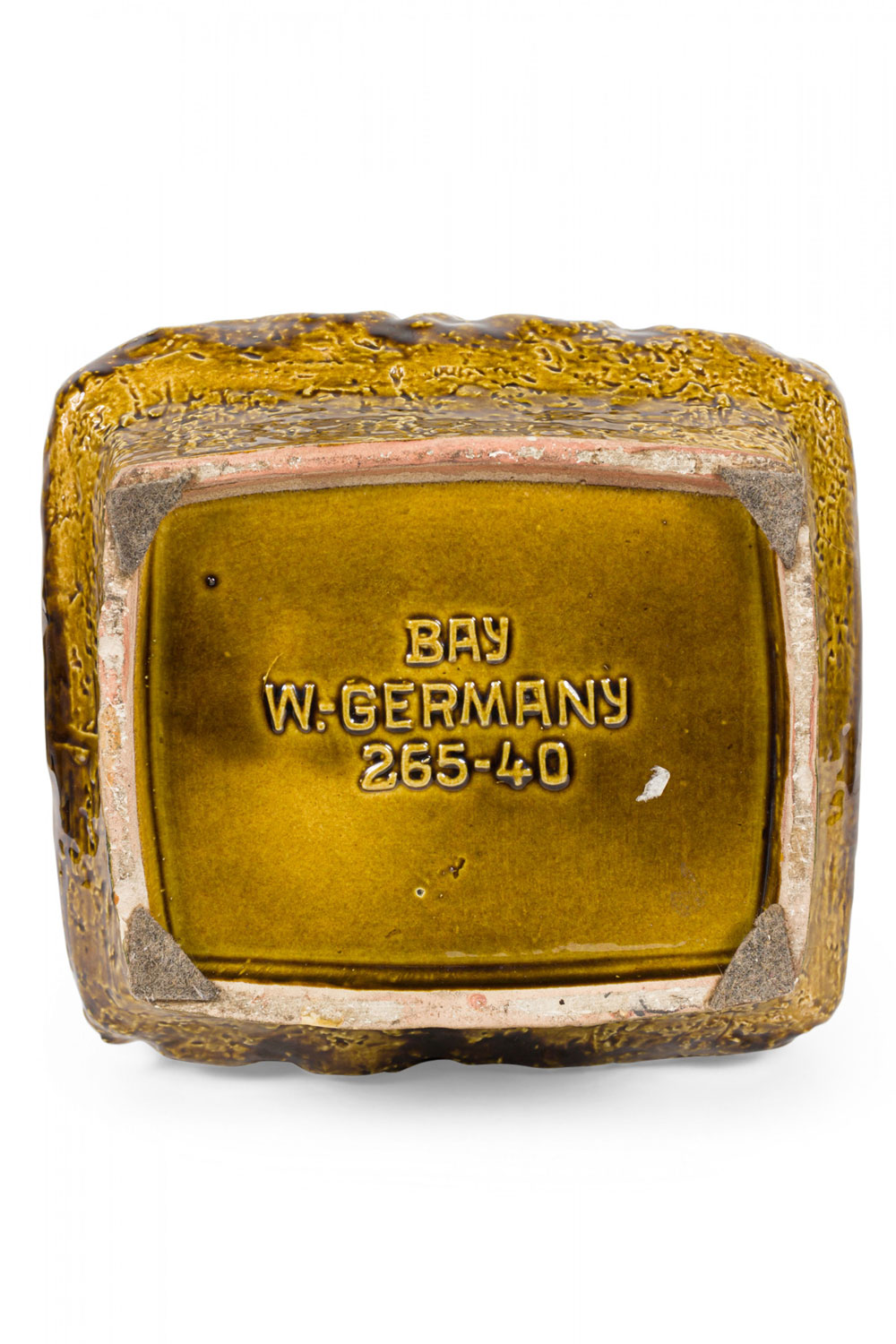 West German Mid-Century square base handled ceramic vase with a raised abstract nesting circle design around the base and a mottle black and yellow glaze. (BAY KERAMIK, mark on bottom, BAY W. GERMANY 265-40).