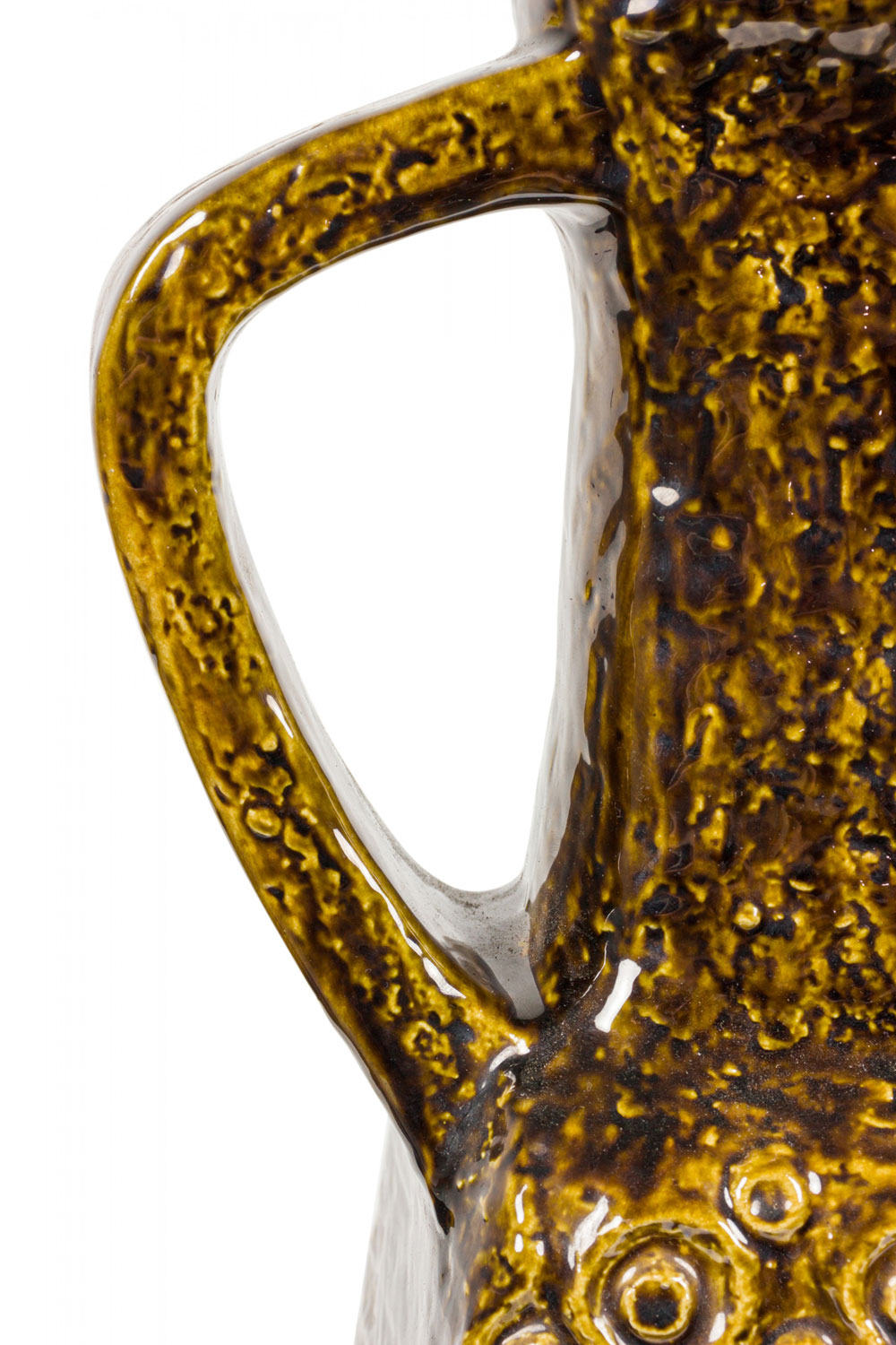 West German Mid-Century square base handled ceramic vase with a raised abstract nesting circle design around the base and a mottle black and yellow glaze. (BAY KERAMIK, mark on bottom, BAY W. GERMANY 265-40)