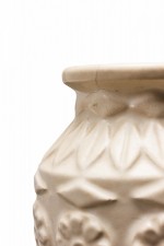 West German Mid-Century urn-form white ceramic vase with a raised banded flower pattern around the body and a raised banded leaf pattern around the top. (mark on bottom, BAY W. GERMANY)