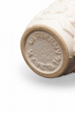 West German Mid-Century urn-form white ceramic vase with a raised banded flower pattern around the body and a raised banded leaf pattern around the top. (mark on bottom, BAY W. GERMANY).