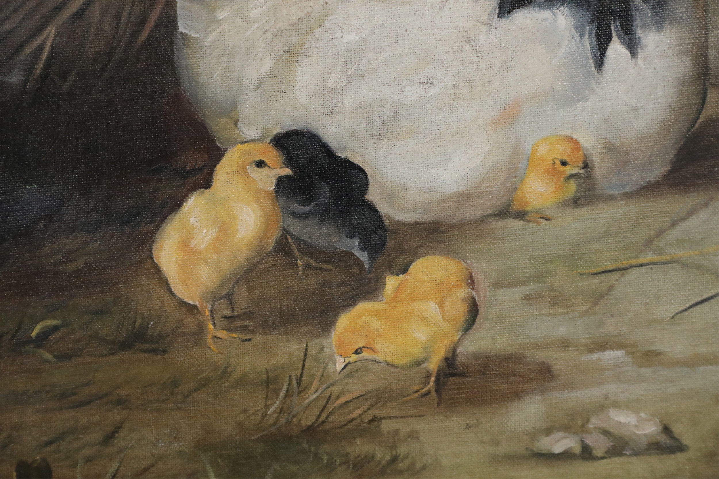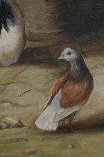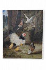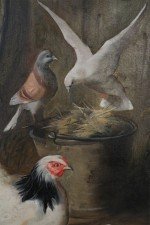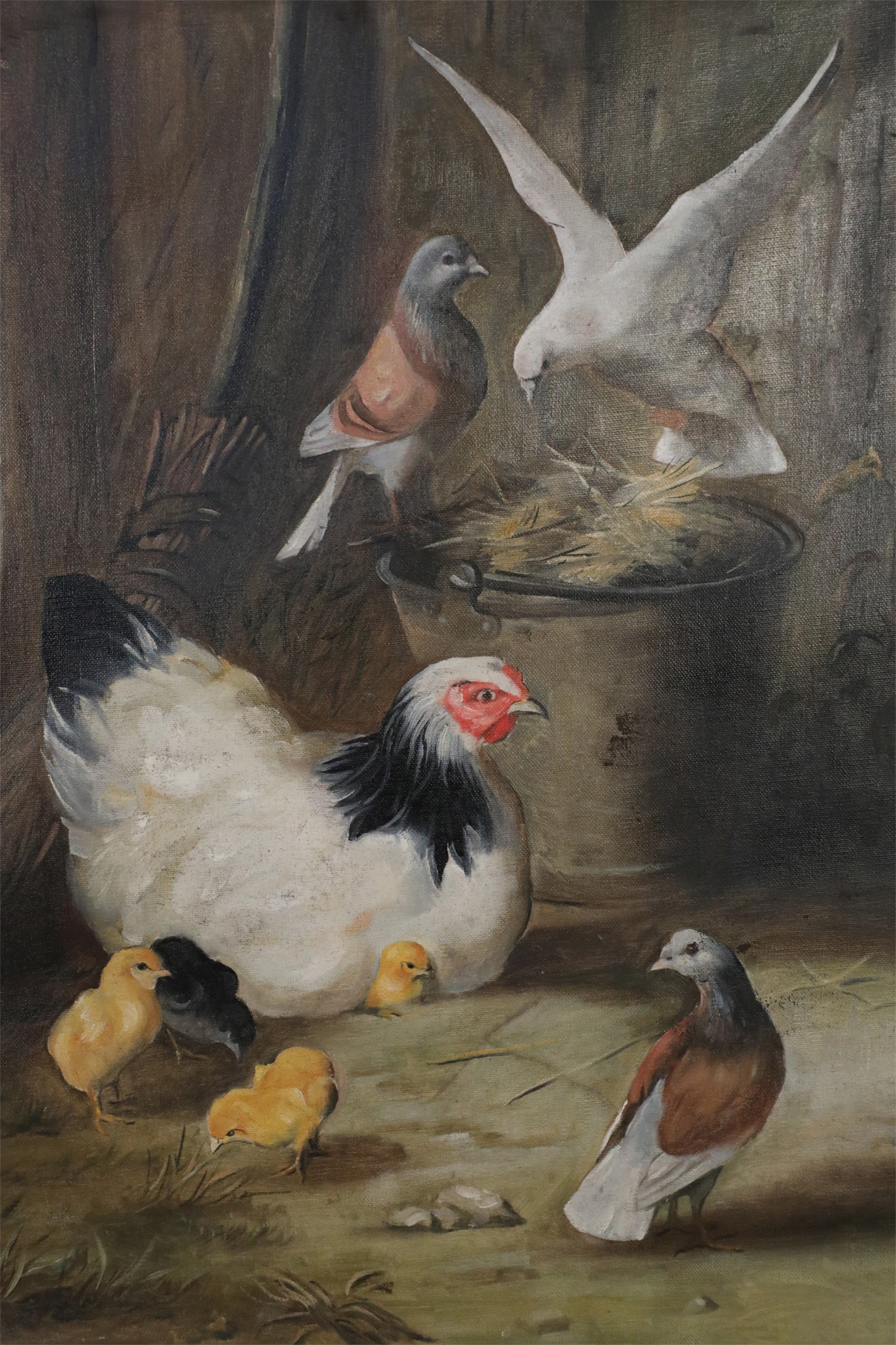 English Victorian style (20th Century) oil painting depicting varied fowl, including chickens, chicks, pigeons and doves, pecking straw from both the ground and a bucket, on rectangular unframed canvas (Similar copy of same painting with minor variations: NWL2252B).