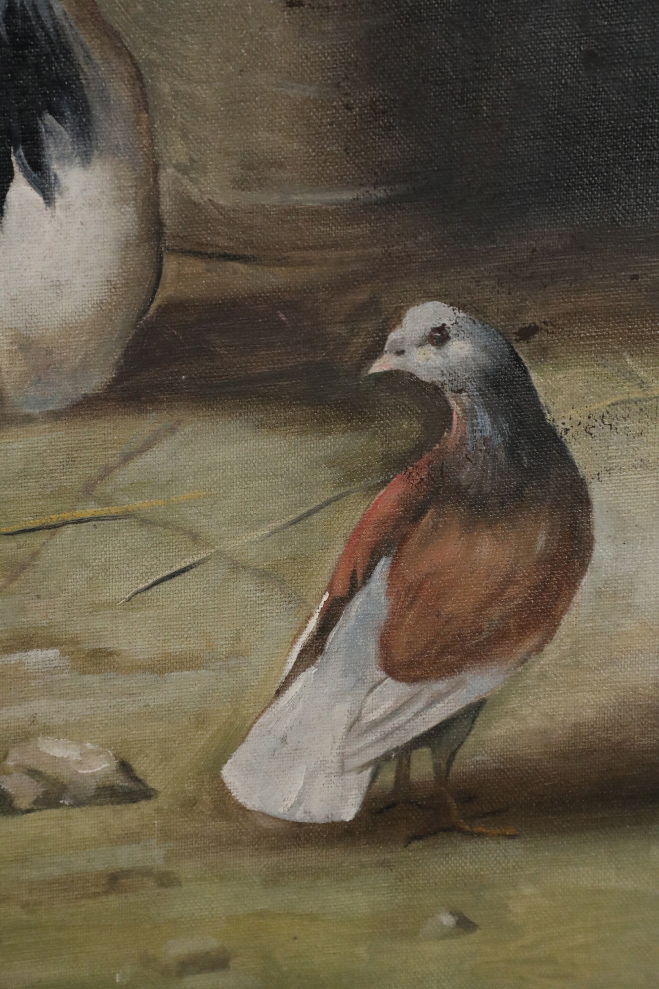 English Victorian style (20th Century) oil painting depicting varied fowl, including chickens, chicks, pigeons and doves, pecking straw from both the ground and a bucket, on rectangular unframed canvas (Similar copy of same painting with minor variations: NWL2252B)..