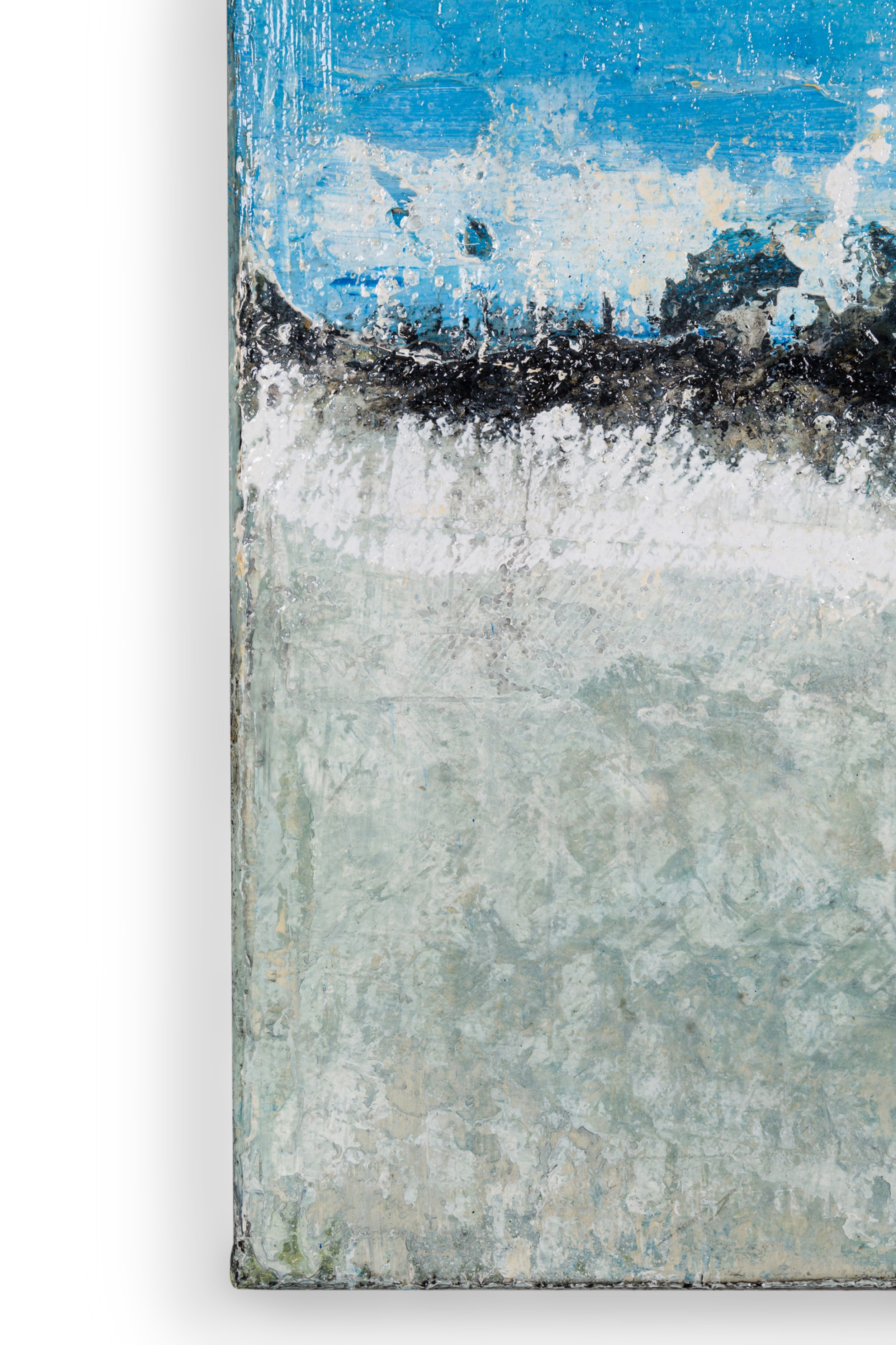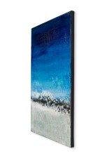 American Contemporary mixed media artwork featuring a black painted line dividing horizontally between an upper blue gradient and lower grey portion (BRAD ROBERTSON).