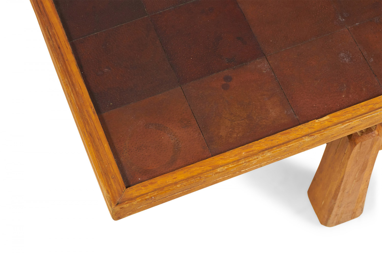 American Mid-Century Rustic (circa 1950) rectangular oak coffee table with a brown leather patchwork tabletop resting on four rustic legs with a stretcher base. (BRANDT RANCH OAK, TEXAS).
