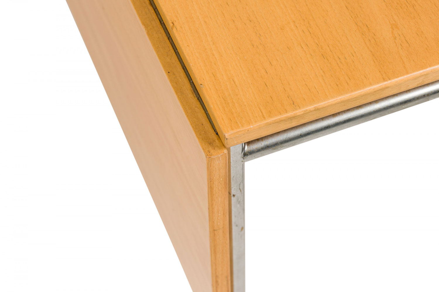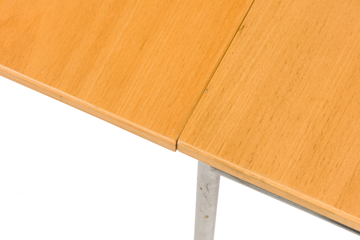Swedish Mid-Century rectangular drop leaf work table with a rectangular wooden top and leaves resting on a steel frame with four legs ending in casters. (BRUNO MATHSSON)