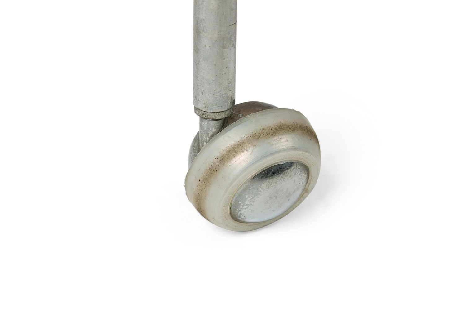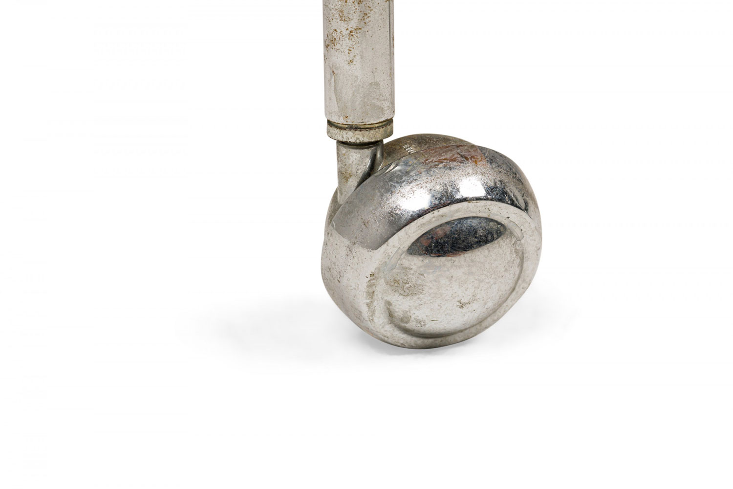 Style: Mid-Century Materials & Techniques: Metal, steel, wood Category: Tables Condition: Cart has 2 different types of castersnnCart with both leaves opennn37" widen31.5" longn25" high Good; Wear consistent with age and use