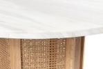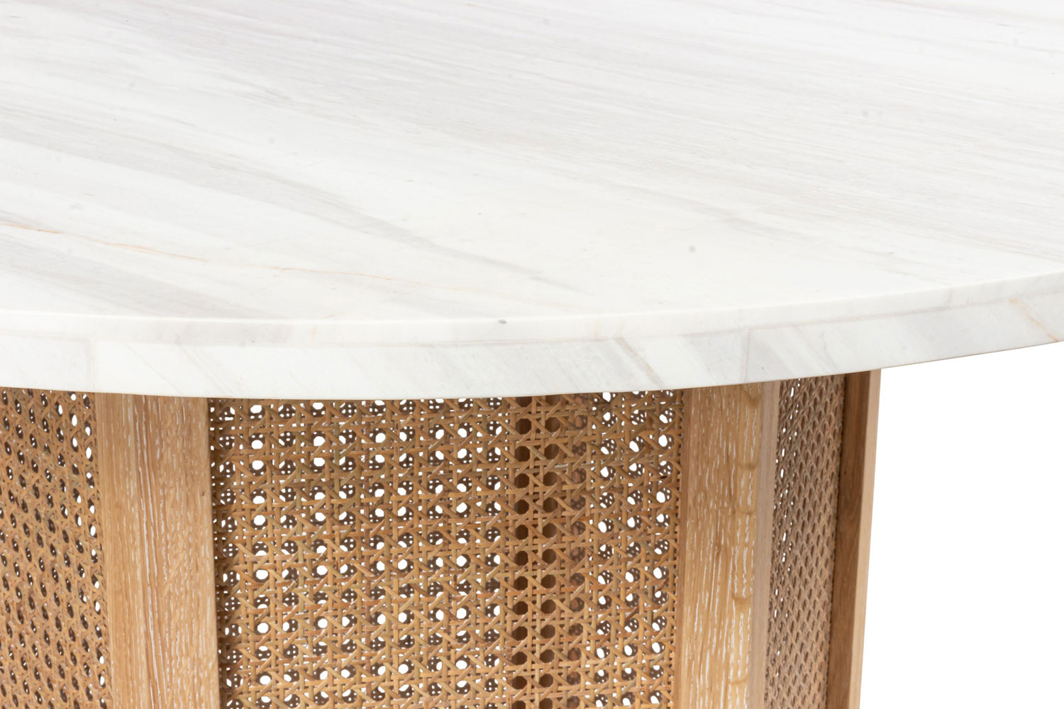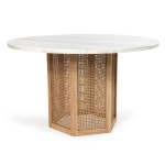 Contemporary center /dining table supported on a 6 sided cerused oak pedestal base with cane panels supporting a round white marble veneer top.