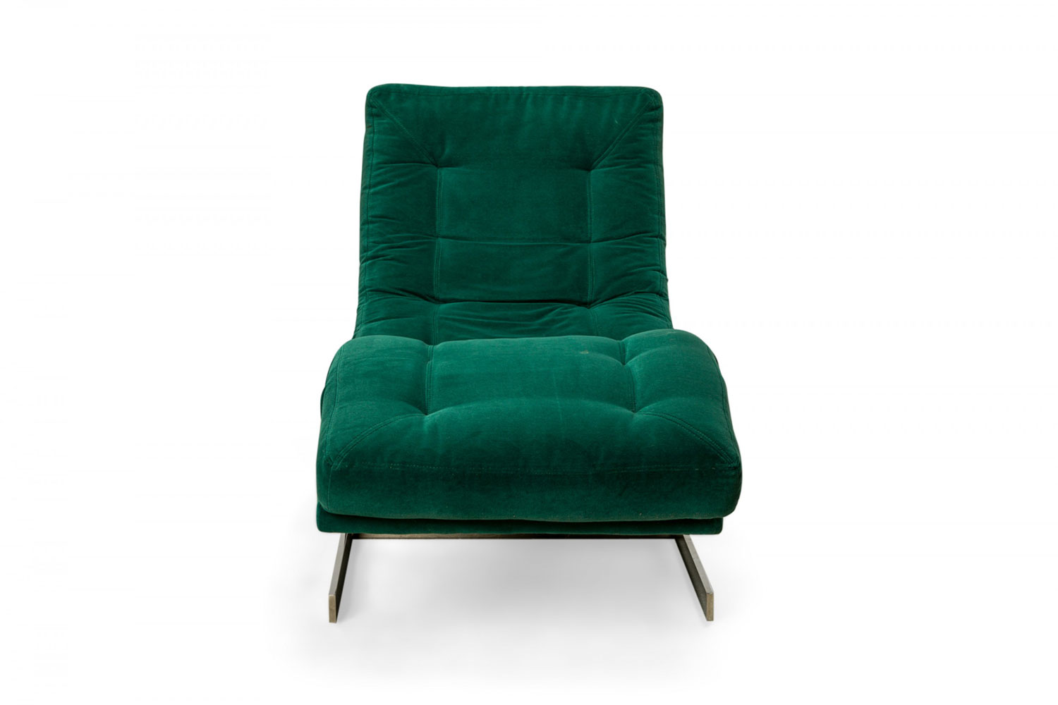 American Mid-Century 'wave' form chaise lounge with deep green velour button tufted upholstery with a T-shaped polished chrome base. (CARSONS)(Available in different upholstery: DUF0351, DUF0352, DUF0353)